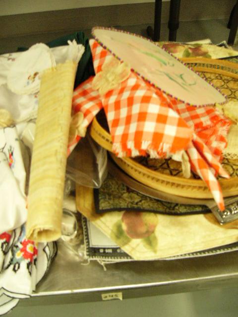 Lot of table linens: white napkins with cross stitch flowers, green napkins, place mats, napkin holders, etc. (168)