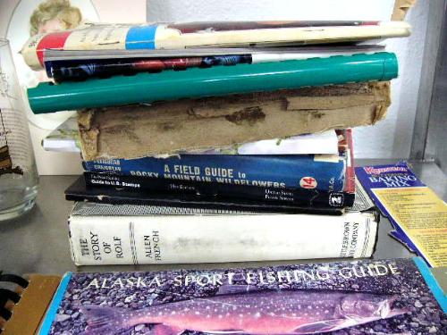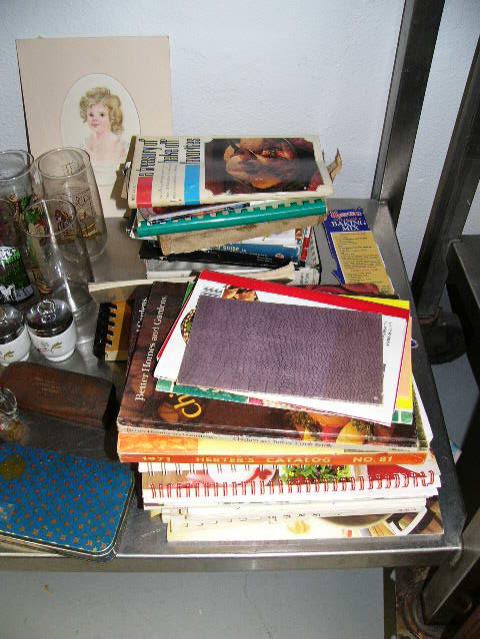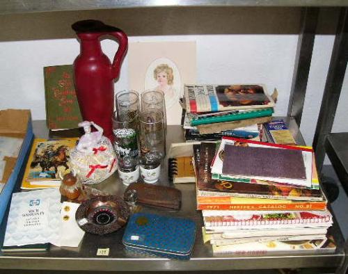 Lot of: various cookbooks; assorted books with a book entitled "The Prodigal Son" by Hall Caine which has a Copyright in 1904 and published in November 1904; 4 glasses; 1 water jar; etc. (2)