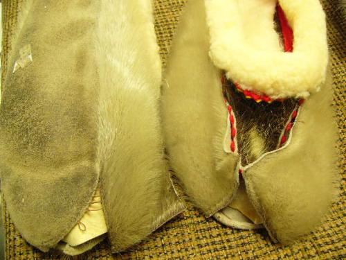 Lot of: wood mask with fur trim, fur slippers and doll with fur parka and pants (159)