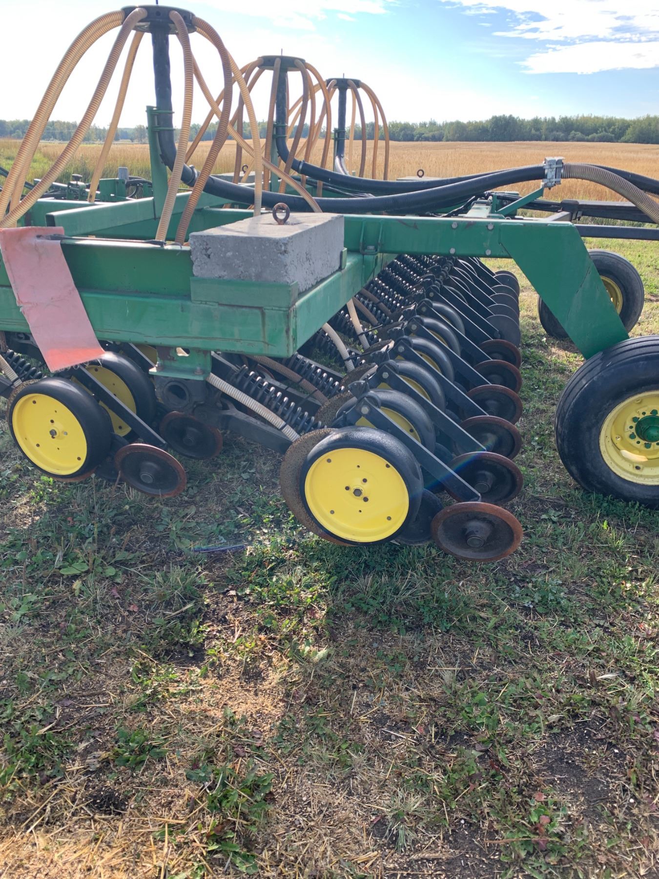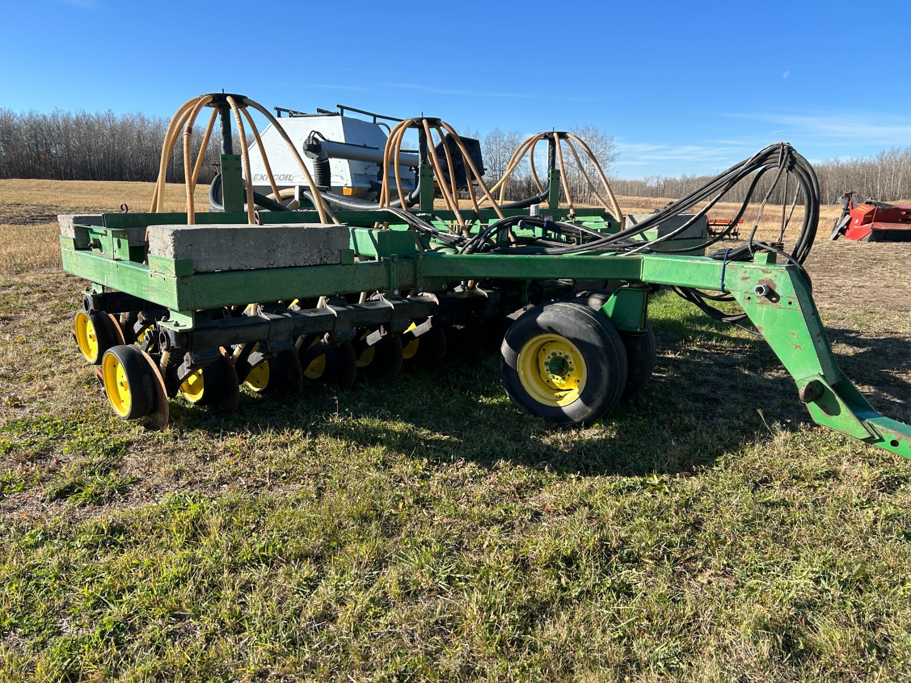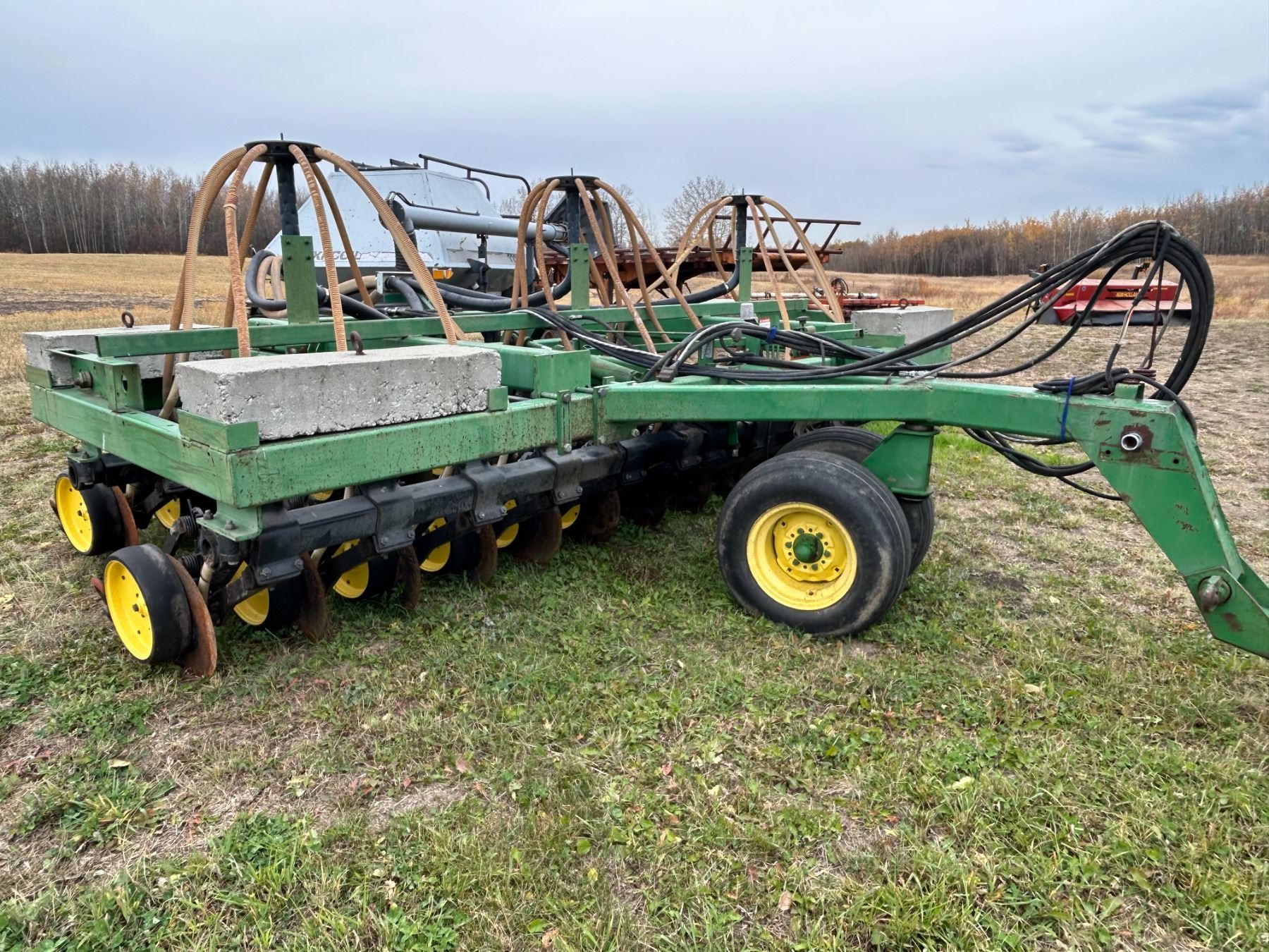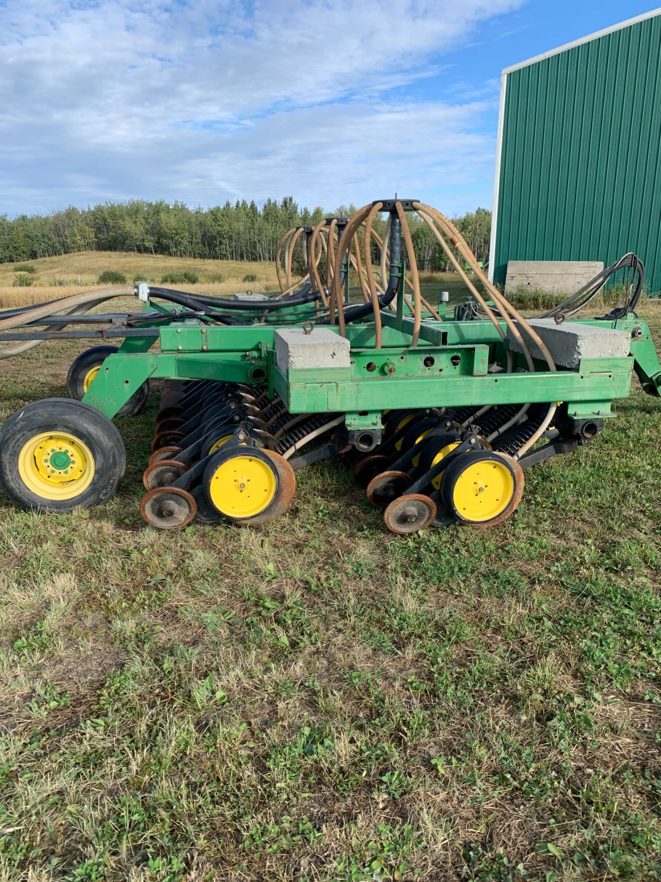 (Lot #s 278 & 279 are a Group Lot) HARD TO FIND. JD 750 15 ft No-Till single disc drill, newer bearings and packer wheels, 60/40 split, was mated to a Flexicoil 1110 tow behind drill, S/N N00750X004091. BUY THE CART & YOU'LL BE READY TO GO!