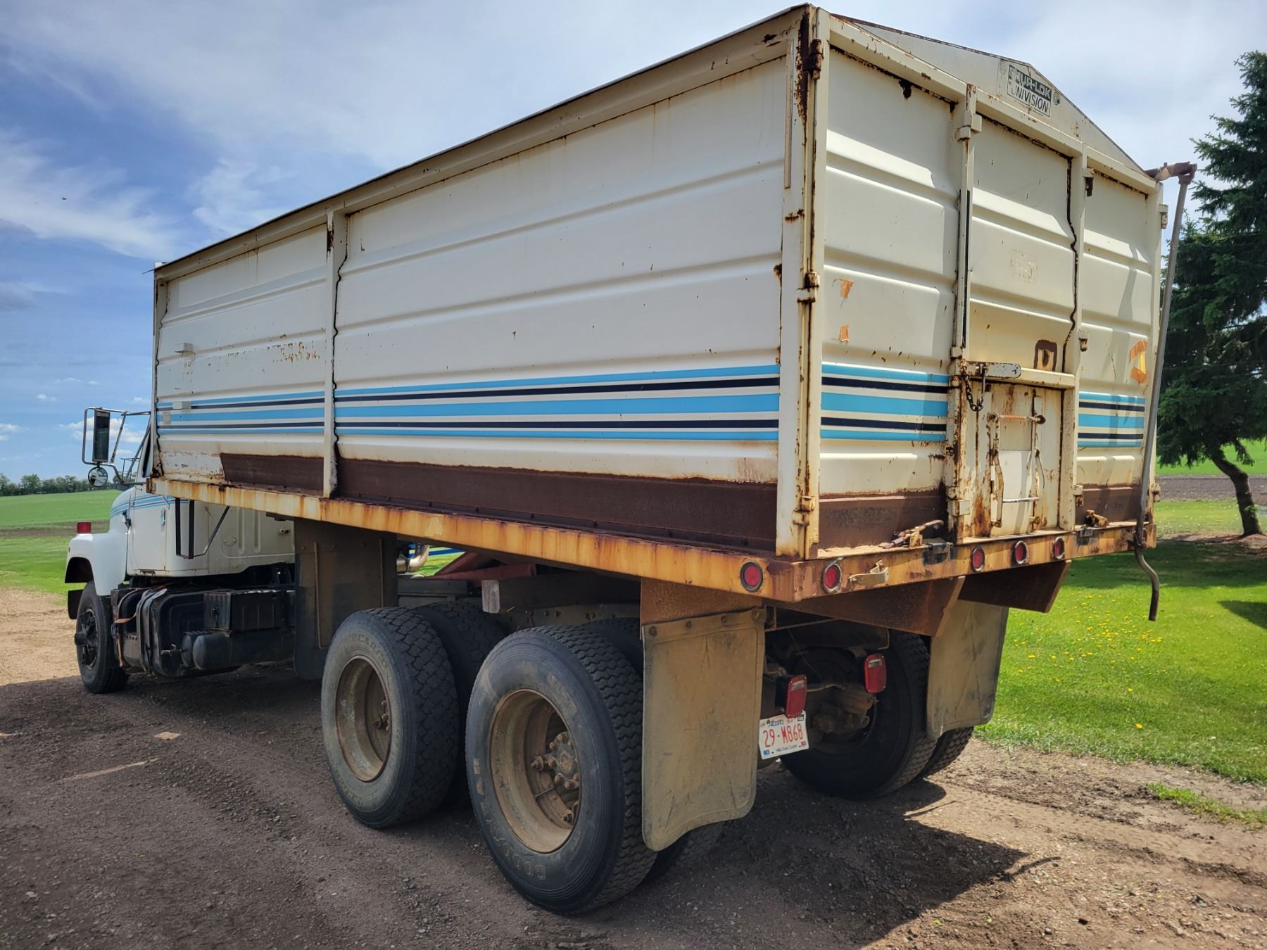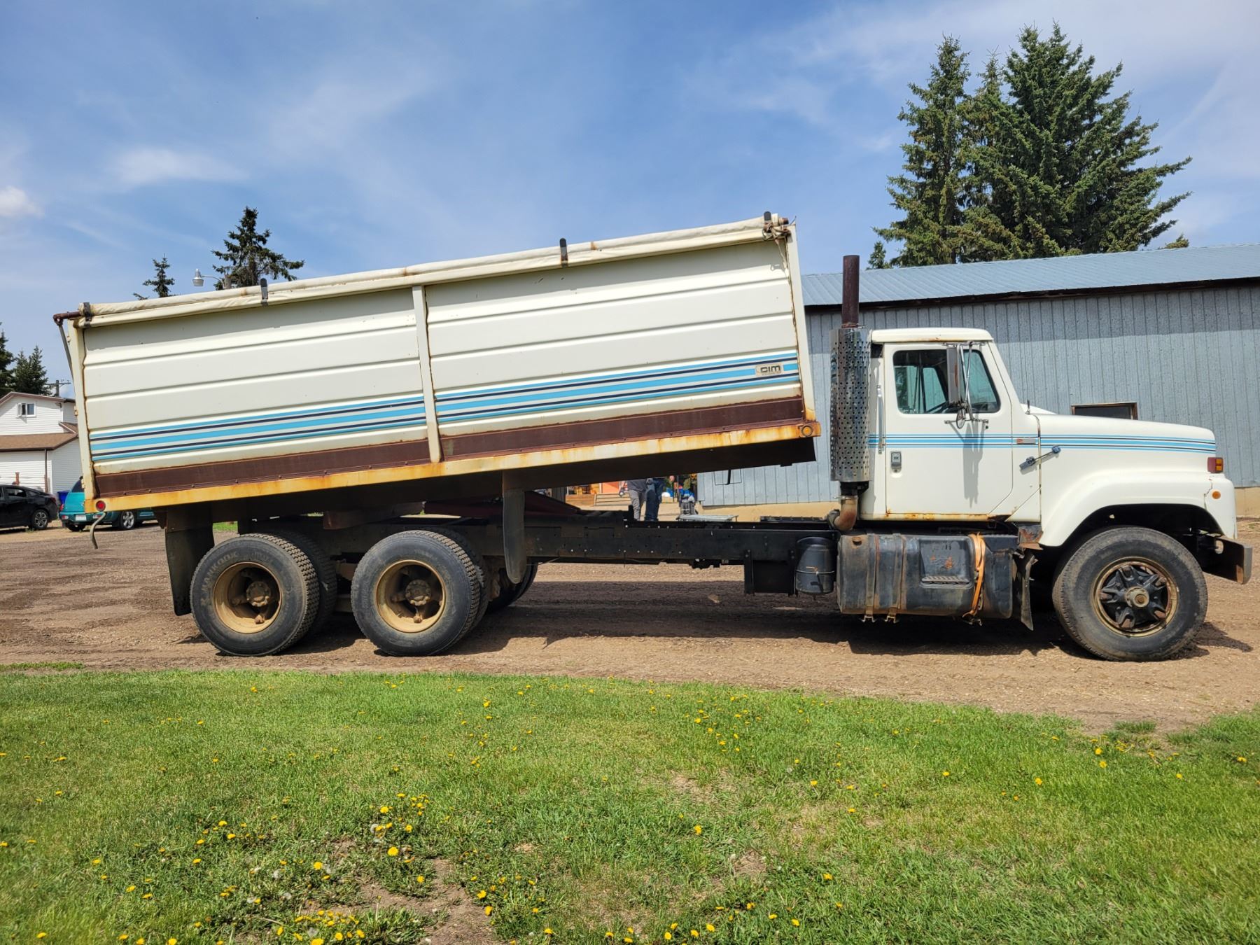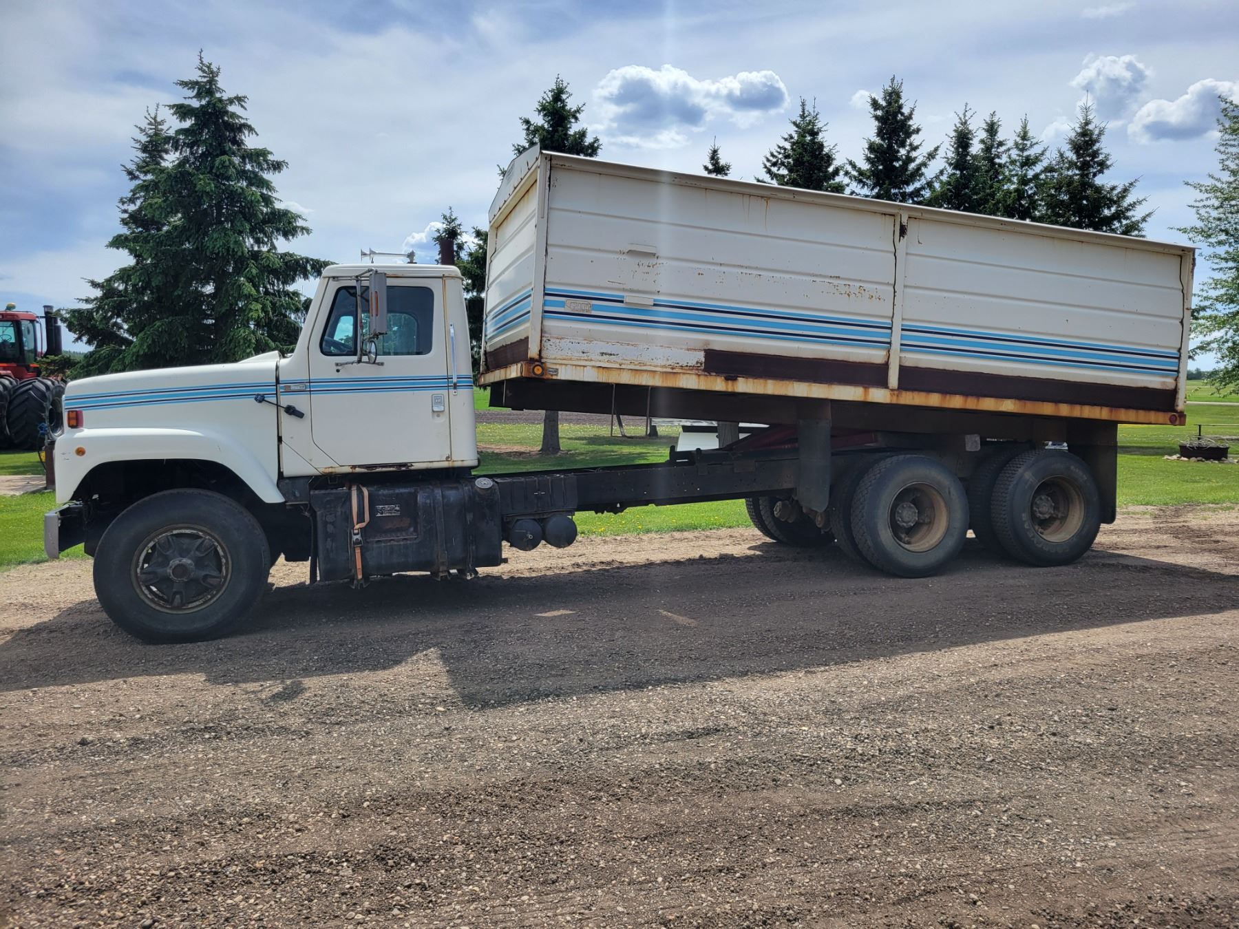 (Lots 1, 2, & 3 are a Group Lot) 1978 I.H. Tandem Grain Truck, 466 Diesel, 10 spd 20'x60" Steel Box & Twin Cyl. Hoist Roll Tarp 11Rx22.5's #DF257HHA27252