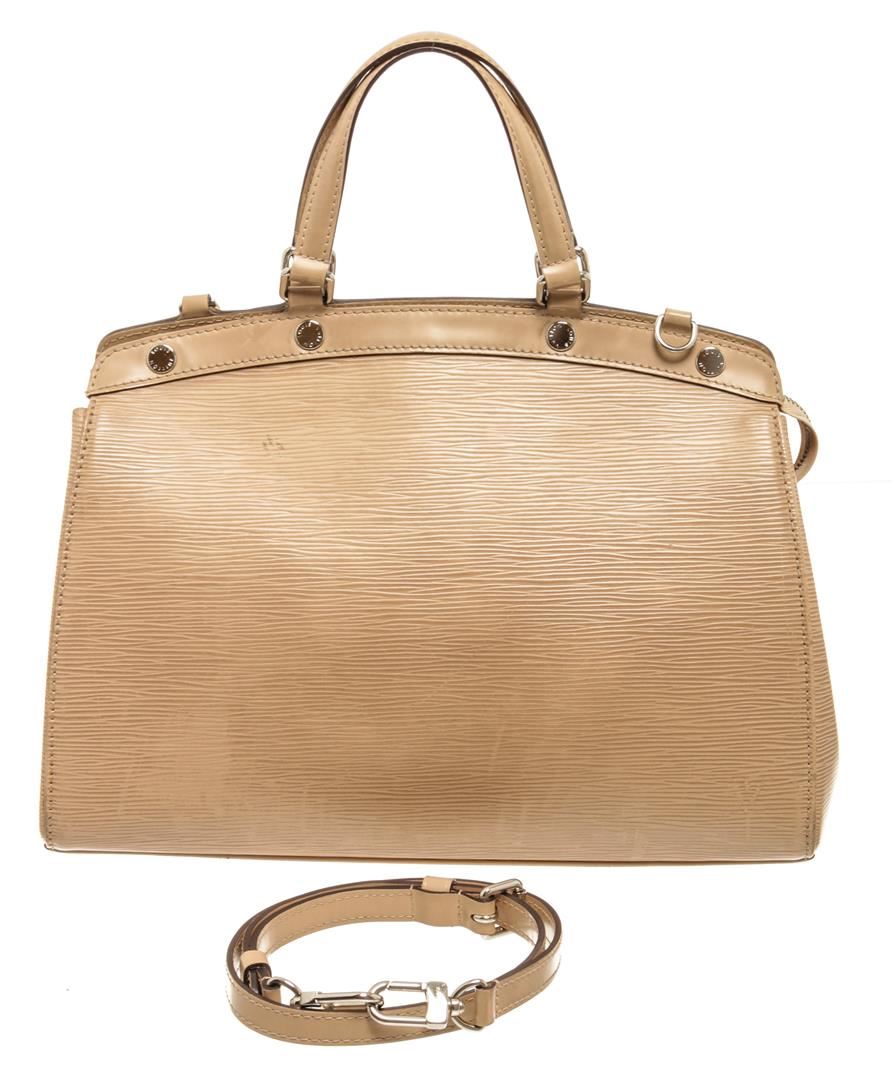 One Louis Vuitton Beige Epi Leather Brea MM Satchel Shoulder Bag. Item is sold AS-IS. All available information is listed in the description and shown in the photo. Beige Epi leather Louis Vuitton Brea MM bag with silver tone hardware, leather trim, brown canvas lining, three interior pockets (one with zipper closure, 2 slip pockets), embossed LV logo on front bottom corner, dual flat leather handles, detachable adjustable leather strap, and top zipper closure. .