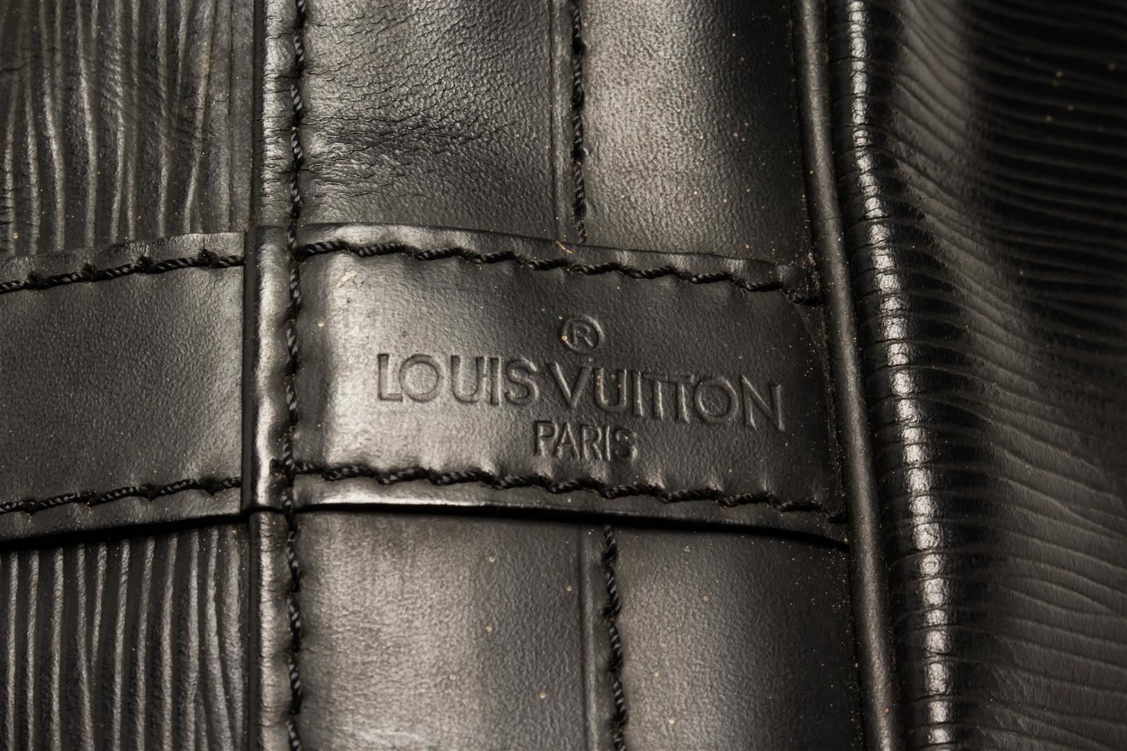 One Louis Vuitton Black Epi Leather Noe Bucket Bag. Item is sold AS-IS. All available information is listed in the description and shown in the photo. Louis Vuitton Black Epi Leather Noe Bucket Bag with gold-tone hardware, leather trim, black suede lining, single adjustable black leather shoulder strap, and drawstring closure. .