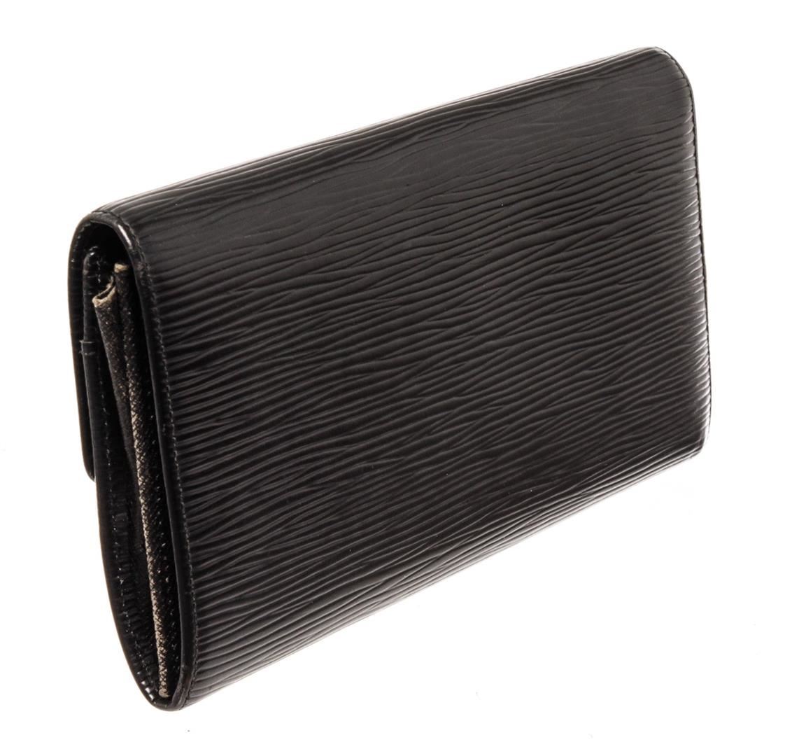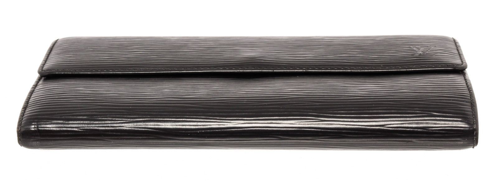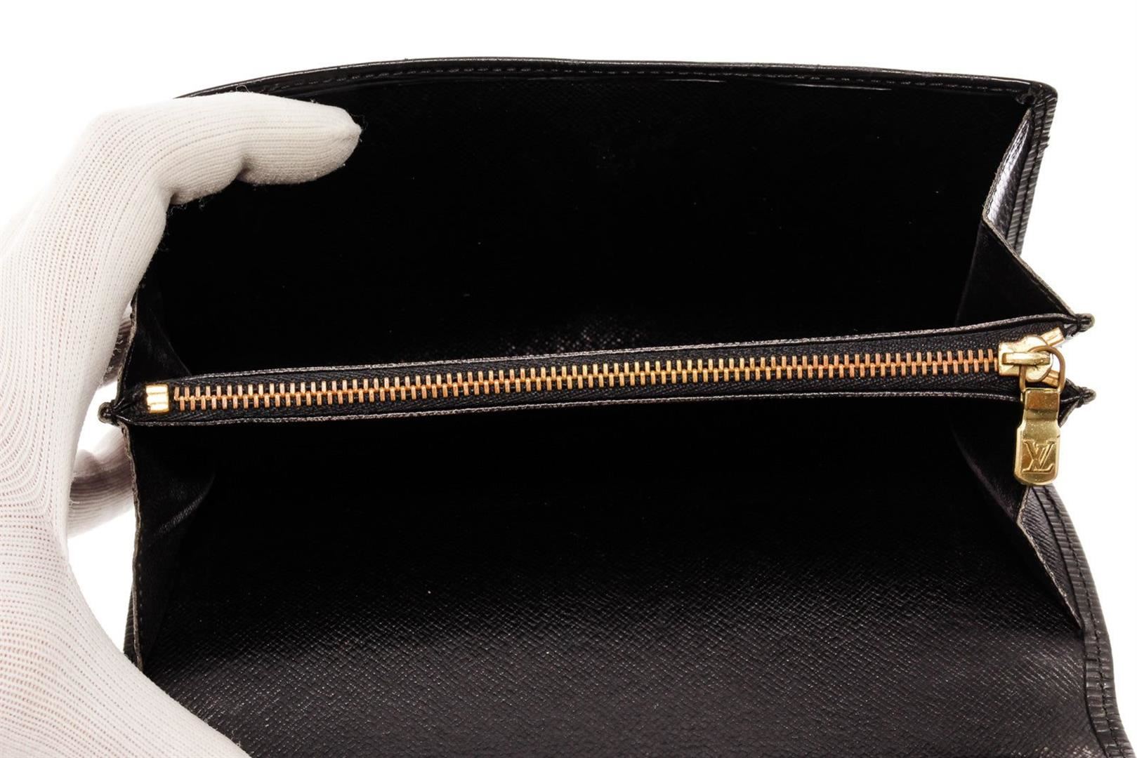 Louis Vuitton Sarah Wallet features black Epi leather body. This envelope-style wallet opens to reveal two spacious compartments, complete with multiple card slots, as well as a zipped pocket for coins. Its flap engraved with with a Louis Vuitton logo is