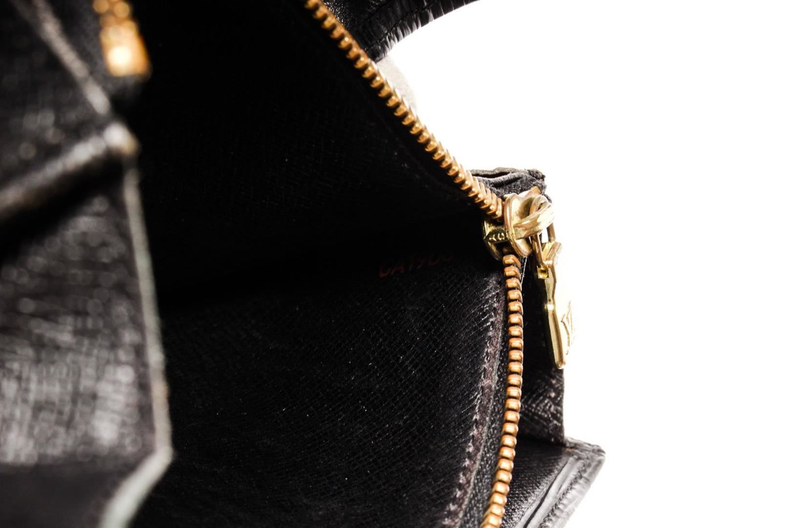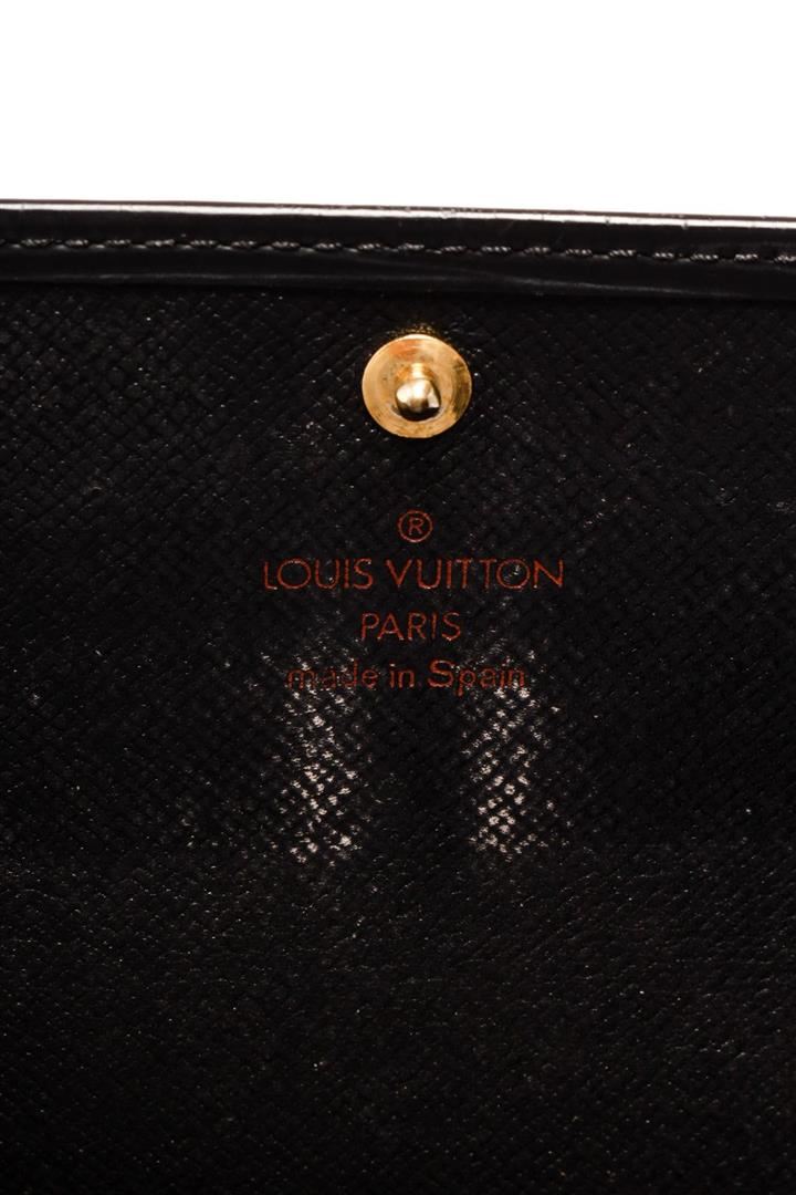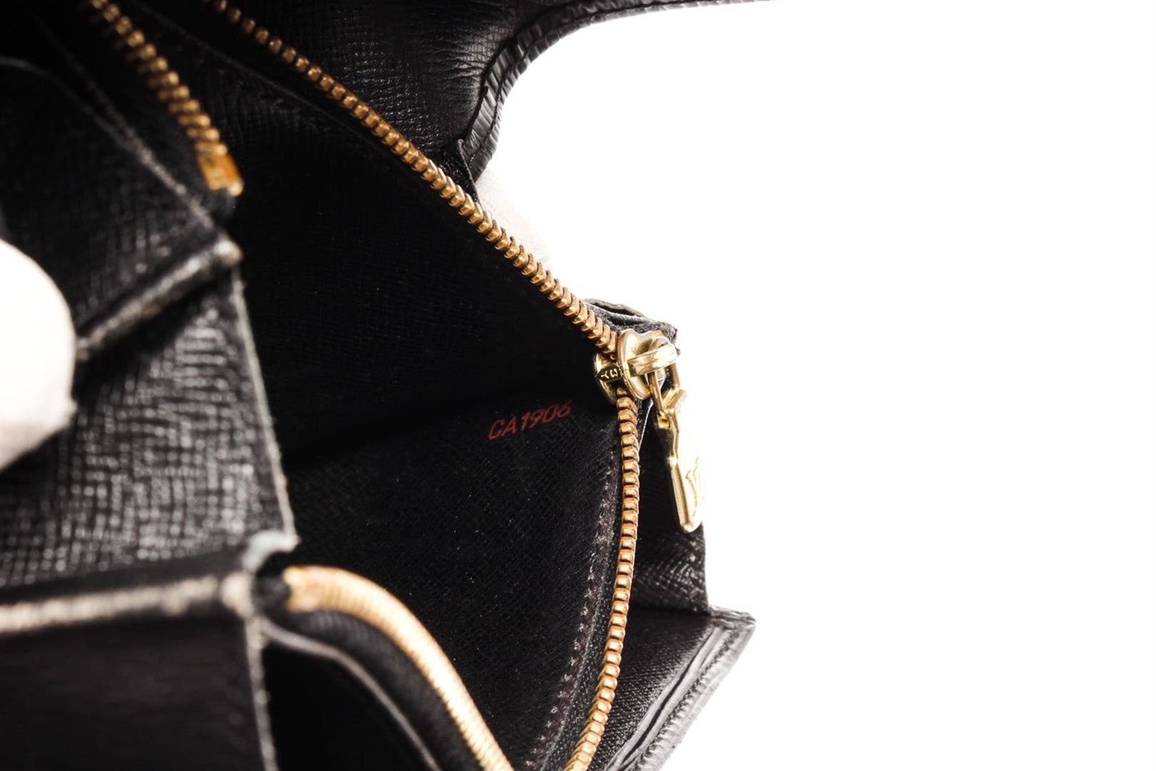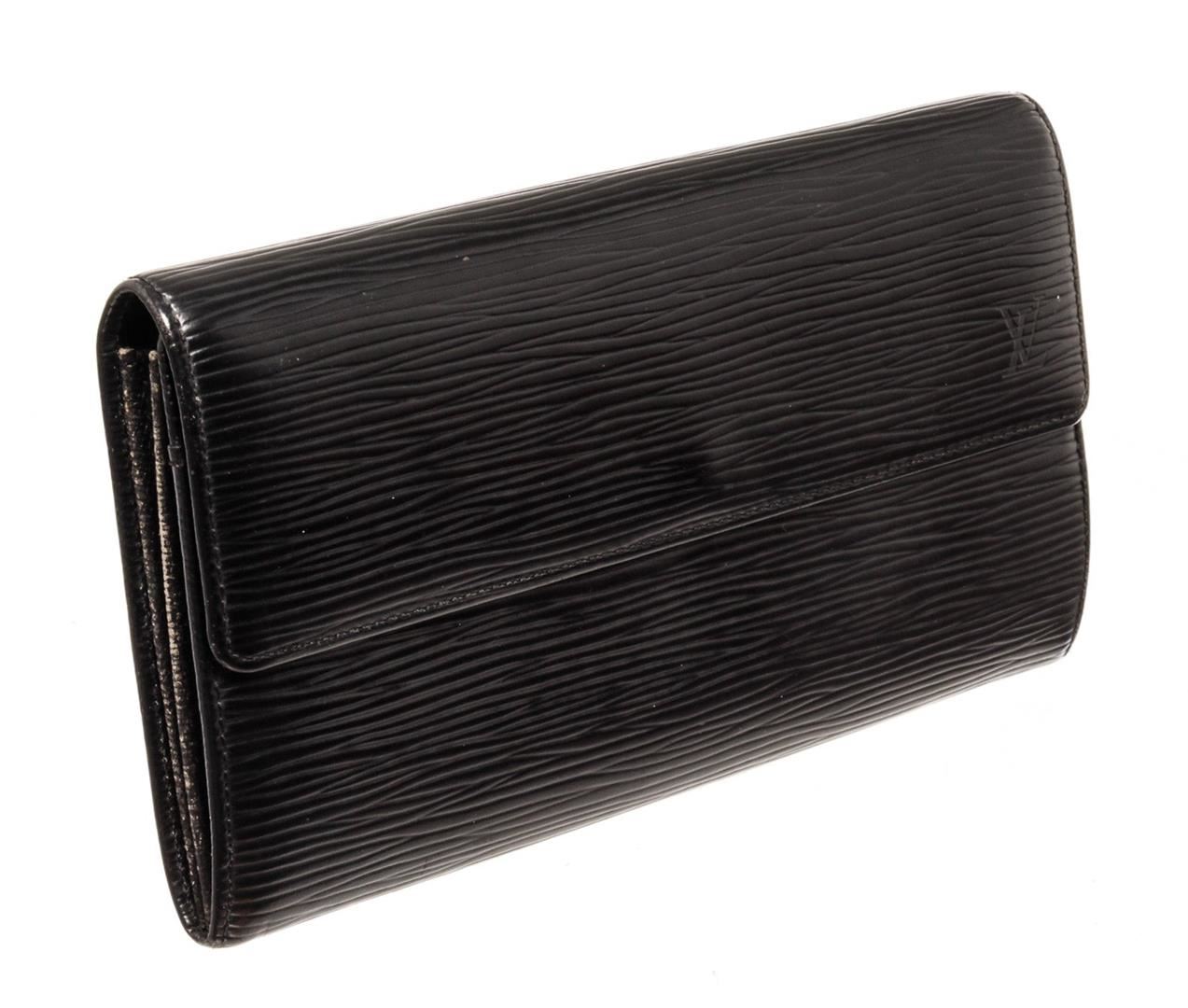 Louis Vuitton Sarah Wallet features black Epi leather body. This envelope-style wallet opens to reveal two spacious compartments, complete with multiple card slots, as well as a zipped pocket for coins. Its flap engraved with with a Louis Vuitton logo is