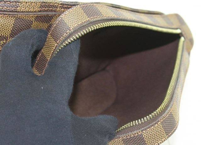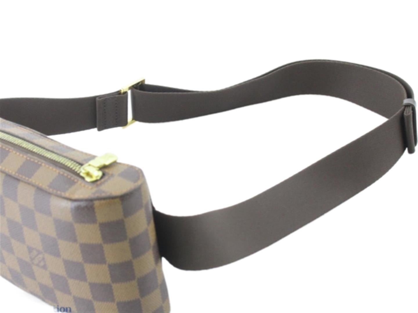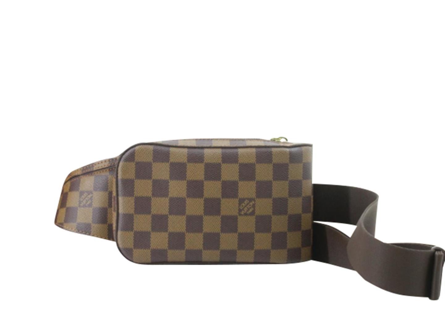 One Louis Vuitton Brown Damier Ebene Geronimos Waist Bag. Item is sold AS-IS. All available information is listed in the description and shown in the photo. Brown Damier Ebene coated canvas Louis Vuitton Geronimos waist bag with gold-tone hardware, single adjustable waist strap with buckle closure, single pocket at exterior with snap closure, brown canvas lining and zip around closure..