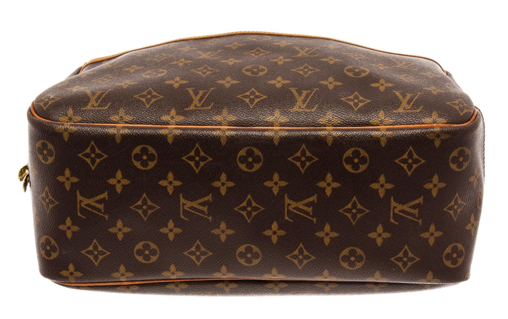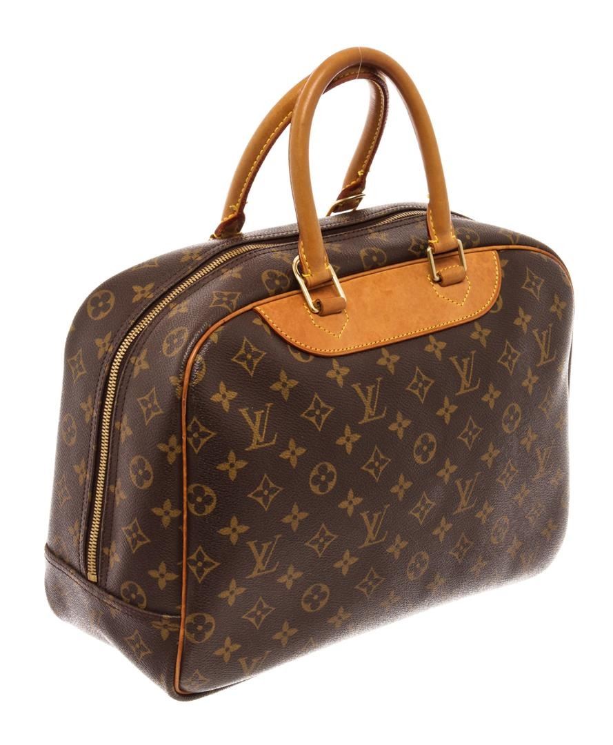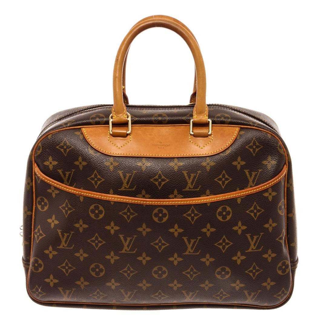 Louis Vuitton Brown Monogram Canvas Deauville Satchel Bag. All available information is listed in the description and shown in the photos. Louis Vuitton Brown Monogram Canvas Deauville Satchel Bag with gold-tone hardware, monogram canvas, leather tag, debossed logo, two-way zip fastening, two rounded top handles, front patch pocket, internal patch pockets, internal logo patch. Depth 5.9 in, Handle 4.3 in, Height 11.4 in, Width 13.8 in / Depth 15 cm, Handle 11 cm, Height 29 cm, Width 35 cm