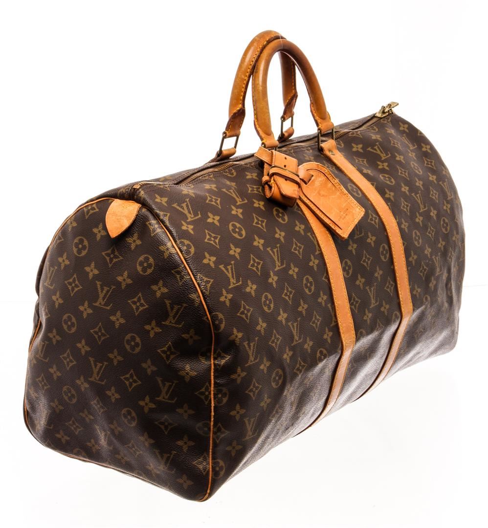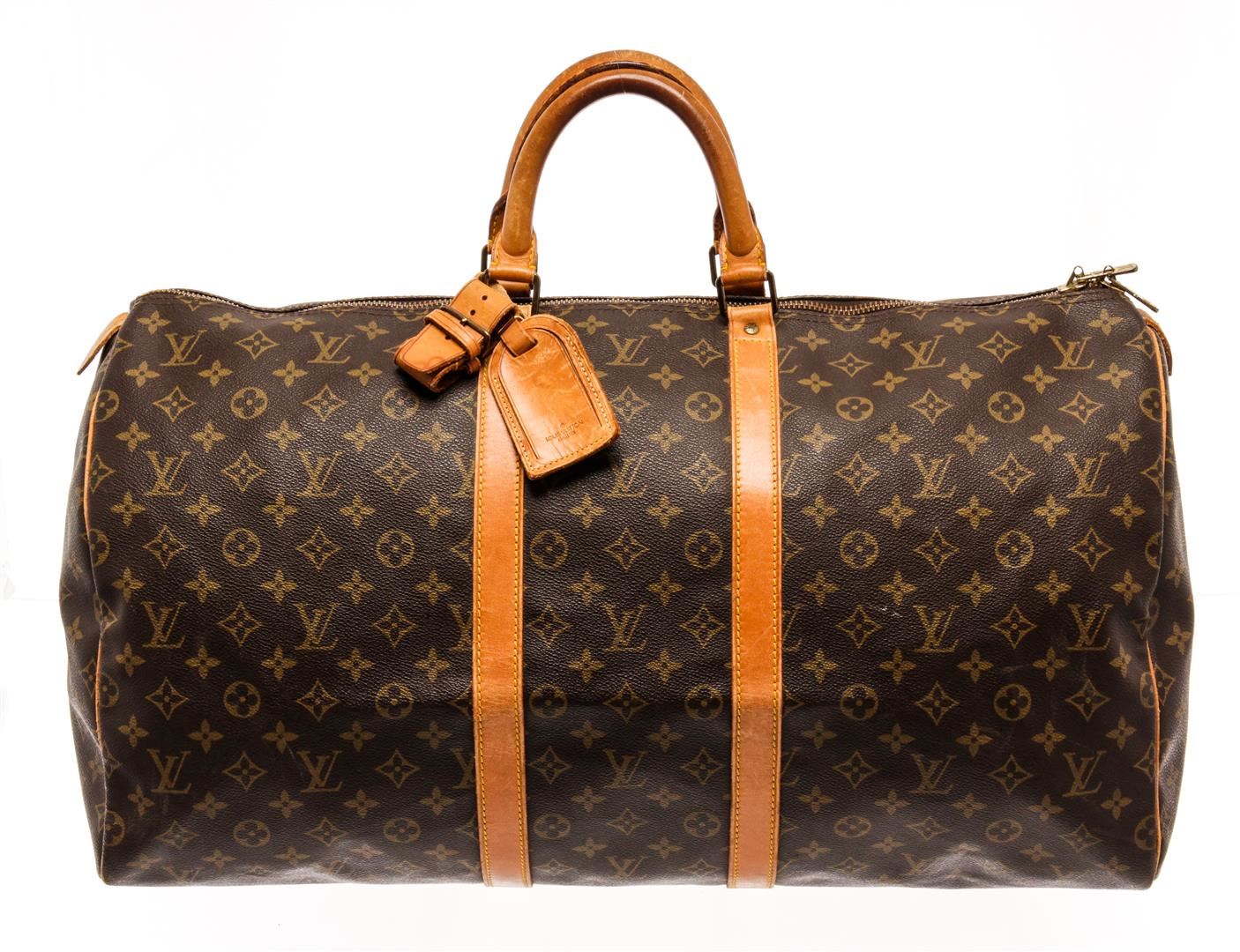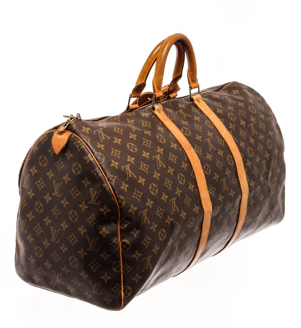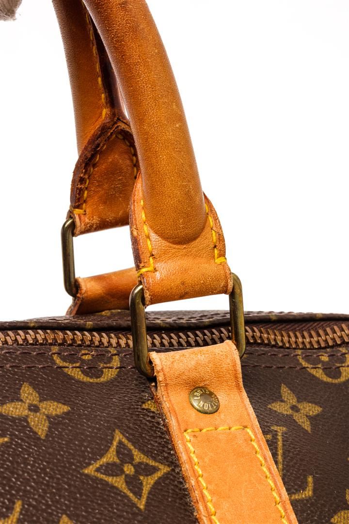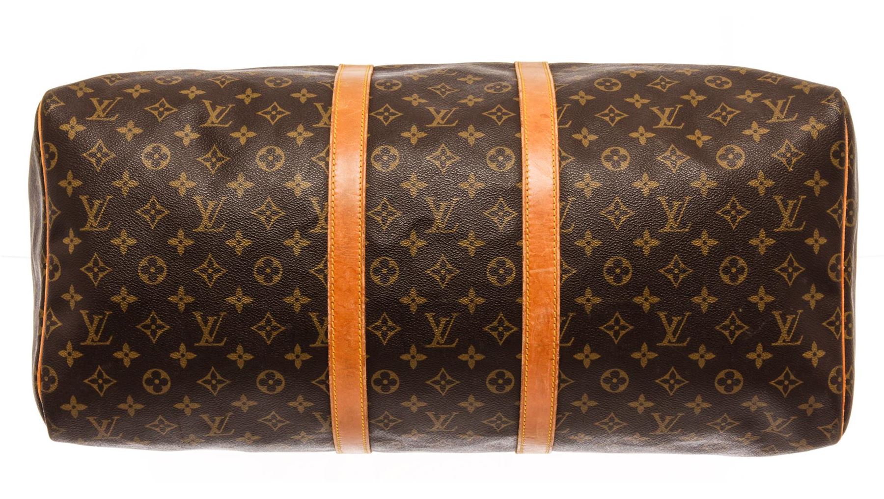 Louis Vuitton Brown Monogram Canvas Keepall 55 Travel Bag. All available information is listed in the description and shown in the photos. Louis Vuitton Brown Monogram Canvas Keepall 55 Travel Bag with gold-tone hardware, trim tan vachetta leather, brown canvas lining, leather trim inside, golden brass pieces, rounded leather handles. W55cm x H27cm x D25cm / 21.65" x 10.62" x 9.84"