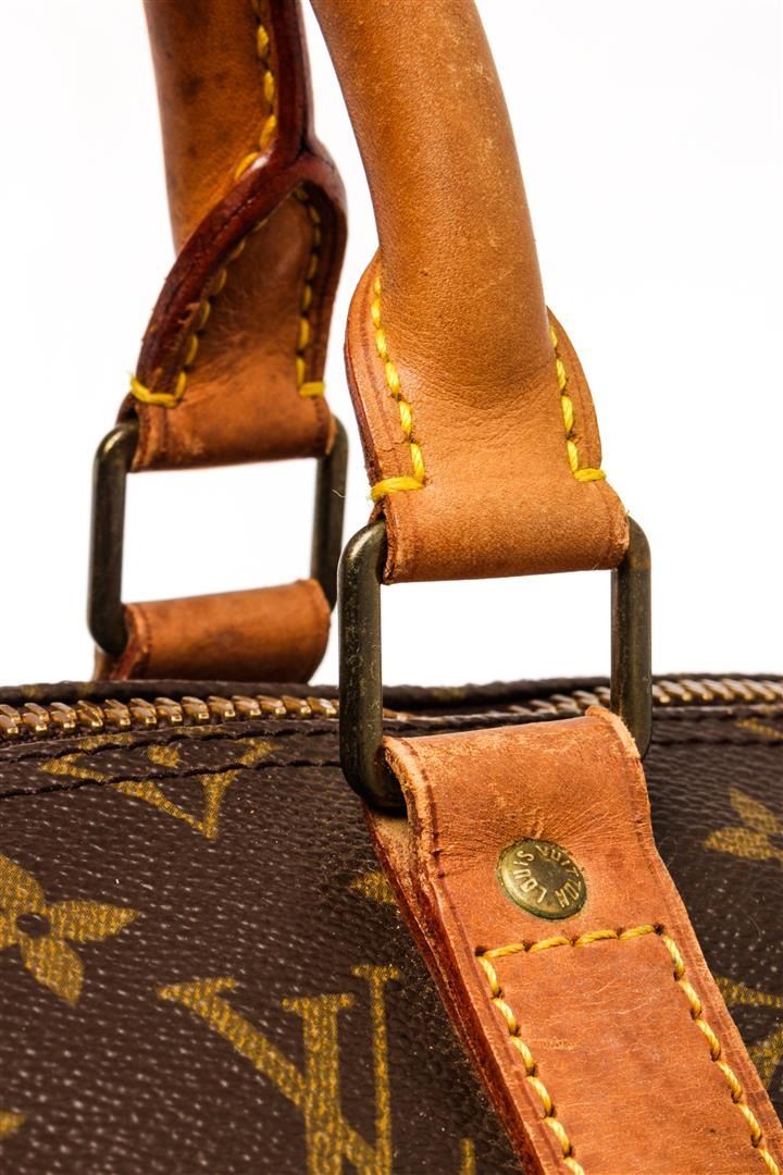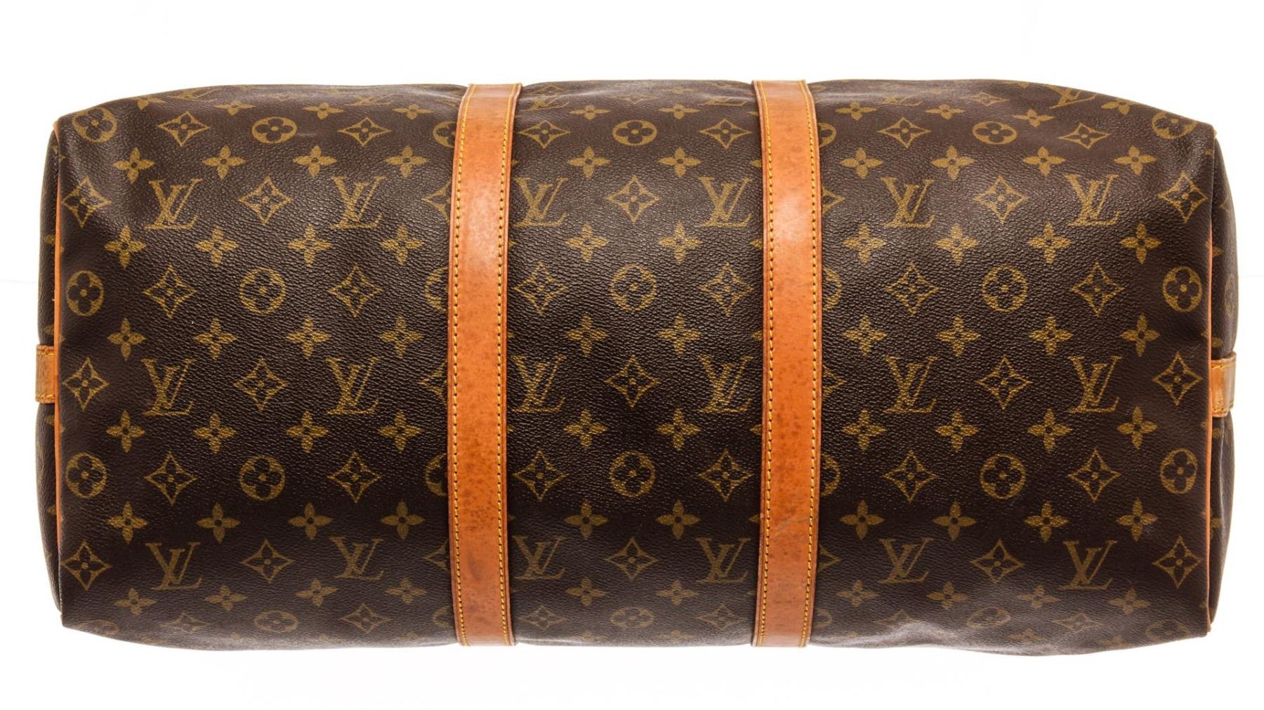 Louis Vuitton Brown Monogram Canvas Keepall Bandouliere 50 Travel Bag. All available information is listed in the description and shown in the photos. Louis Vuitton Brown Monogram Canvas Keepall Bandouliere 50 Travel Bag with a monogram canvas body, rolled leather handles, a detachable shoulder strap, and a top zip closure. 10.8" L x 19.5" W x 8.3" D / 27.43 x 49.53 x 21.08 CM
