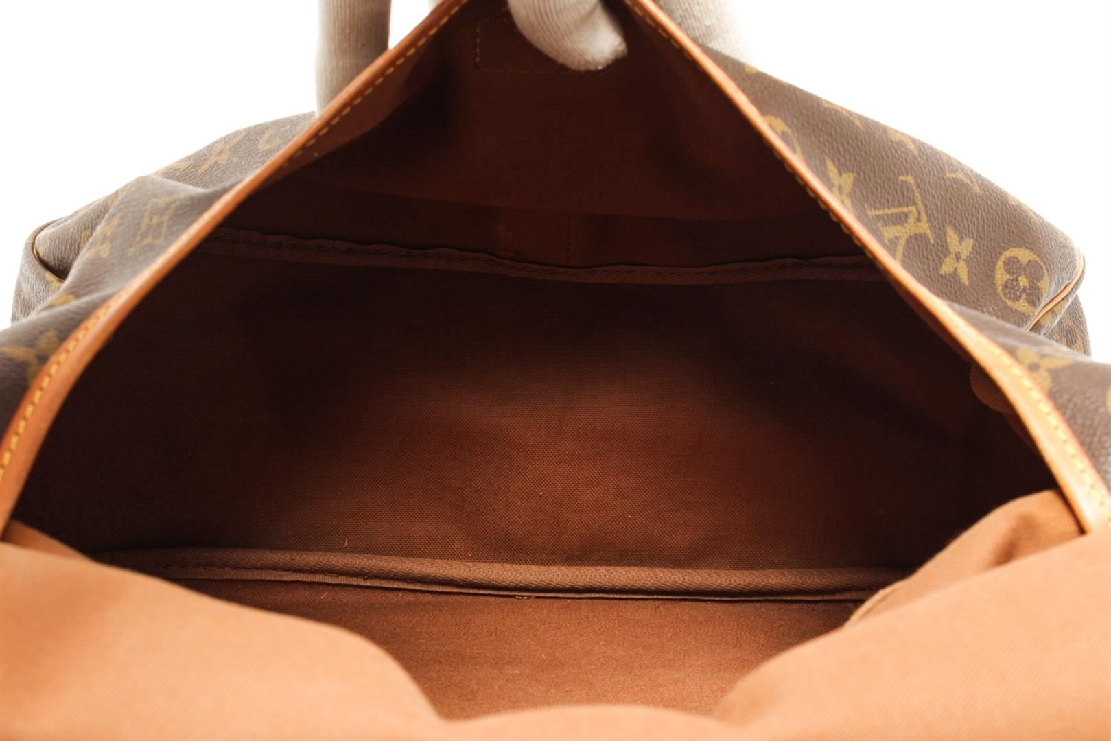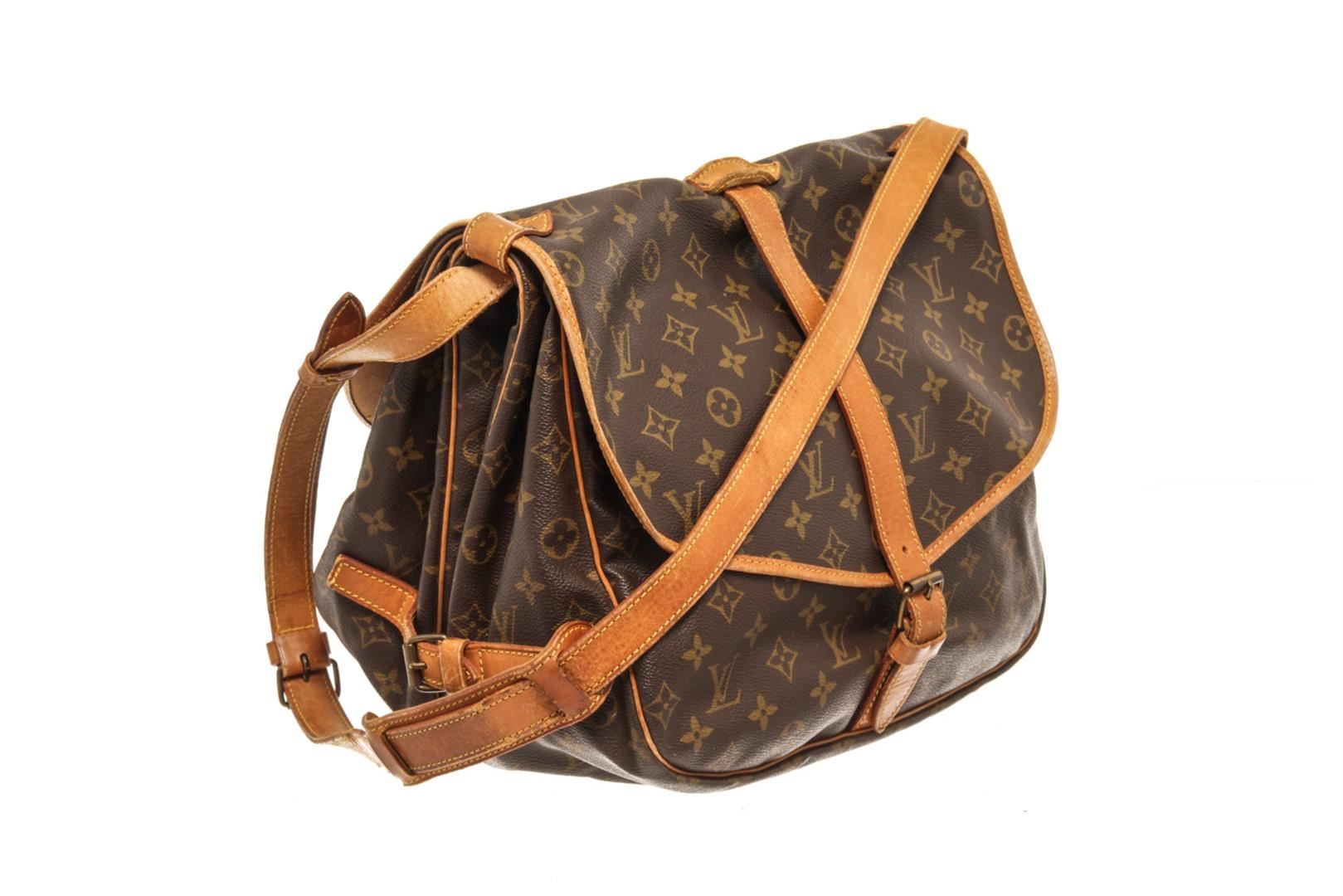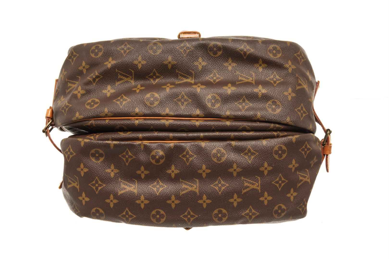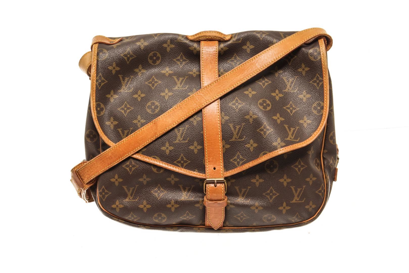 One Louis Vuitton Brown Monogram Canvas Saumur 30 Shoulder Bag. Item is sold AS-IS. All available information is listed in the description and shown in the photo. louis vuitton brown monogram canvas saumur 30 shoulder bag with gold hardware, leather trims Height: 8 in (20.32 cm), Width: 11 in (27.94 cm), Depth: 5 in (12.7 cm)
