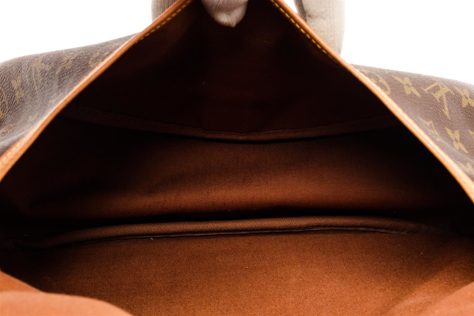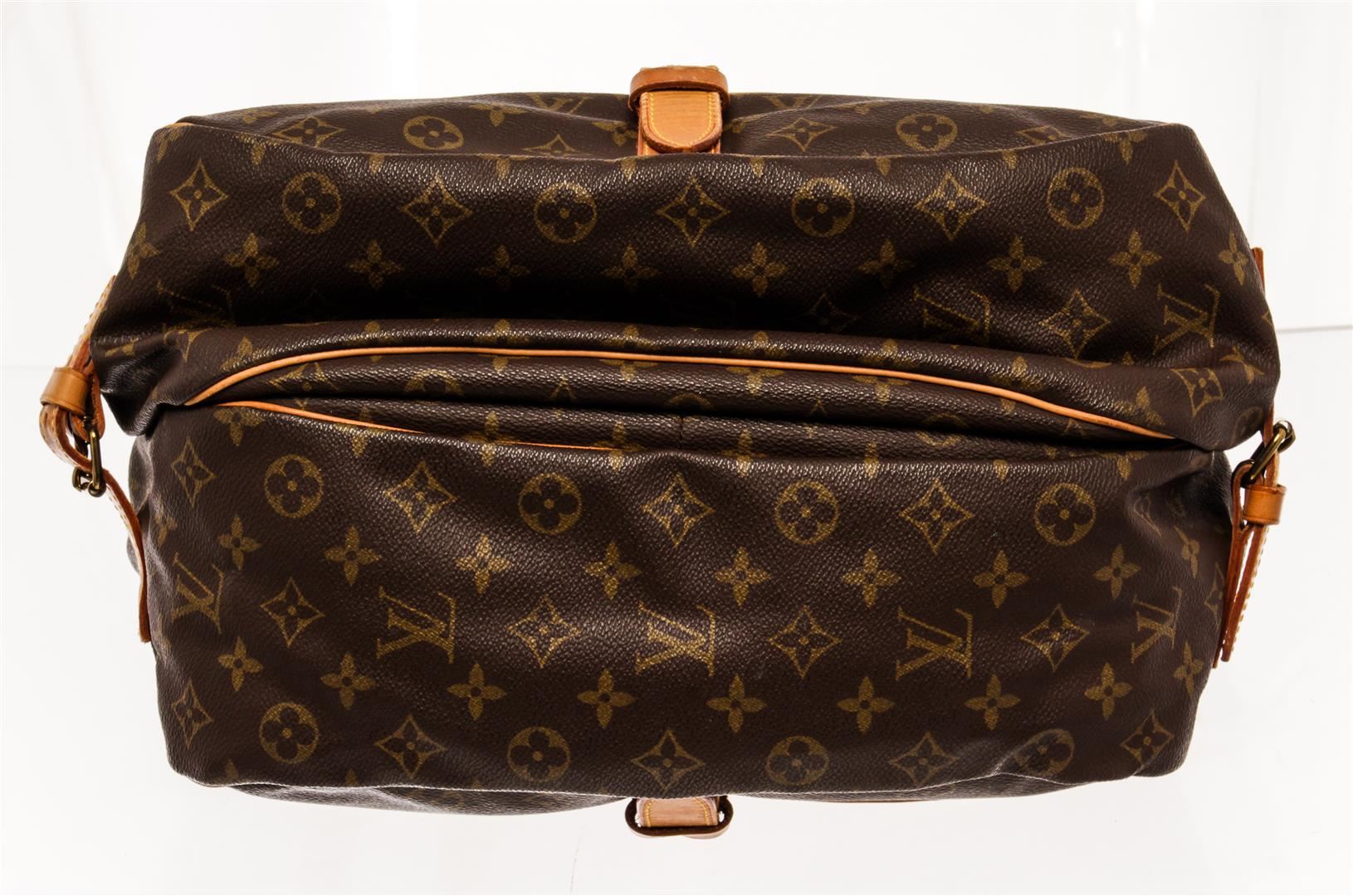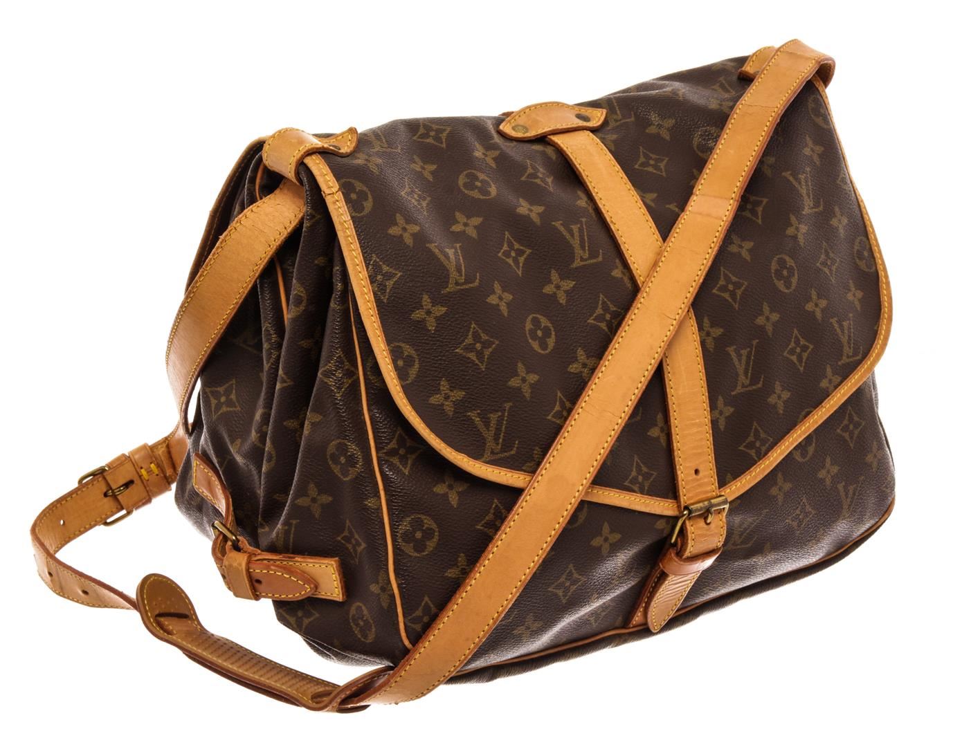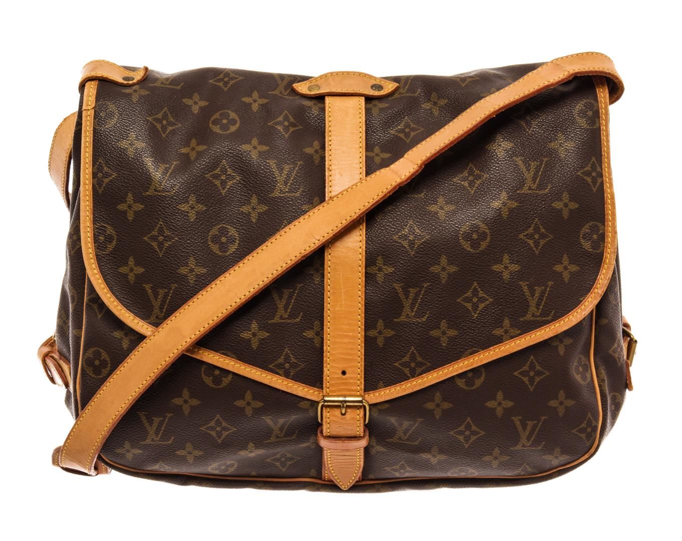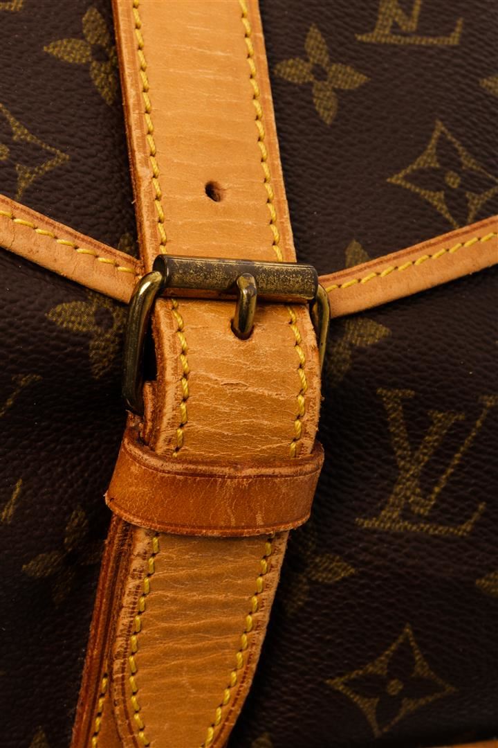 Louis Vuitton Brown Monogram Canvas Saumur 35 Shoulder Bag. All available information is listed in the description and shown in the photos. Louis Vuitton Brown Monogram Canvas Saumur 35 Shoulder Bag with monogram pattern, brown coated canvas, brass hardware, leather trim, single adjustable shoulder strap, leather trim embellishment, canvas lining & three interior pockets, buckle closures at front & back. Height: 13" Width: 12.75" Depth: 3.25", Shoulder Strap Drop: 17.75" / 33.02 x 32.38 x 8.25 Cm