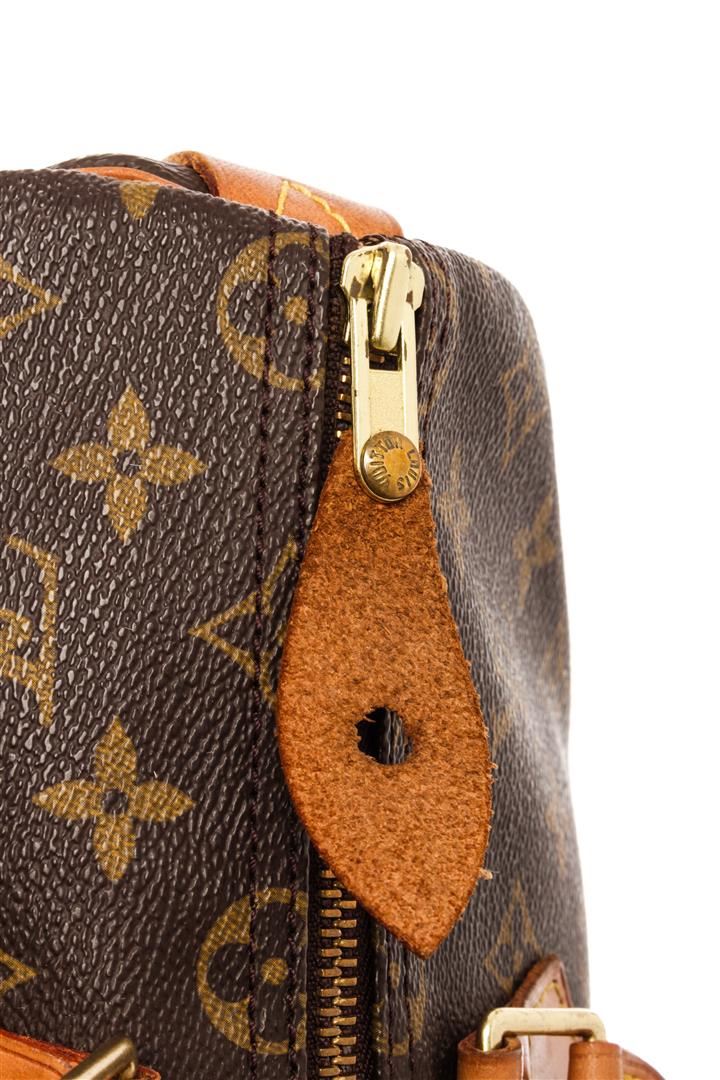 Louis Vuitton Brown Monogram Canvas Speedy 35 Satchel Bag. All available information is listed in the description and shown in the photos. Louis Vuitton Brown Monogram Canvas Speedy 35 Satchel Bag with brass hardware, leather trim, rolled handles, leather trim embellishment, canvas lining & single interior pocket, zip closure at top. Height: 9" Width: 14" Depth: 7.5", Handle Drop: 3.5" / 22.86 x 35.56 x 19.05 Cm