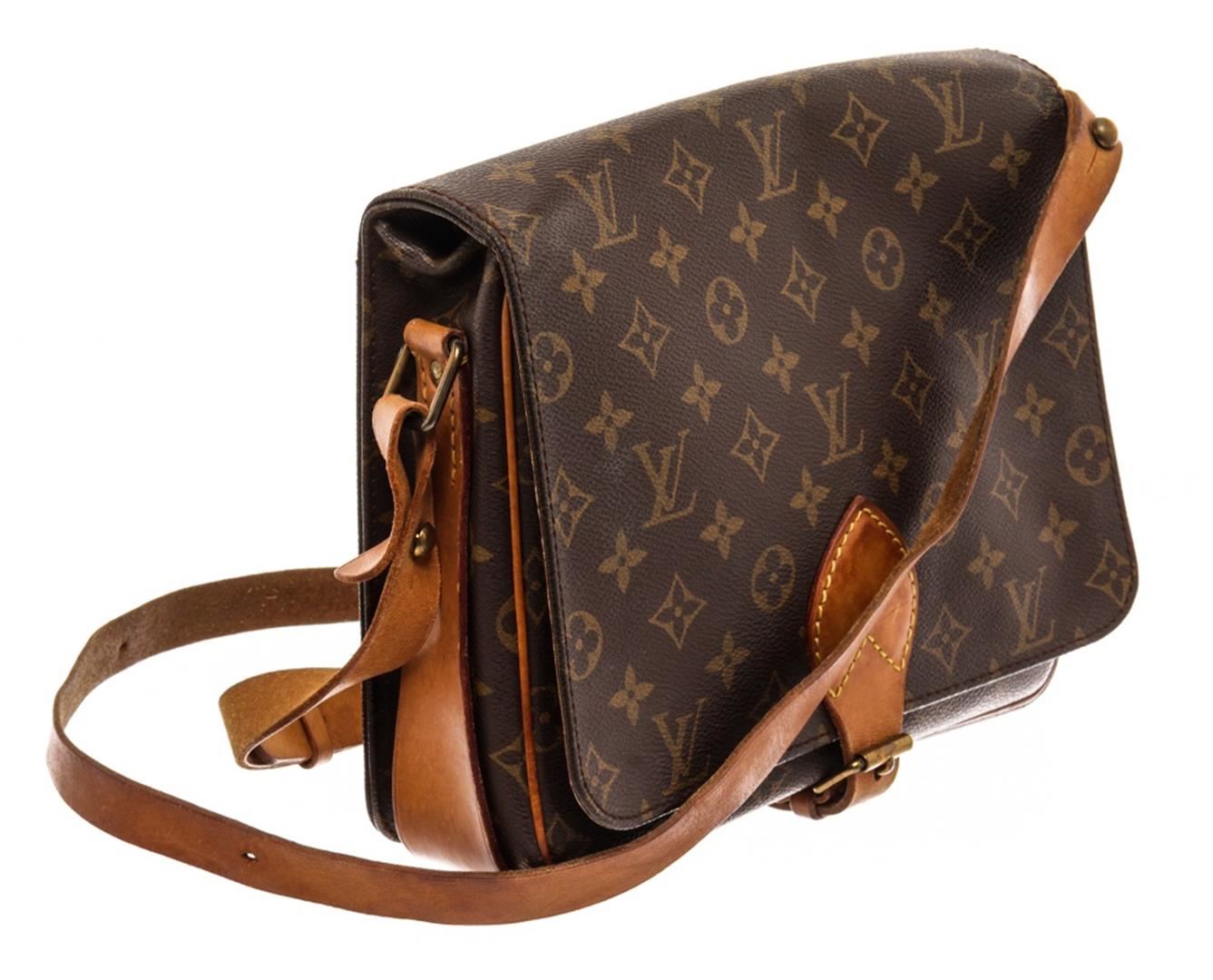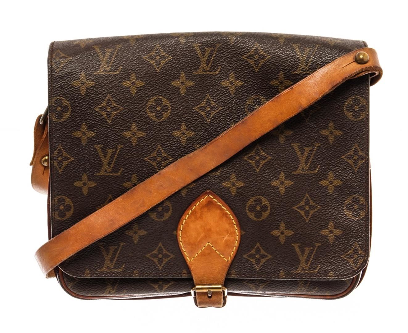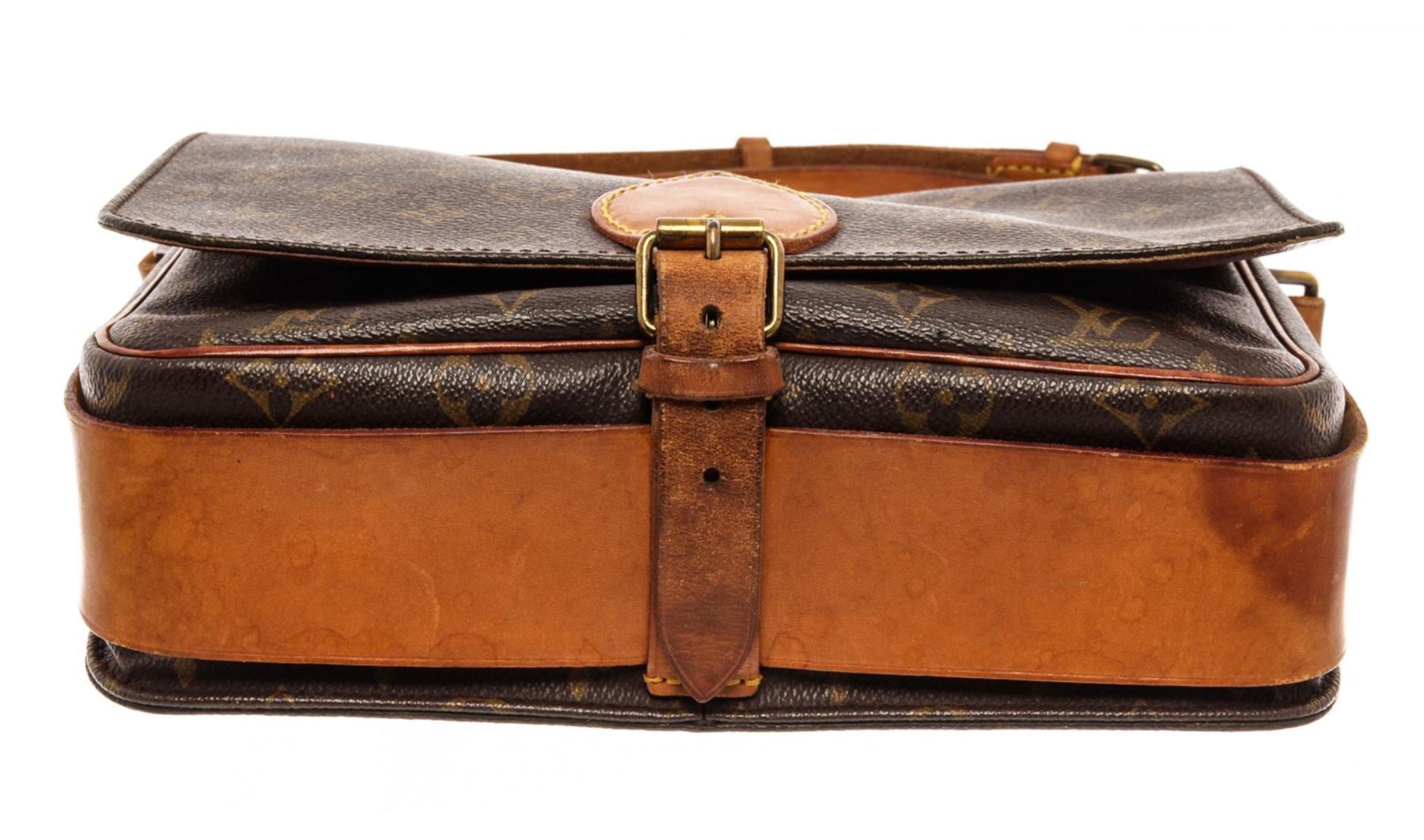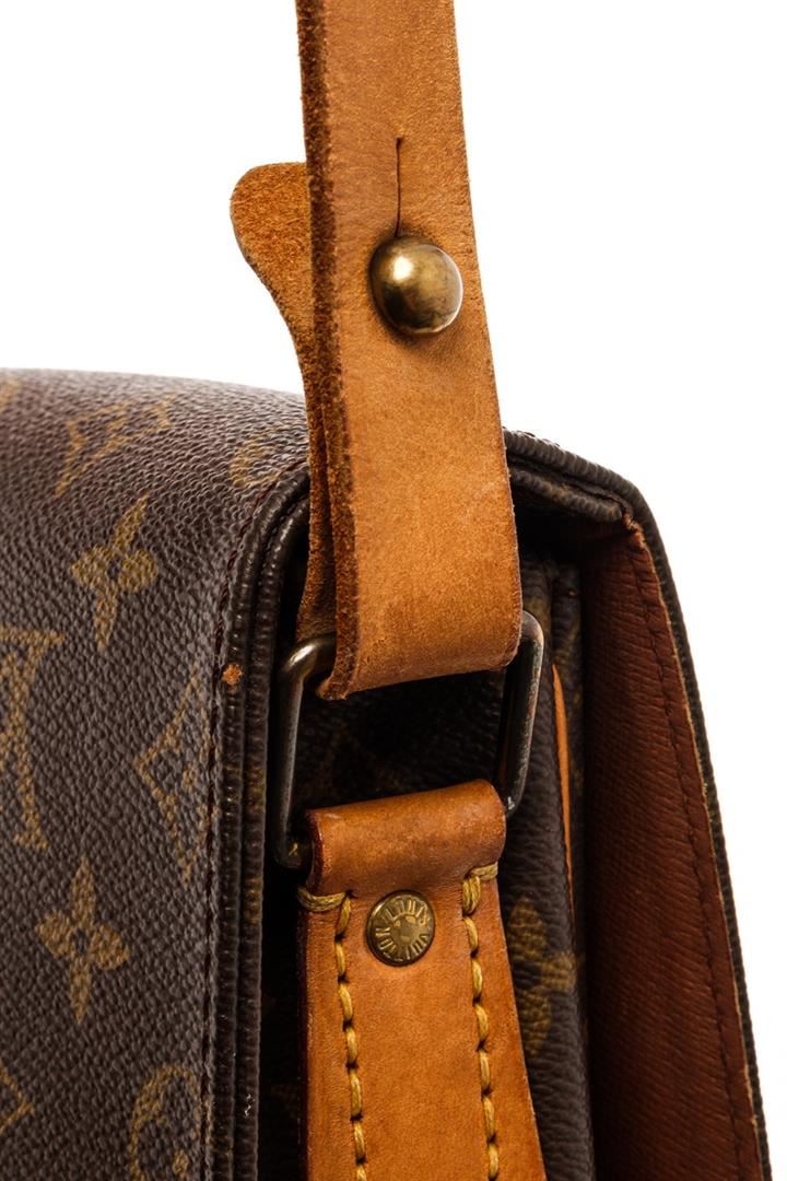 Louis Vuitton Brown Monogram Leather Cartouchiere GM Messenger Bag. All available information is listed in the description and shown in the photos. Louis Vuitton Brown Monogram Leather Cartouchiere GM Messenger Bag with brown printed, brass hardware, single adjustable shoulder strap, leather lining, buckle closure at front. Height: 9.25" Width: 10.25" Depth: 3", Shoulder Strap Drop Max: 21.5" / 23.49 x 26.03 x 7.62 Cm