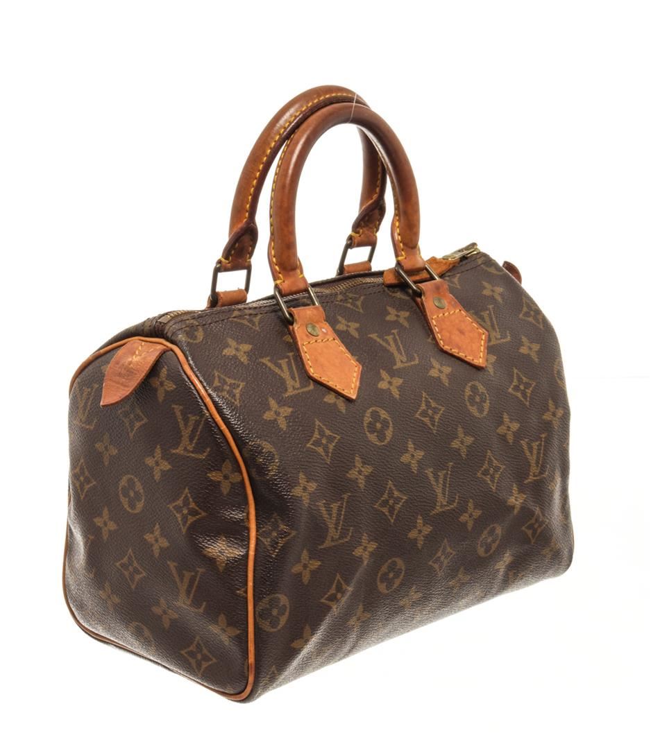 One Louis Vuitton Brown Monogram Speedy 25 Handbag. Item is sold AS-IS. All available information is listed in the description and shown in the photo. Louis Vuitton Brown Monogram Speedy 25 Handbag with brown and tan monogram coated canvas, brass hardware, tan vachetta leather trim, dual rolled top handles, brown interior canvas, single slit pocket at interior, zip closure on top. Height 7", Width 10", Depth 6", Handle Drop 3.25 Inch / 17.78 x 25.4 x 15.24 CM, Handle Drop 8.25 CM