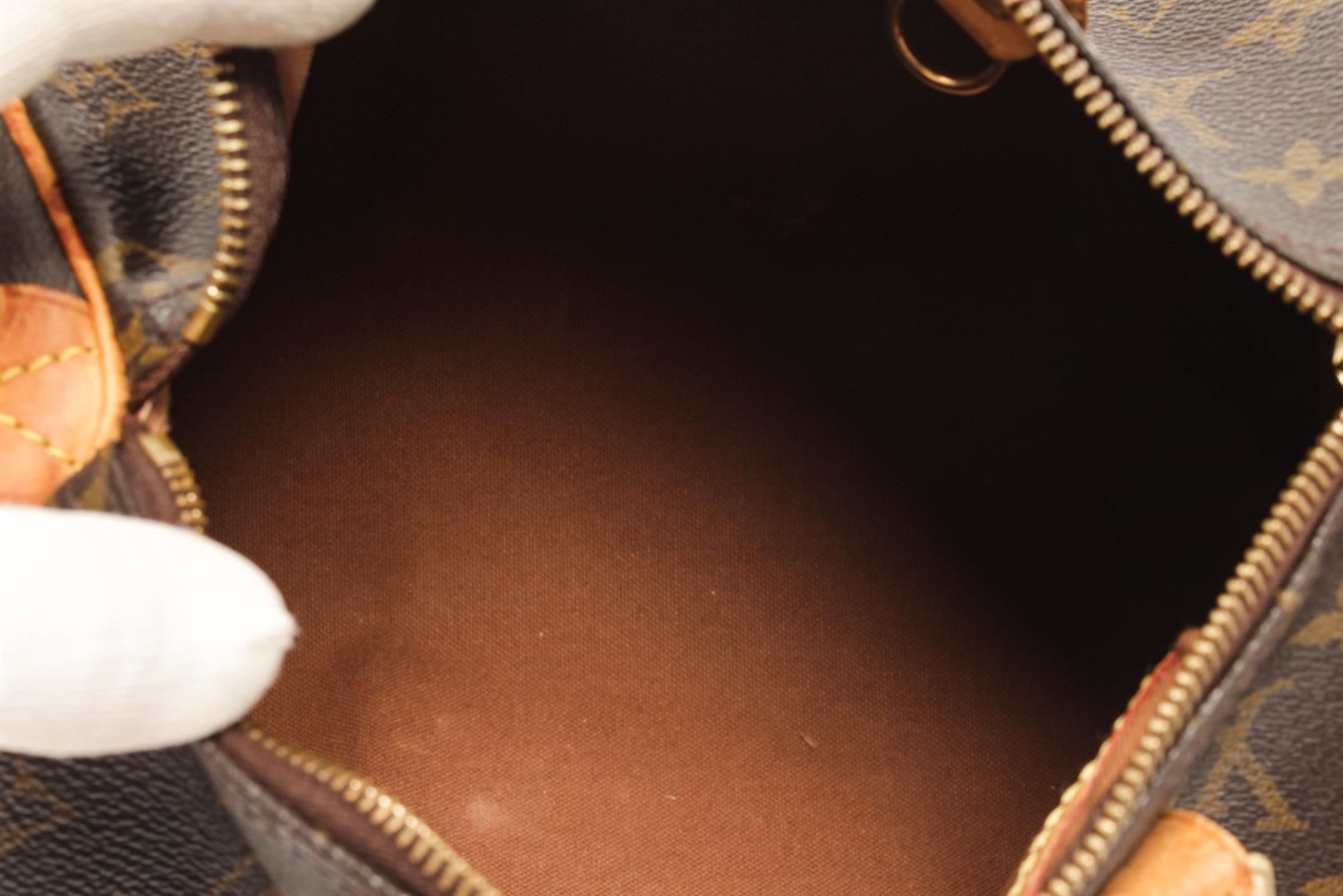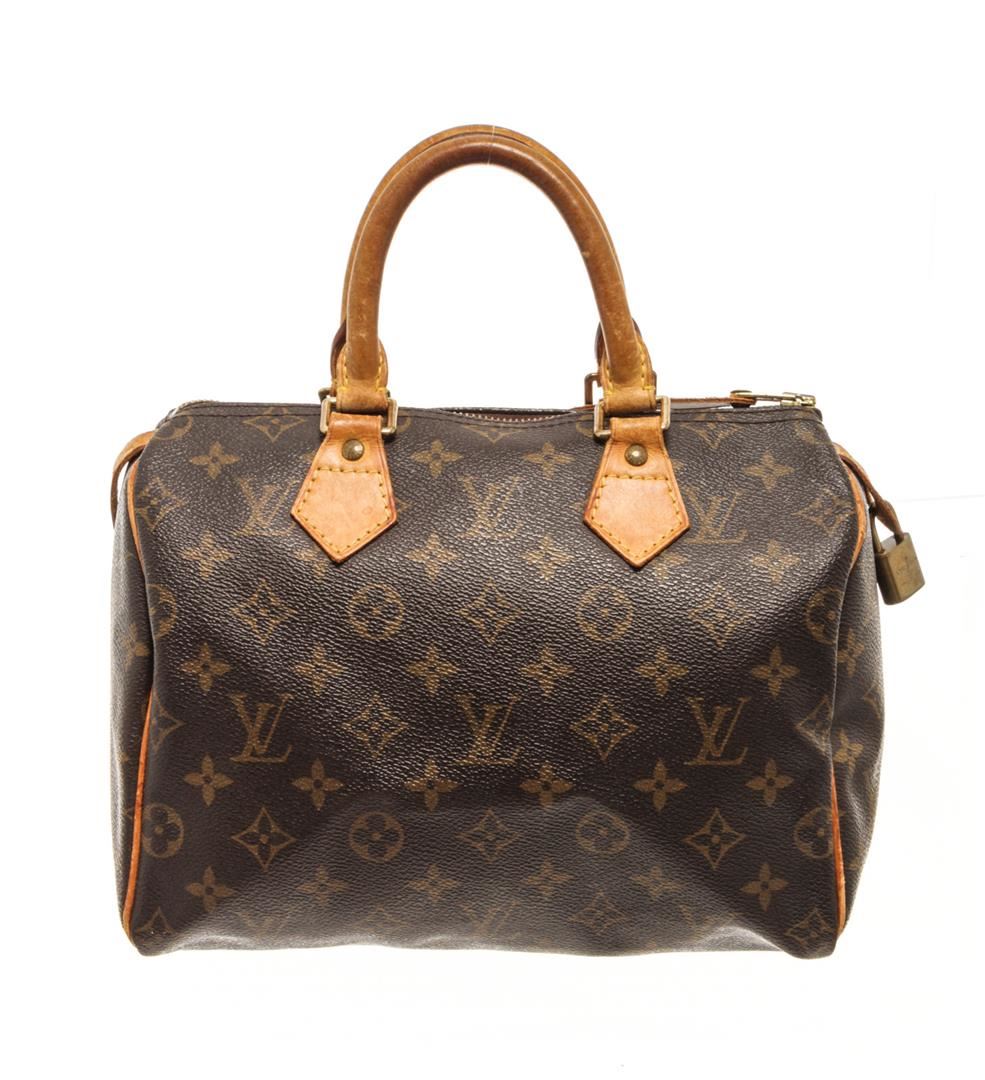 One Louis Vuitton Brown Monogram Speedy 25 Handbag. Item is sold AS-IS. All available information is listed in the description and shown in the photo. Louis Vuitton Brown Monogram Speedy 25 Handbag with brown canvas leather trim, monogram pattern circular top handles, top zip fastening main compartment, zip closure on top. Depth 4.7 in, Width 9.8 in / Depth 12 cm, Width 25 cm