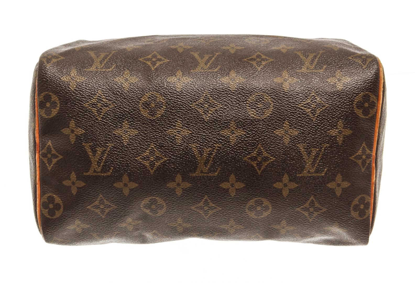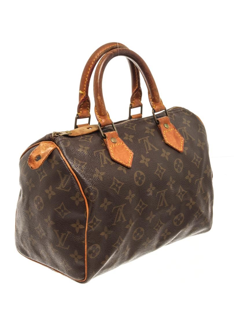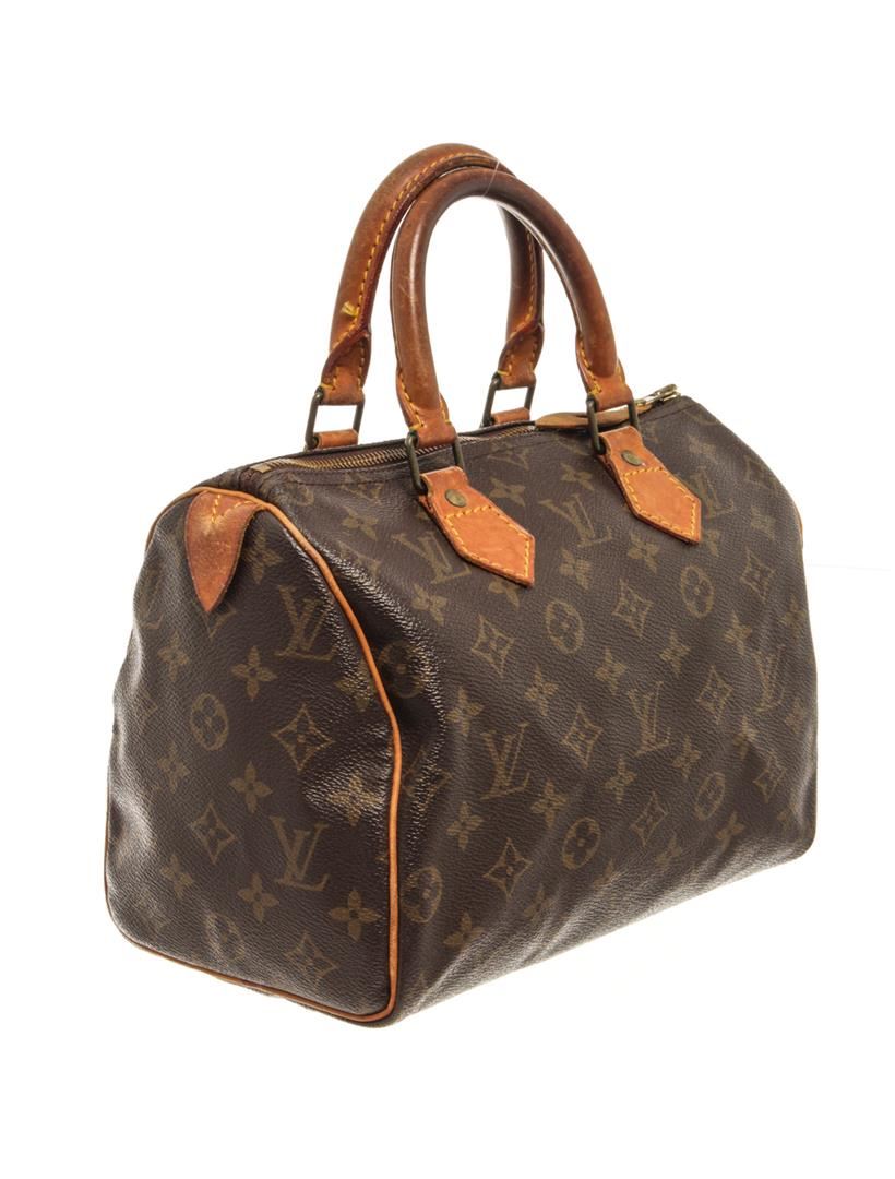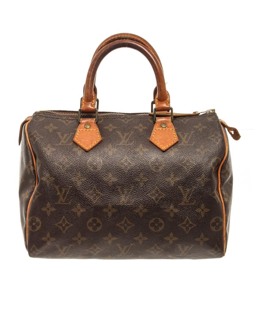One Louis Vuitton Brown Monogram Speedy 25 Satchel Bag. Item is sold AS-IS. All available information is listed in the description and shown in the photo. Louis Vuitton Brown Monogram Speedy 25 Satchel Bag with gold tone hardware, brown printed, brass hardware, rolled handles, canvas lining & single interior pocket, zip closure at top. Height: 8", Width: 9.75", Depth: 5.5", Handle Drop: 3.75" / 20.32 x 24.76 x 13.97 Cm, Handle Drop: 9.52 CM