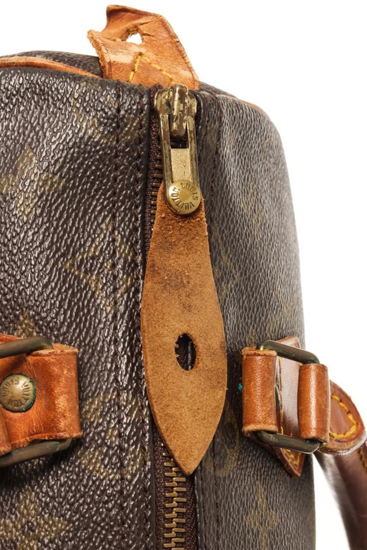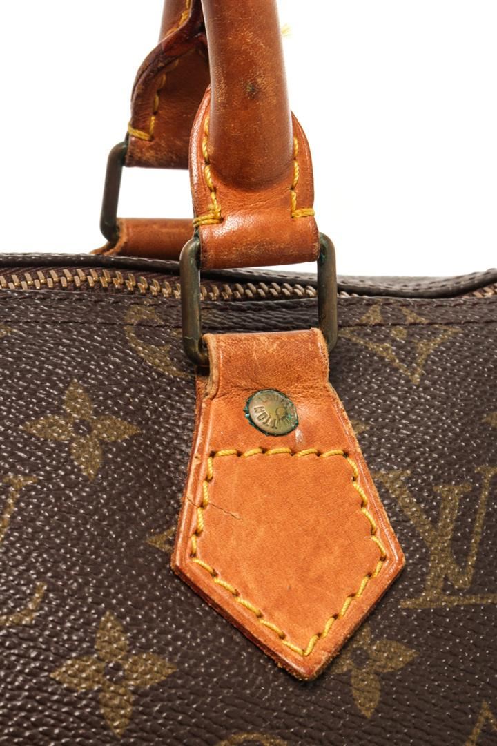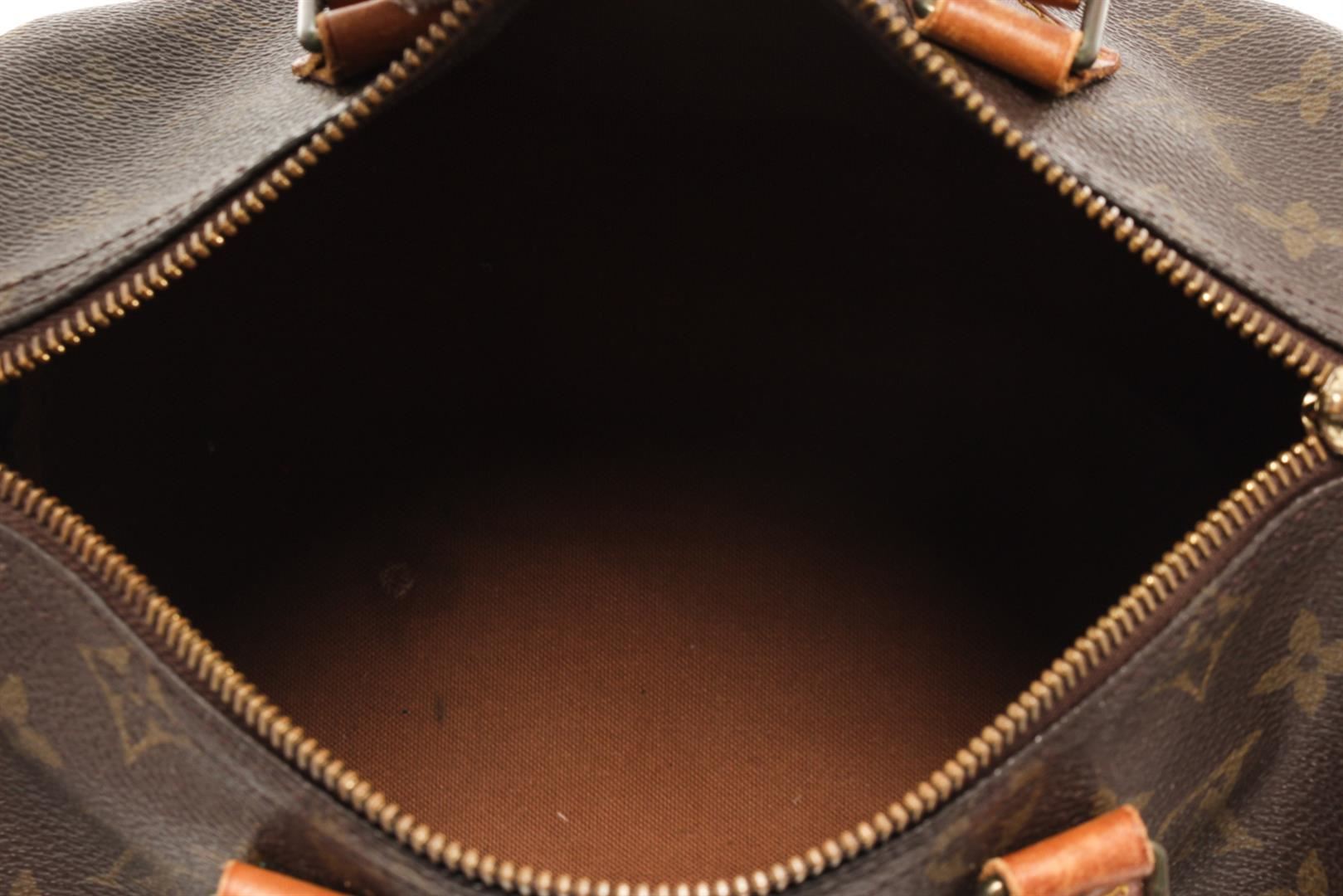 One Louis Vuitton Brown Monogram Speedy 25 Satchel Bag. Item is sold AS-IS. All available information is listed in the description and shown in the photo. Louis Vuitton Brown Monogram Speedy 25 Satchel Bag with gold tone hardware, brown printed, brass hardware, rolled handles, canvas lining & single interior pocket, zip closure at top. Height: 8", Width: 9.75", Depth: 5.5", Handle Drop: 3.75" / 20.32 x 24.76 x 13.97 Cm, Handle Drop: 9.52 CM