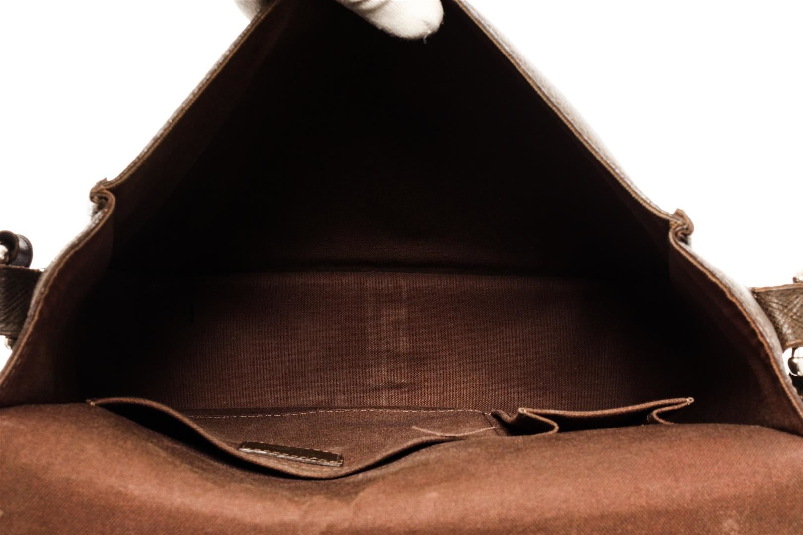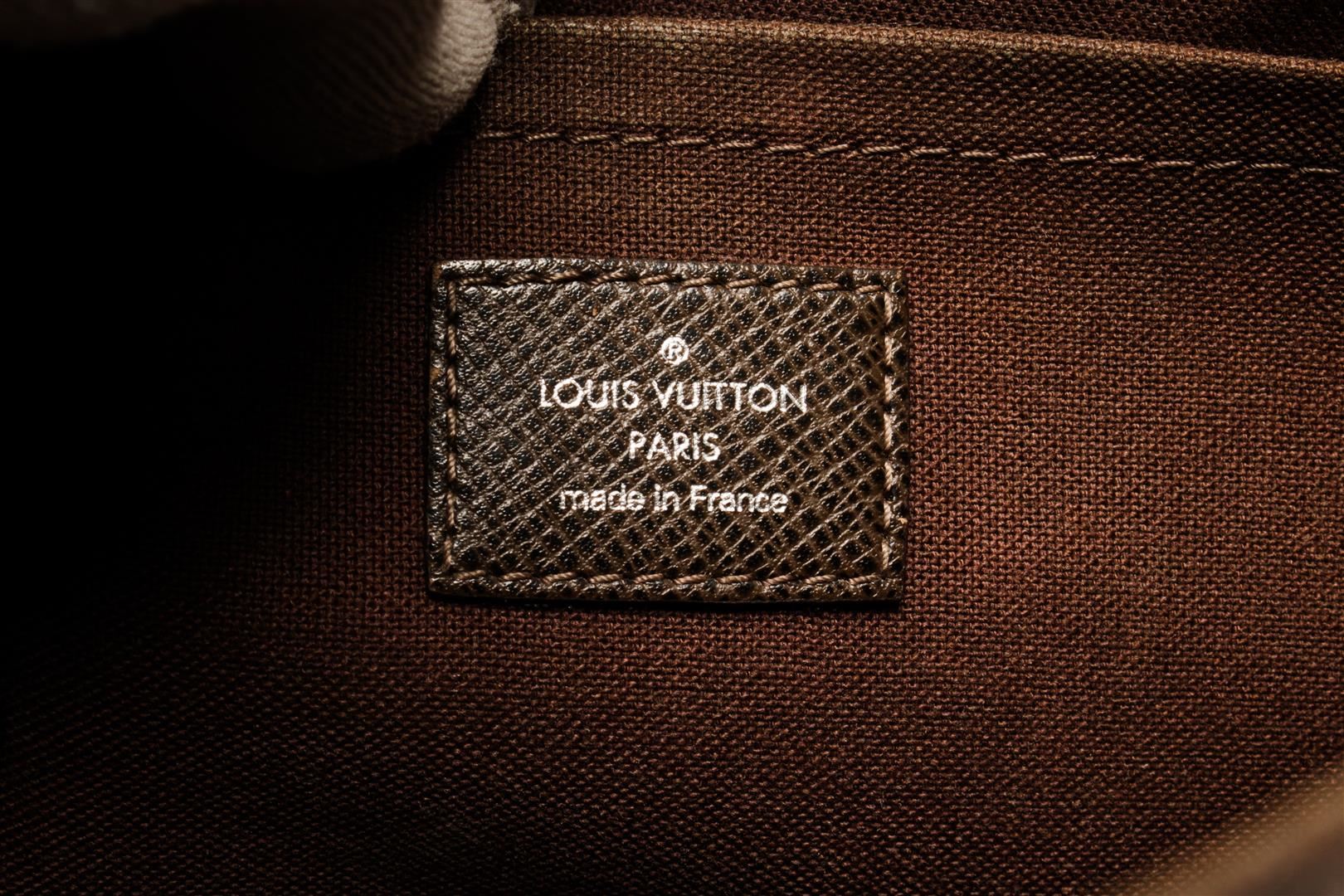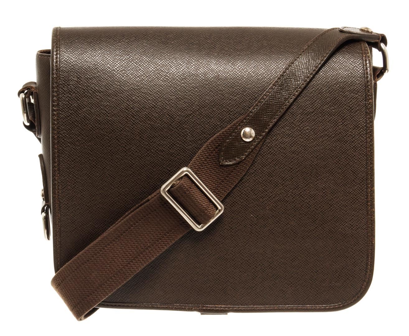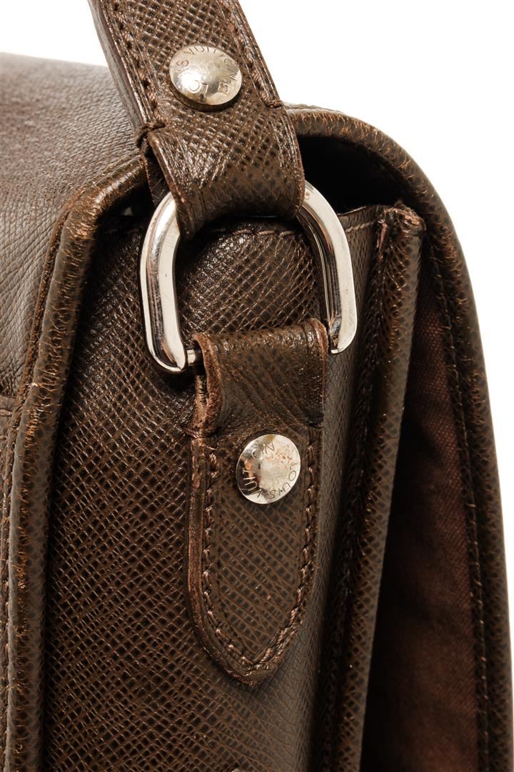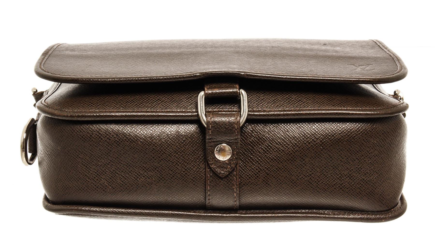 One Louis Vuitton Brown Taiga Leather Andrei Shoulder Bag. Item is sold AS-IS. All available information is listed in the description and shown in the photo. Louis Vuitton Brown Taiga Leather Andrei Shoulder Bag with silver tone hardware, brown leather trim, brown fabric lining, exterior back pocket, strap, and flap closure.