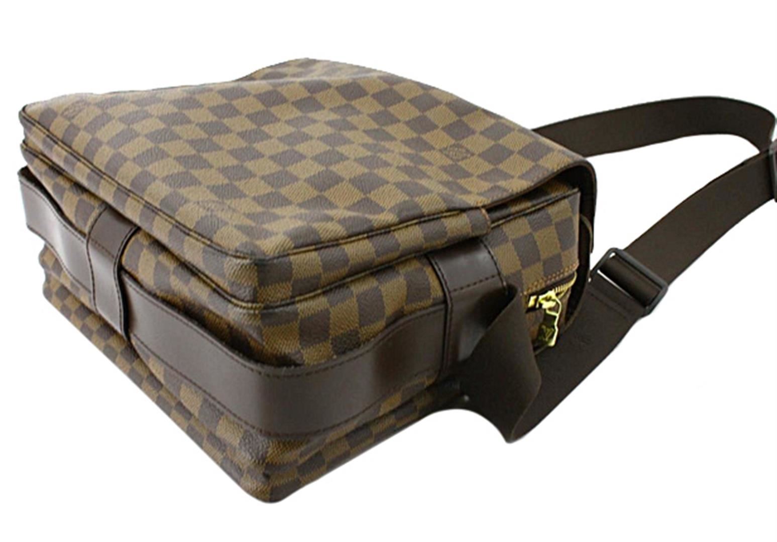 One Louis Vuitton Damier Ebene Canvas Leather Naviglio Messenger Bag. Item is sold AS-IS. All available information is listed in the description and shown in the photo. Brown Damier Ebene coated canvas Louis Vuitton Naviglio messenger bag with gold-tone hardware, dark brown leather trim, single adjustable flat shoulder strap, three interior compartments; one with zip closure, brown woven lining, single slip pocket at interior wall and dual snap closures at top. 13"x3"x11"xBag Drop:21"/33cmx7.6cmx27.9cmxBag Drop:53.3cm