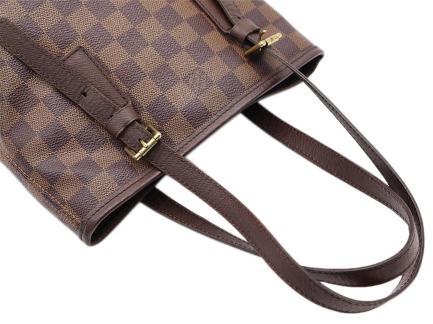 One Louis Vuitton Damier Ebene Marais Bucket Bag. Item is sold AS-IS. All available information is listed in the description and shown in the photo. Louis Vuitton Brown Damier Ebene coated canvas Marais Bucket Bag with gold tone hardware, brown taiga leather trim, red suede lining, zip interior pocket, brown leather dual top straps, and an open top closure