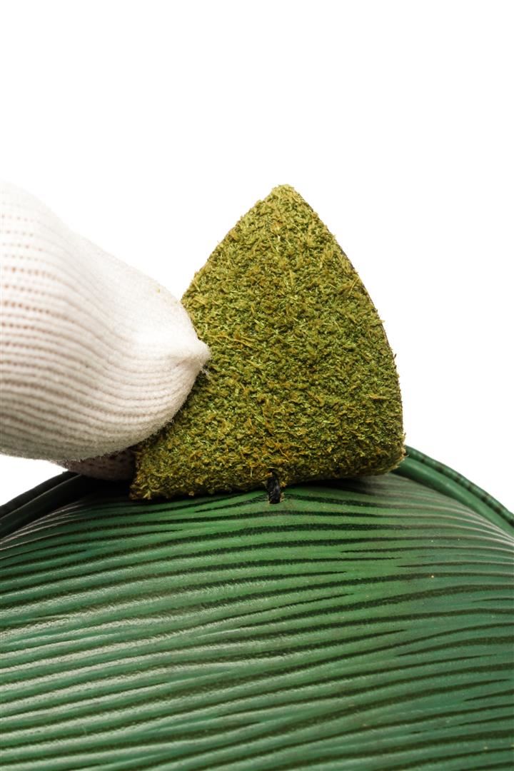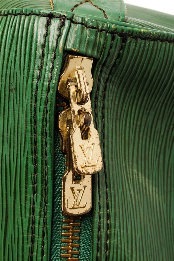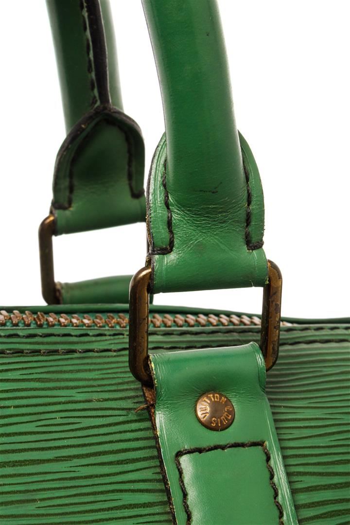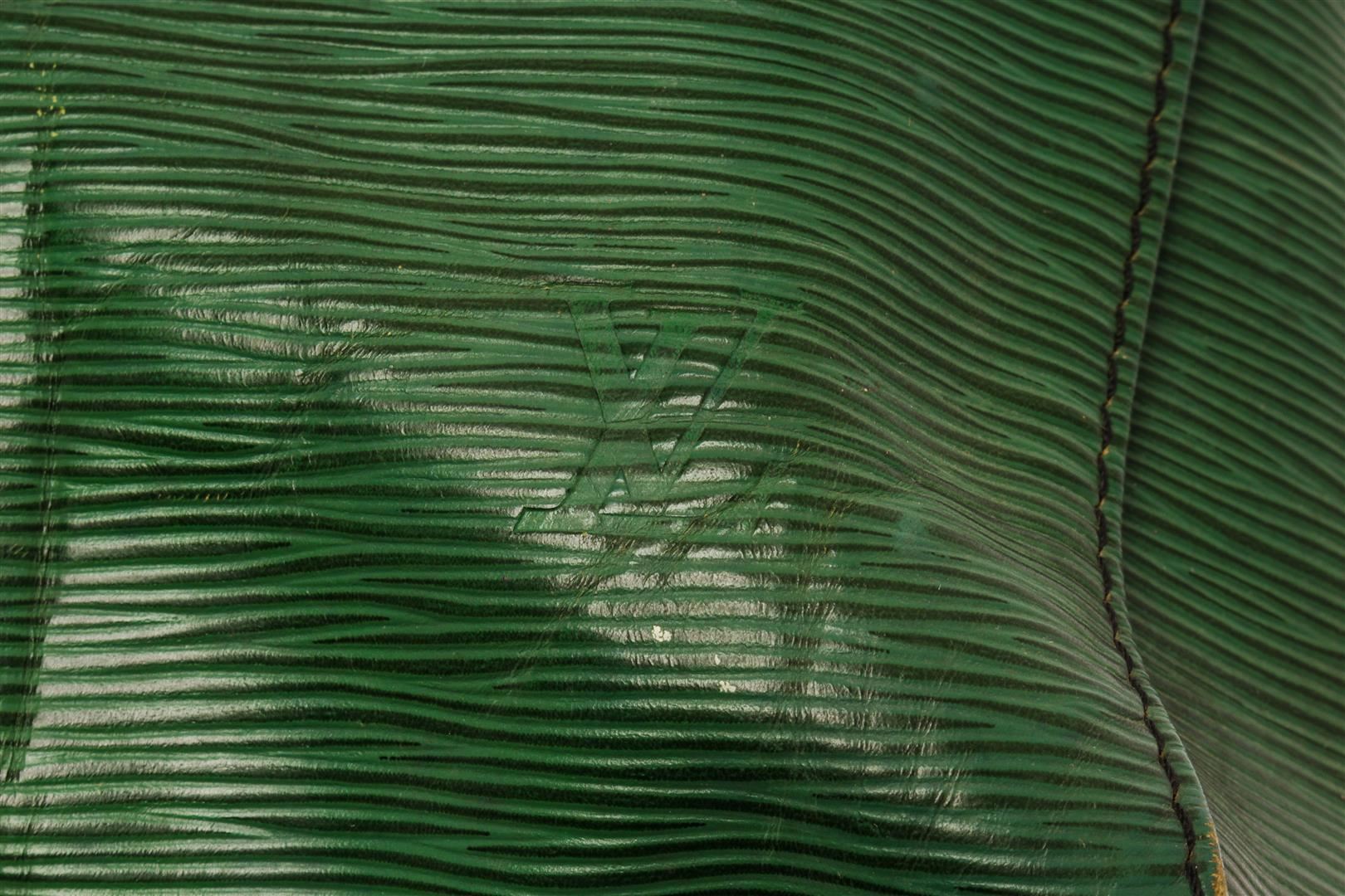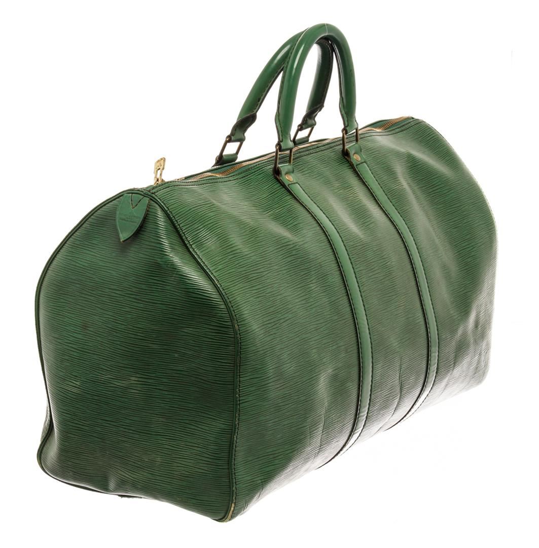 Louis Vuitton Green Epi Leather Keepall 50 Travel Bag. All available information is listed in the description and shown in the photos. Louis Vuitton Green Epi Leather Keepall 50 Travel Bag with gold-tone hardware, dual rolled top handles, handle holder, single exterior pocket, suede lining, luggage tag, two-way zip fastening, zipper closure at top. Condition Details: Creasing and scratches on front and back, wear/discoloration on bottom corners, slight tarnishing on the zipper pull, and staining inside of the bag. Height: 11" Width: 20" Depth: 8.5", Handle Drop: 4.5" / 27.94 x 50.8 x 21.59 cm