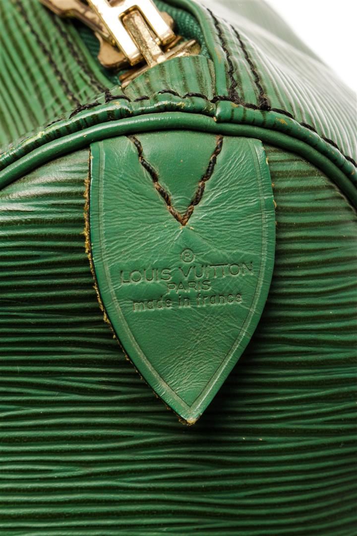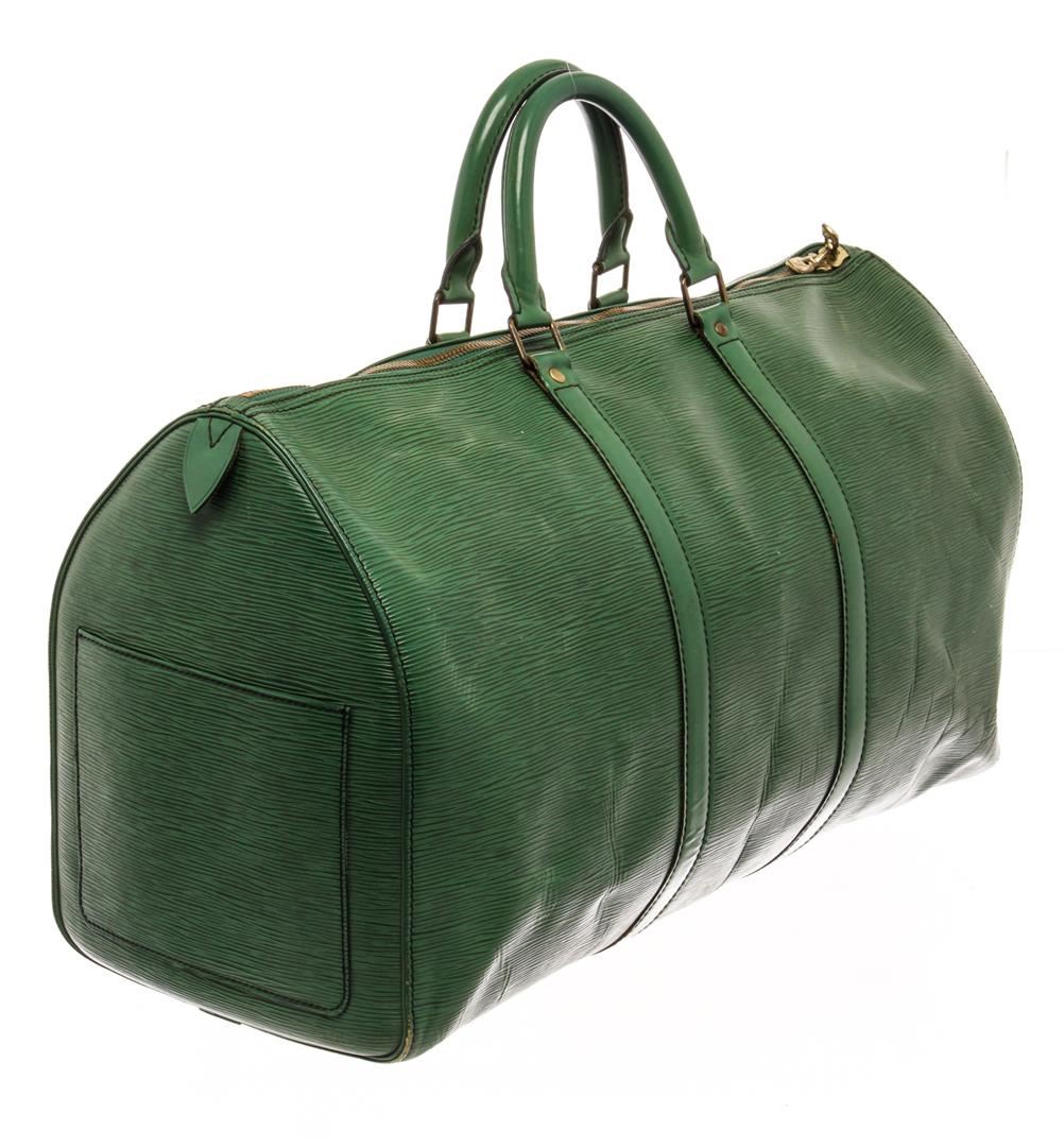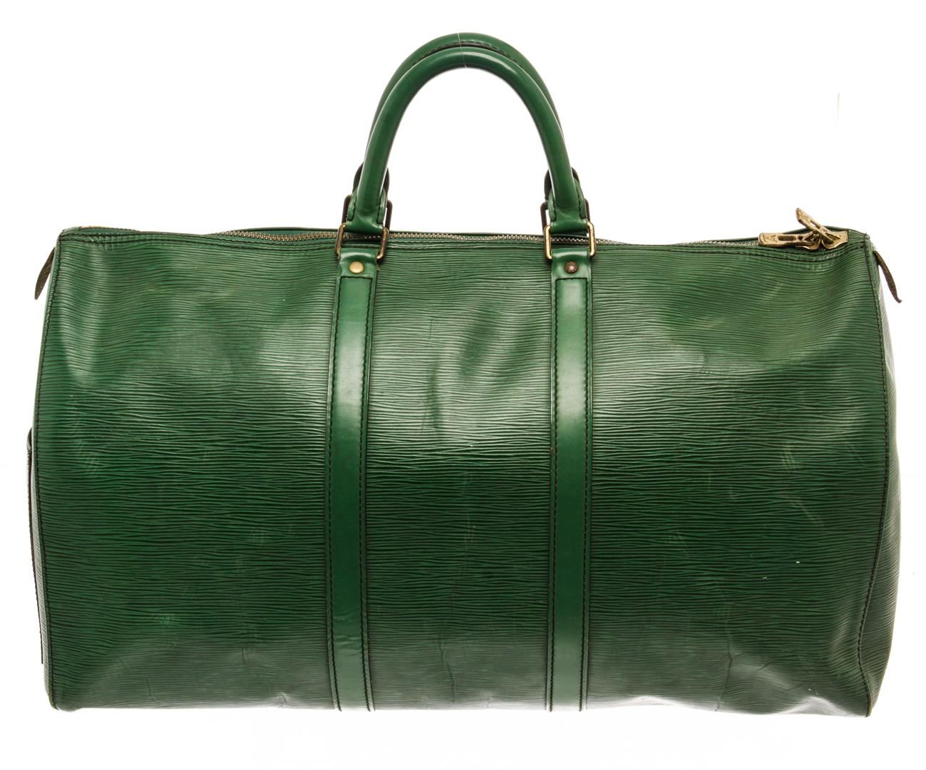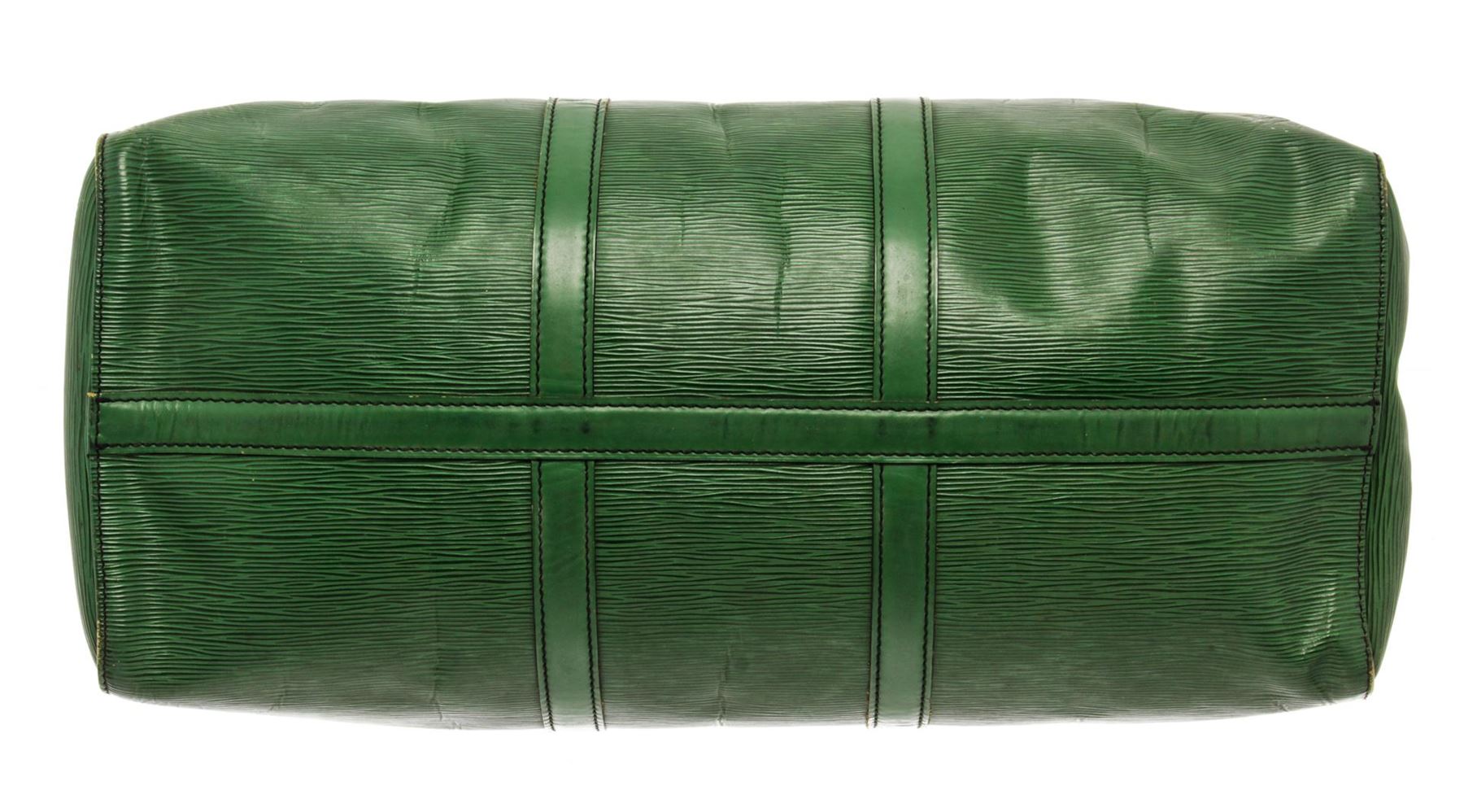 Louis Vuitton Green Epi Leather Keepall 50 Travel Bag. All available information is listed in the description and shown in the photos. Louis Vuitton Green Epi Leather Keepall 50 Travel Bag with gold-tone hardware, dual rolled top handles, handle holder, single exterior pocket, suede lining, luggage tag, two-way zip fastening, zipper closure at top. Condition Details: Creasing and scratches on front and back, wear/discoloration on bottom corners, slight tarnishing on the zipper pull, and staining inside of the bag. Height: 11" Width: 20" Depth: 8.5", Handle Drop: 4.5" / 27.94 x 50.8 x 21.59 cm