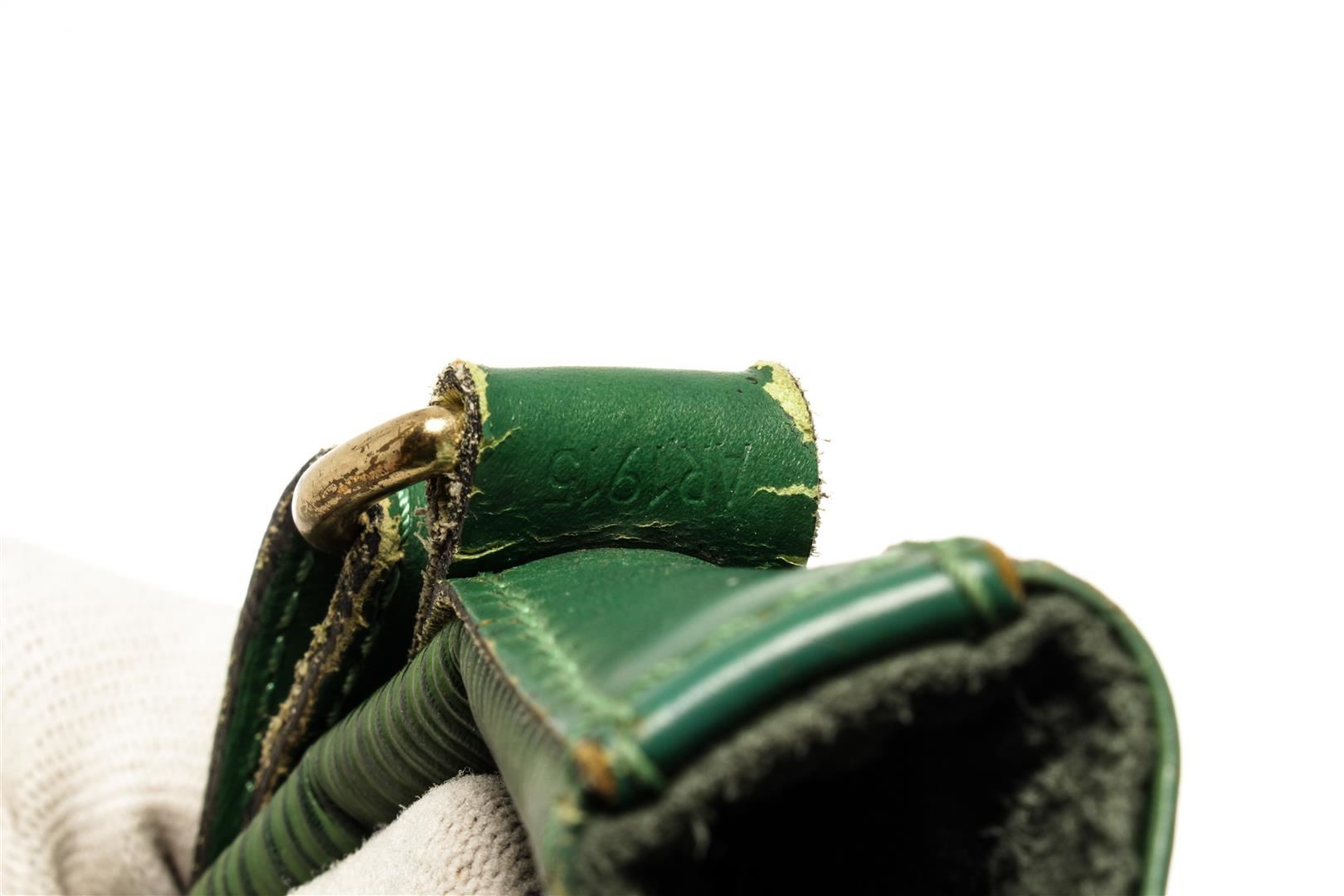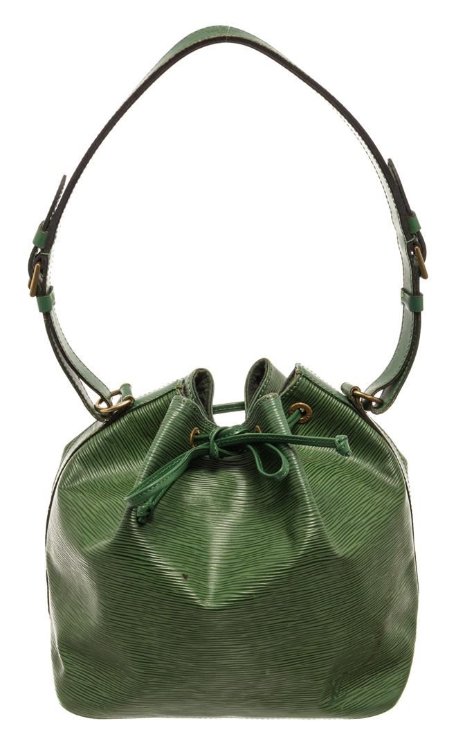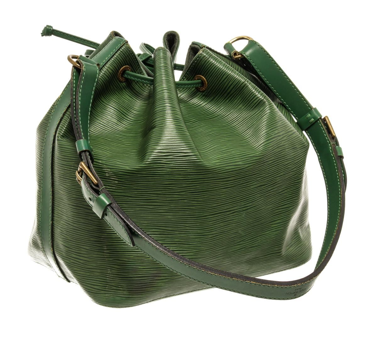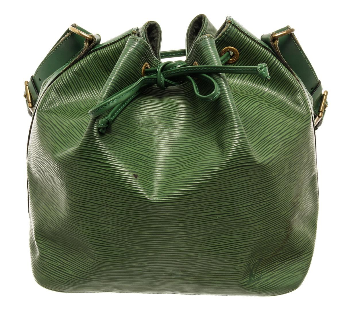 One Louis Vuitton Green Epi Leather Noe PM Bucket Bag. Item is sold AS-IS. All available information is listed in the description and shown in the photo. Louis Vuitton Green Epi Leather Noe PM Bucket Bag with adjustable shoulder strap, gold tone hardware, suede lining and drawstring closure.