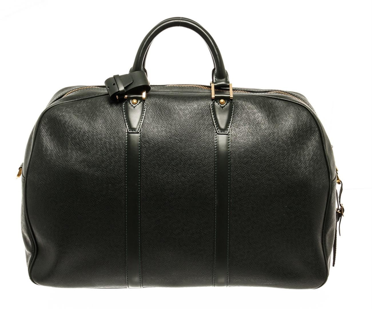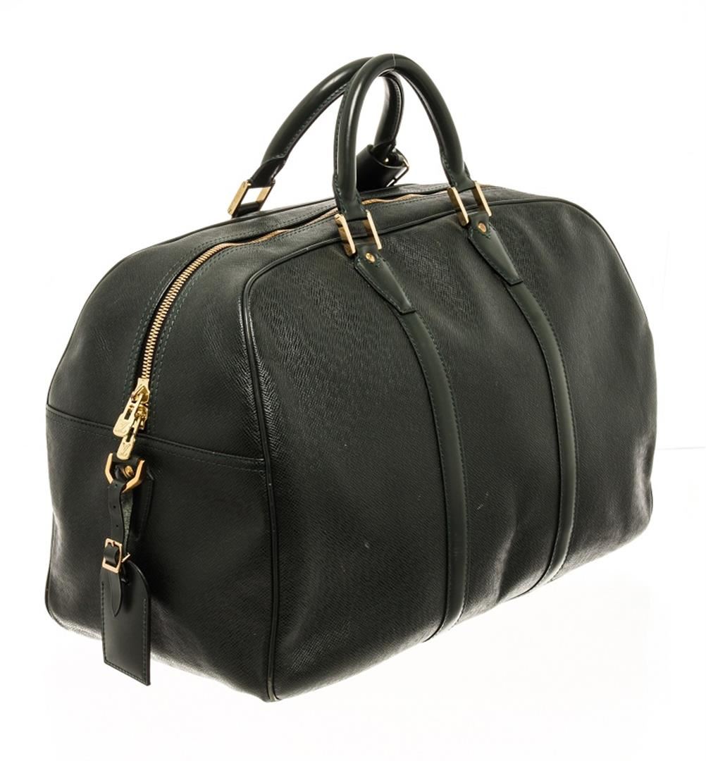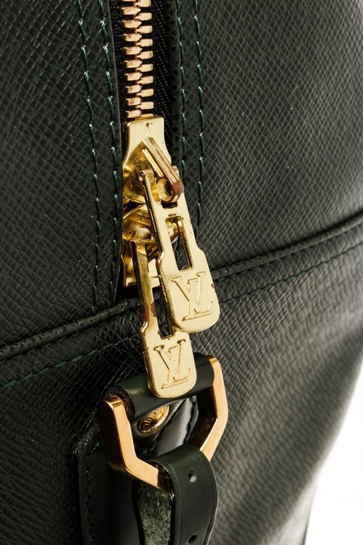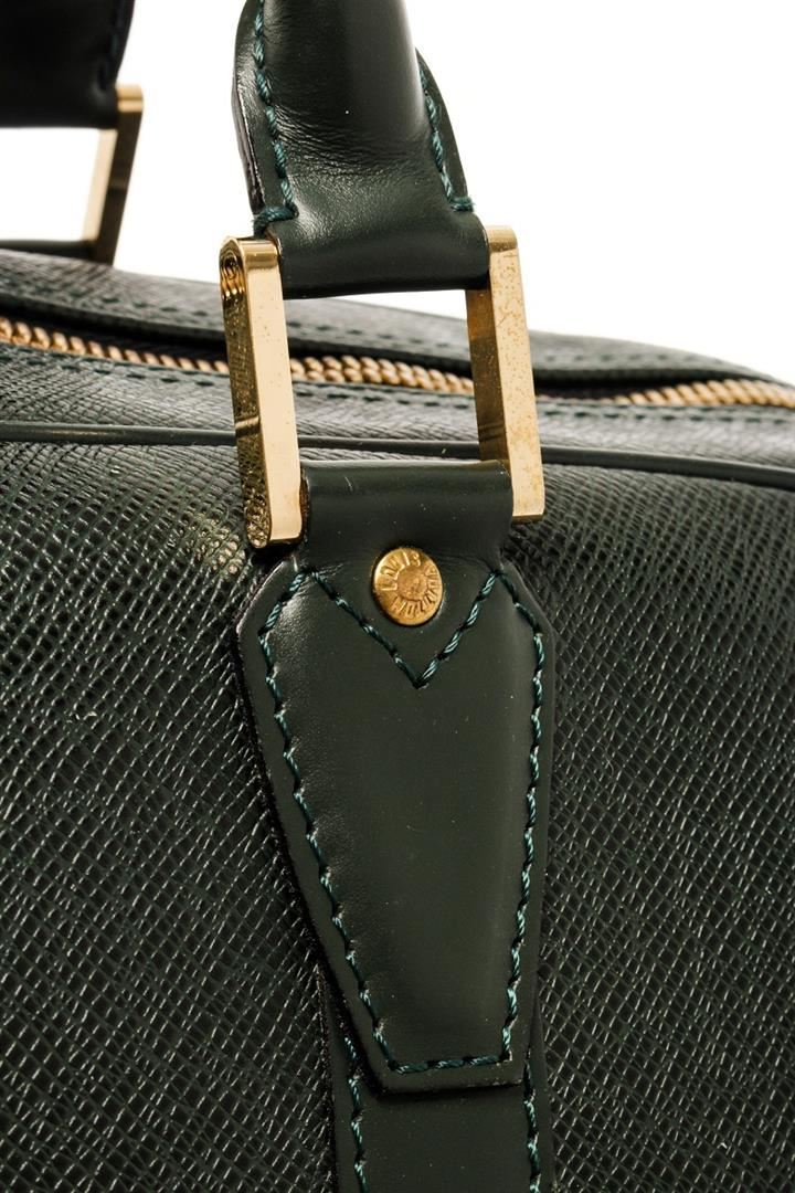 One Louis Vuitton Green Taiga Leather Kendall GM Bag. Item is sold AS-IS. All available information is listed in the description and shown in the photo. louis vuitton green taiga leather kendall gm bag with the kendall gm features a taiga leather body, rolled leather handles, and a top zip closure. Height: 12.6" Width: 17.7" Depth: 8.7, Handle Drop: 4.7" / 32 x 44.95 x 22.09 Cm