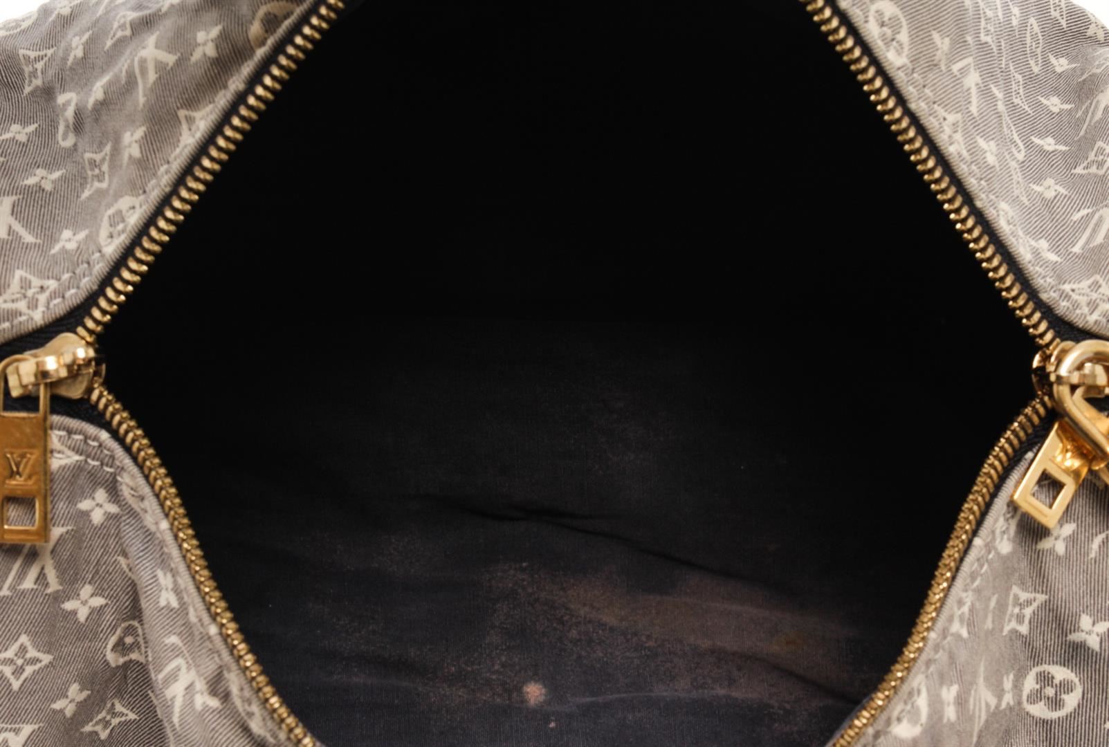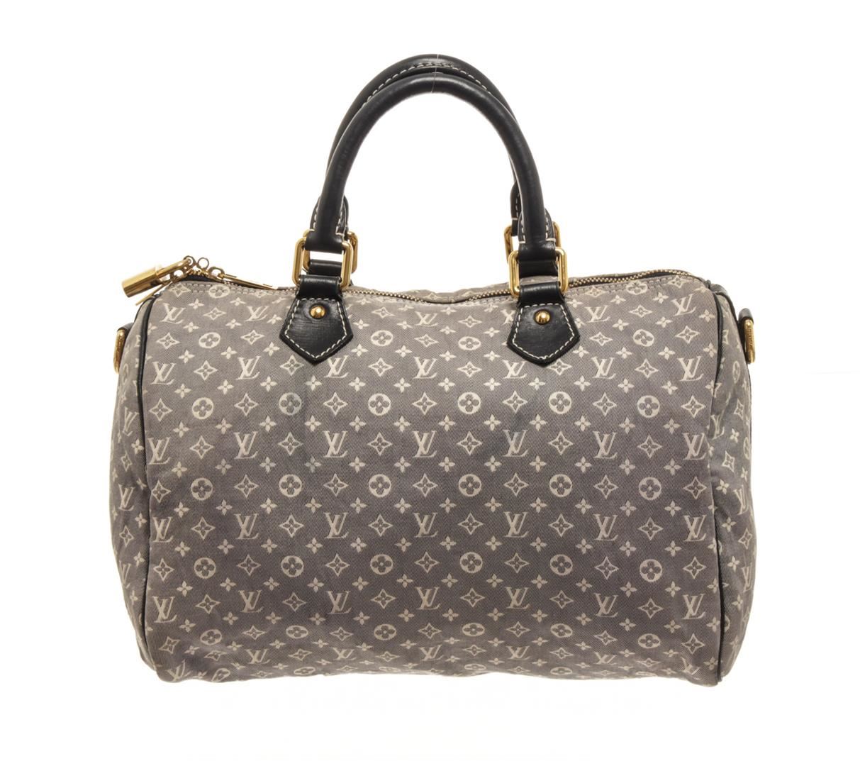 One Louis Vuitton Grey Monogram Mini Lin Speedy Bandouliere 30 Boston Bag. Item is sold AS-IS. All available information is listed in the description and shown in the photo. Louis Vuitton Grey Monogram Mini Lin Speedy Bandouliere 30 Boston Bag with blue top handle, gold tone hardware, zipper closure, lock and fabric lining. This does not come with a strap, the lining is stained, there is a burn whole on the exterior fabric. Please refer to photos. Dimensions: 20.5cm x 30.5cm x 18cm / 8.07" X 12.00" X 7.08" Inches