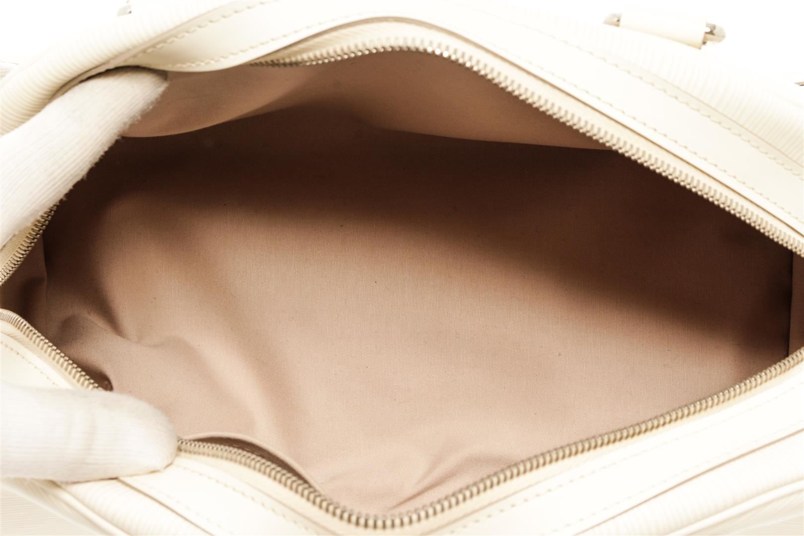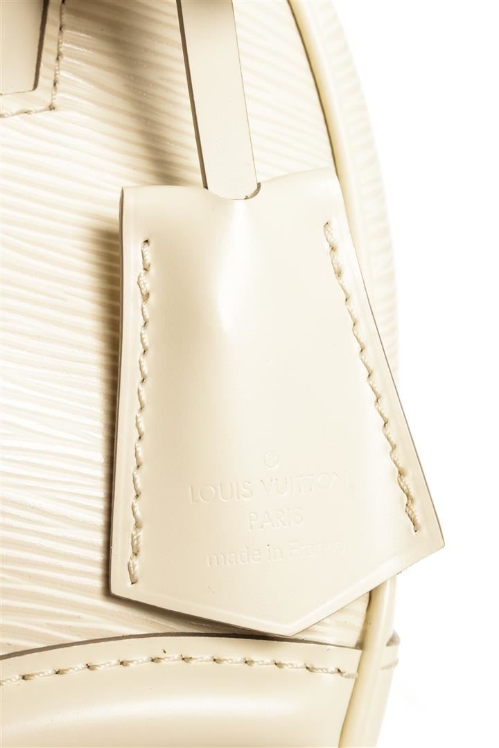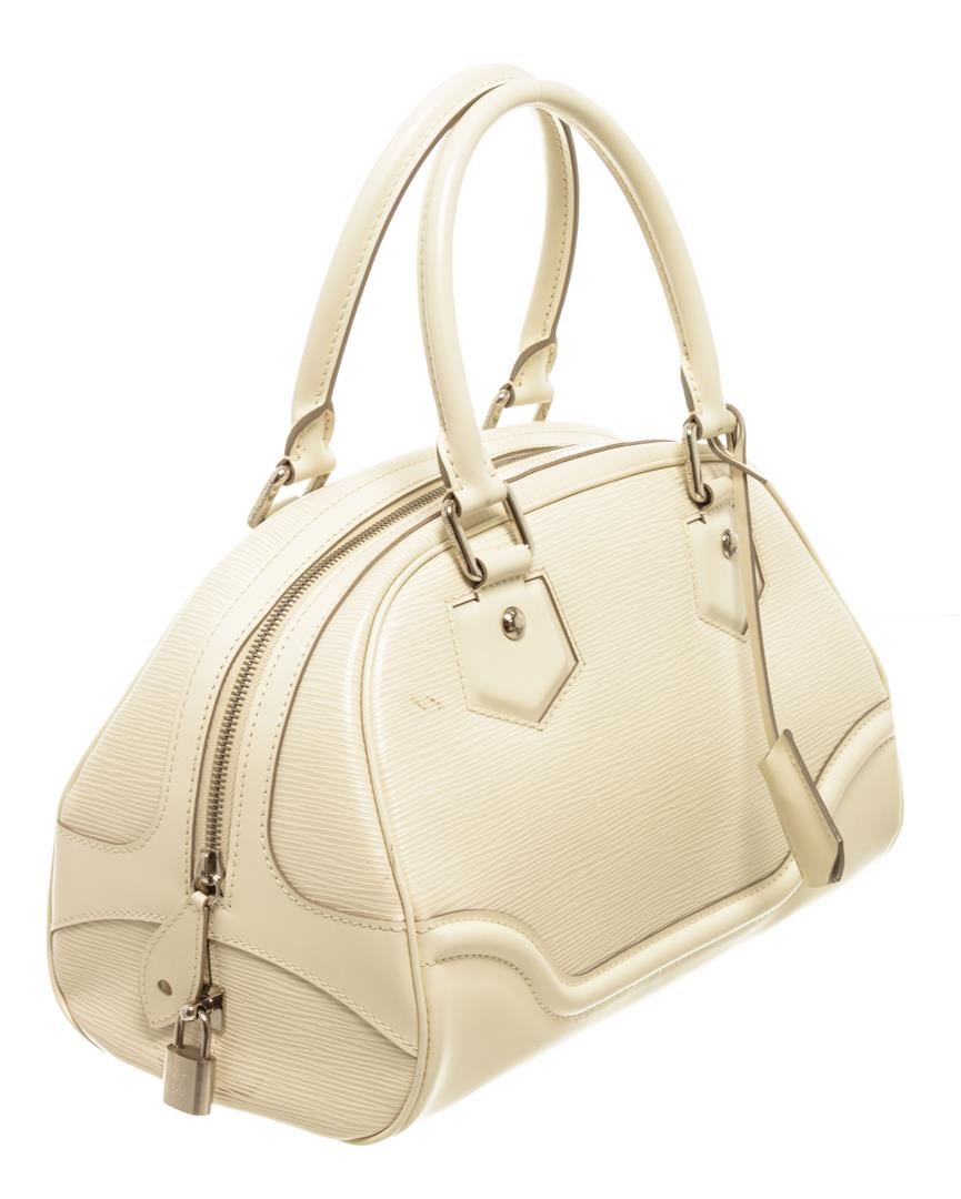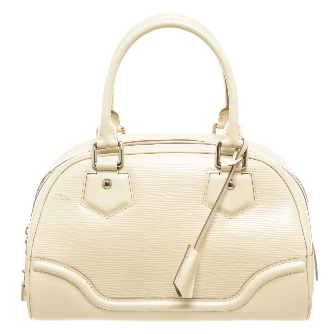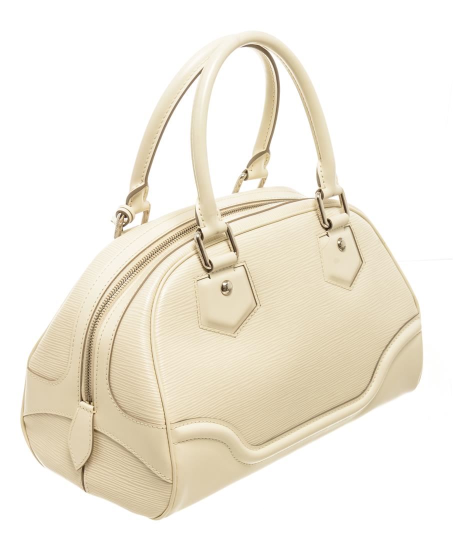 One Louis Vuitton Ivory Epi Leather Bowling Montaigne PM Bag. Item is sold AS-IS. All available information is listed in the description and shown in the photo. Ivory Epi leather Louis Vuitton Bowling Montaigne PM with silver-tone hardware, LV padlock, dual rolled leather top handles, light beige canvas lining, dual pockets at interior walls and zip closure at top. .