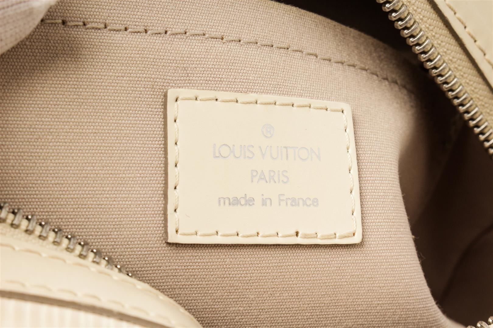Louis Vuitton Ivory White Epi Leather Bowling Montaigne BB Tote Bag. All available information is listed in the description and shown in the photos. Louis Vuitton Ivory White Epi Leather Bowling Montaigne BB Tote Bag with signature epi texture, silver-tone hardware, leather key fob, metal feet, top zip fastening, two rounded top handles, internal slip pocket, internal logo patch, full lining. Condition Details: Some surface scuffing and wear on bottom and corners. Depth 7.1 in, Height 9.1 in, Width 13 in, Handle 6 in / Depth 18.034 cm, Height 23.114 cm, Width 33.02 cm, Handle 15.24 cm