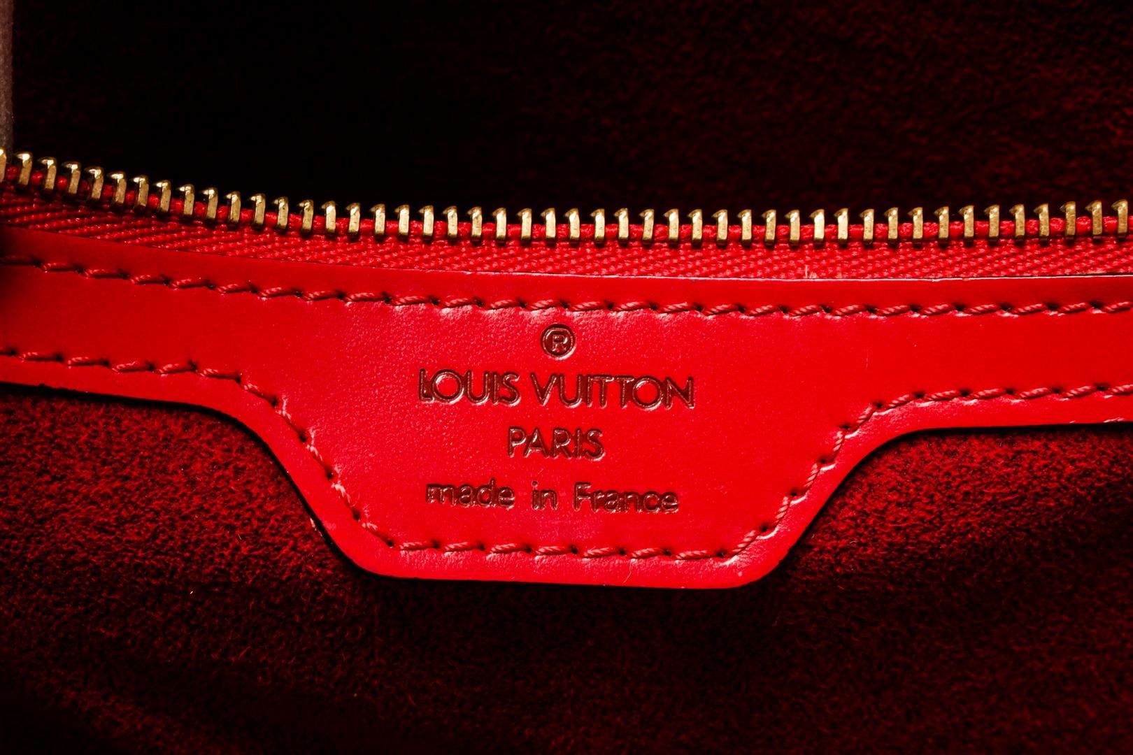 One Louis Vuitton Red Epi Leather Lussac Shoulder Bag. Item is sold AS-IS. All available information is listed in the description and shown in the photo. louis vuitton red epi leather lussac shoulder bag with gold tone hardware, adjustable strap. Height: 30.48 cm (12 in), Width: 36.83 cm (14.5 in), Depth: 11.43 cm (4.5 in)