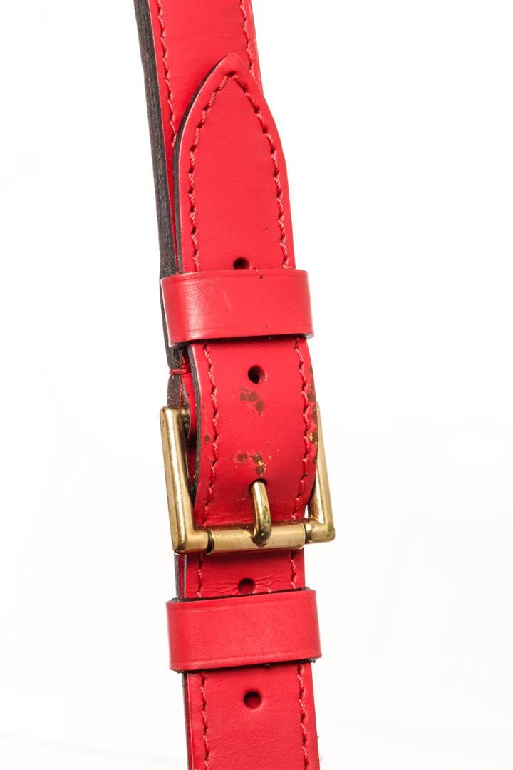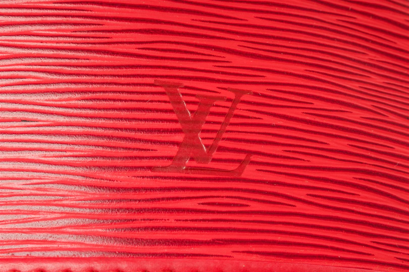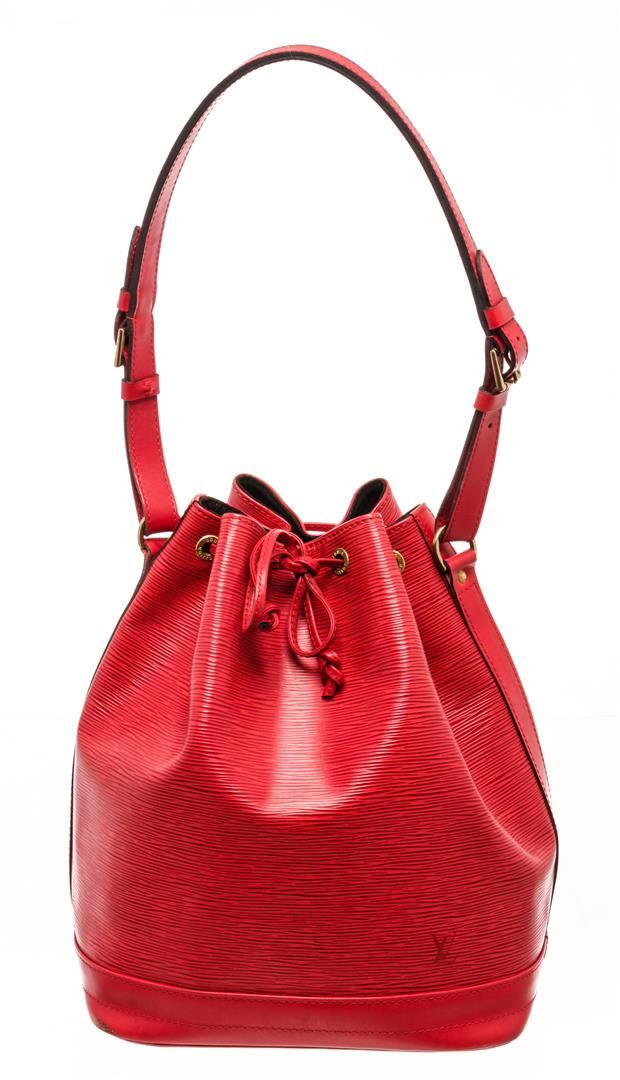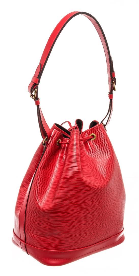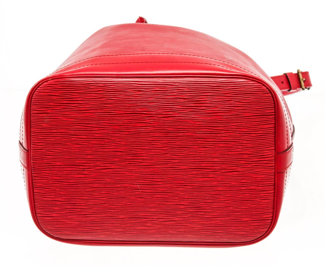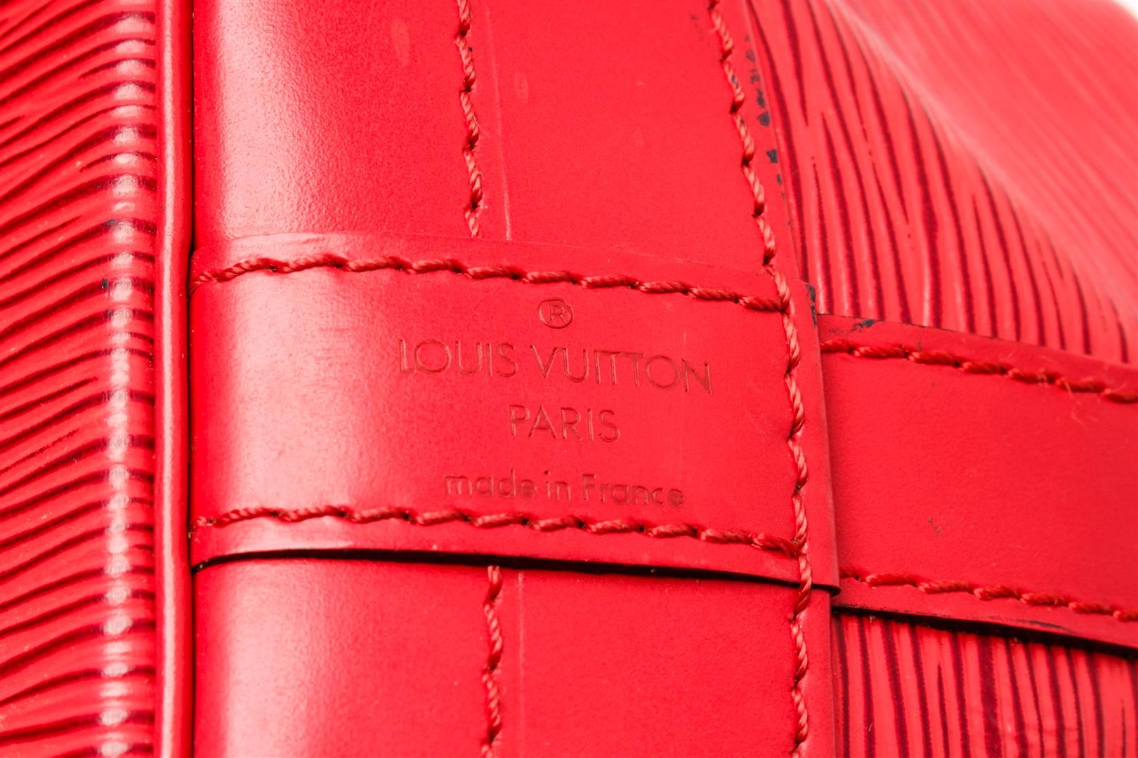 Louis Vuitton Red Epi Leather Noe Shoulder Bag. All available information is listed in the description and shown in the photos. Louis Vuitton Red Epi Leather Noe Shoulder Bag with red epi leather, printed, gold-tone hardware, single adjustable shoulder strap, alcantara lining, drawstring closure at top Height: 10" Width: 13.5" Depth: 7.25" Shoulder Strap Drop Min: 9" / Height: 25.4 cm Width: 34.29 cm Depth: 18.41 cm Shoulder Strap Drop Min: 22.86 cm