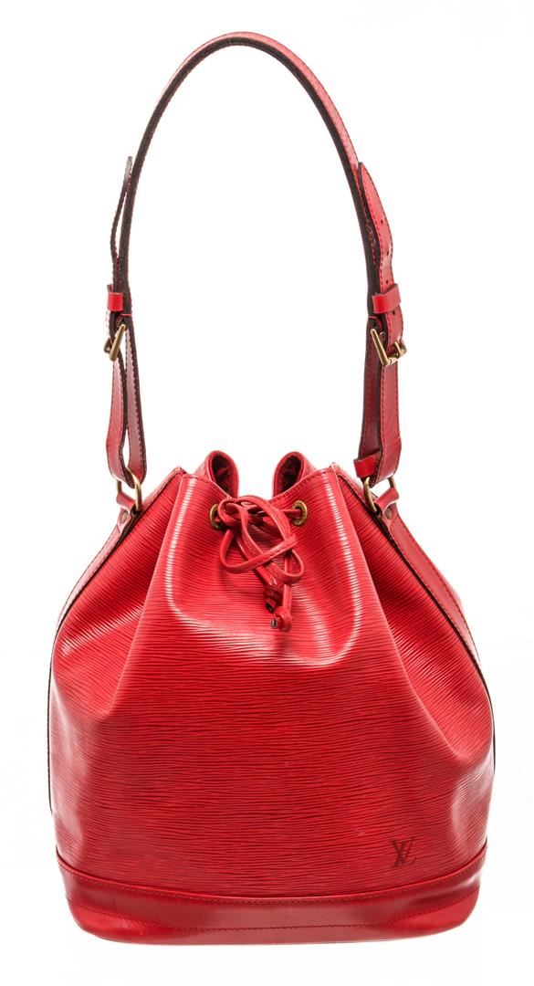 Louis Vuitton Red Epi Leather Noe Shoulder Bag. All available information is listed in the description and shown in the photos. Louis Vuitton Red Epi Leather Noe Shoulder Bag with red epi leather, printed, gold-tone hardware, single adjustable shoulder strap, alcantara lining, drawstring closure at top. Height: 13.5" Width: 10.5" Depth: 7.25" Shoulder Strap Drop: 9" / Height: 34.29 cm Width: 26.67 cm Depth: 18.41 cm Shoulder Strap Drop: 22.86 cm