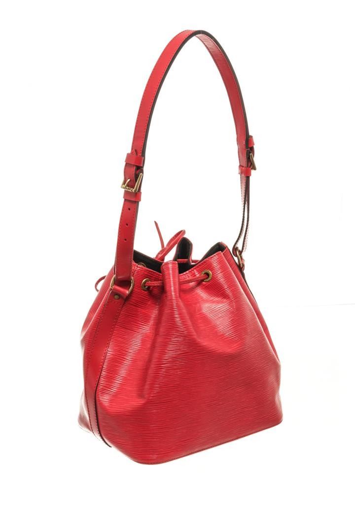 Louis Vuitton Red Epi Leather Petit Noe Bucket Bag. All available information is listed in the description and shown in the photos. louis vuitton red epi leather petit noe bucket bag with the petit noe features an epi leather body, an adjustable shoulder strap, and a drawstring closure. Height: 10.6" Width: 9.4" Depth: 5.9", Handle Drop: / 26.92 x 23.87 x 18.03 Cm