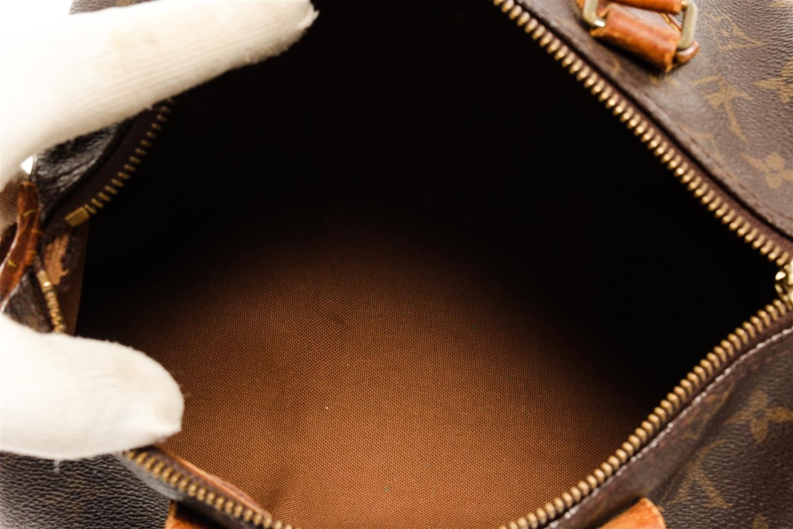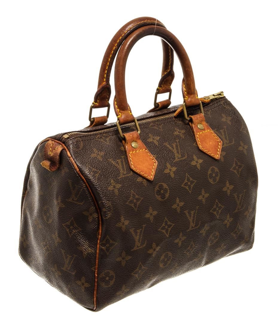 One Louis Vuitton Speedy 25 Handbag. Item is sold AS-IS. All available information is listed in the description and shown in the photo. Louis Vuitton Speedy 25 cm handbag with monogram coated canvas exterior, vanchetta leather top handles, brown fabric lining, one interior slip pocket, top zip closure, and gold-tone hardware.