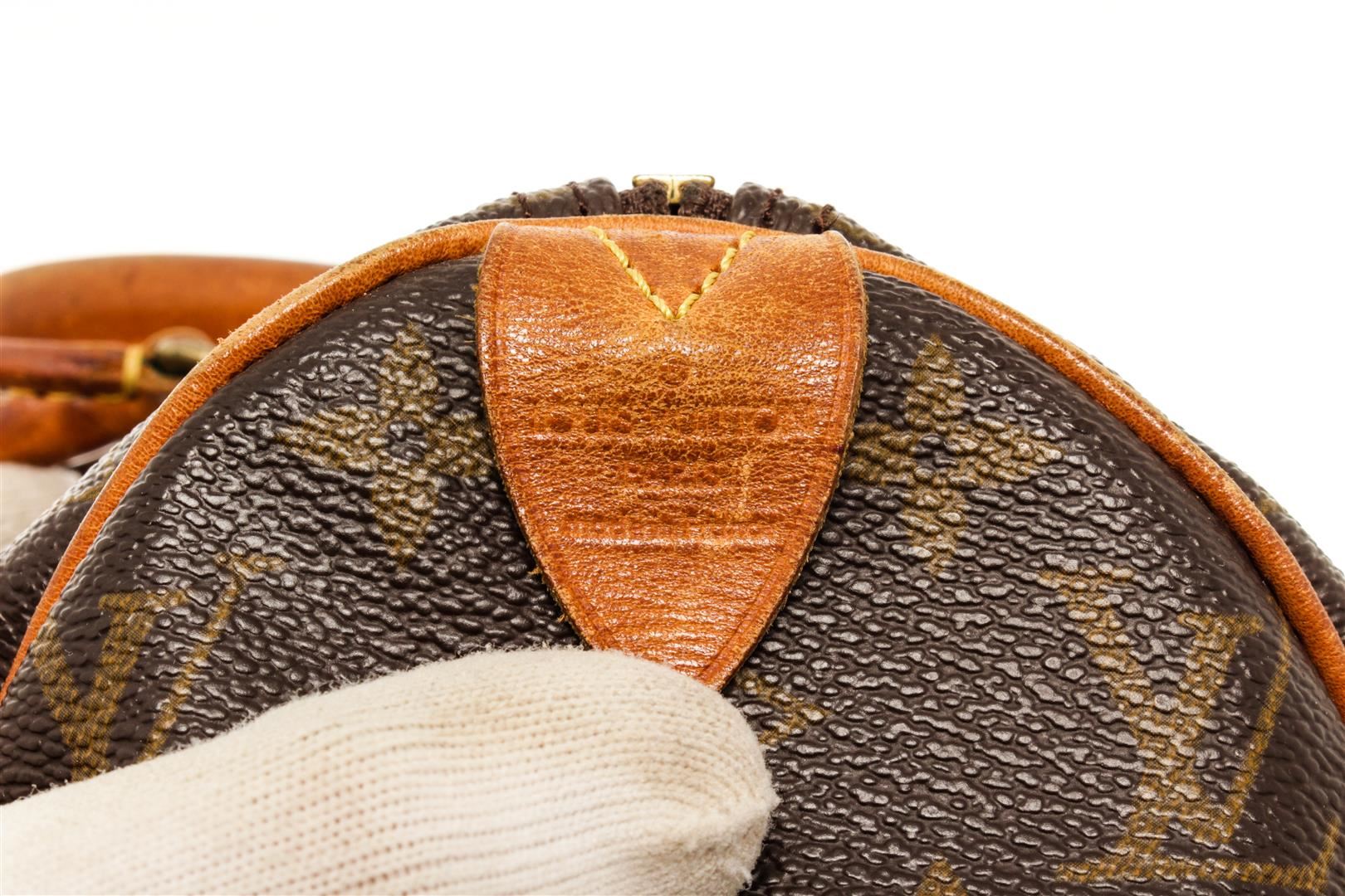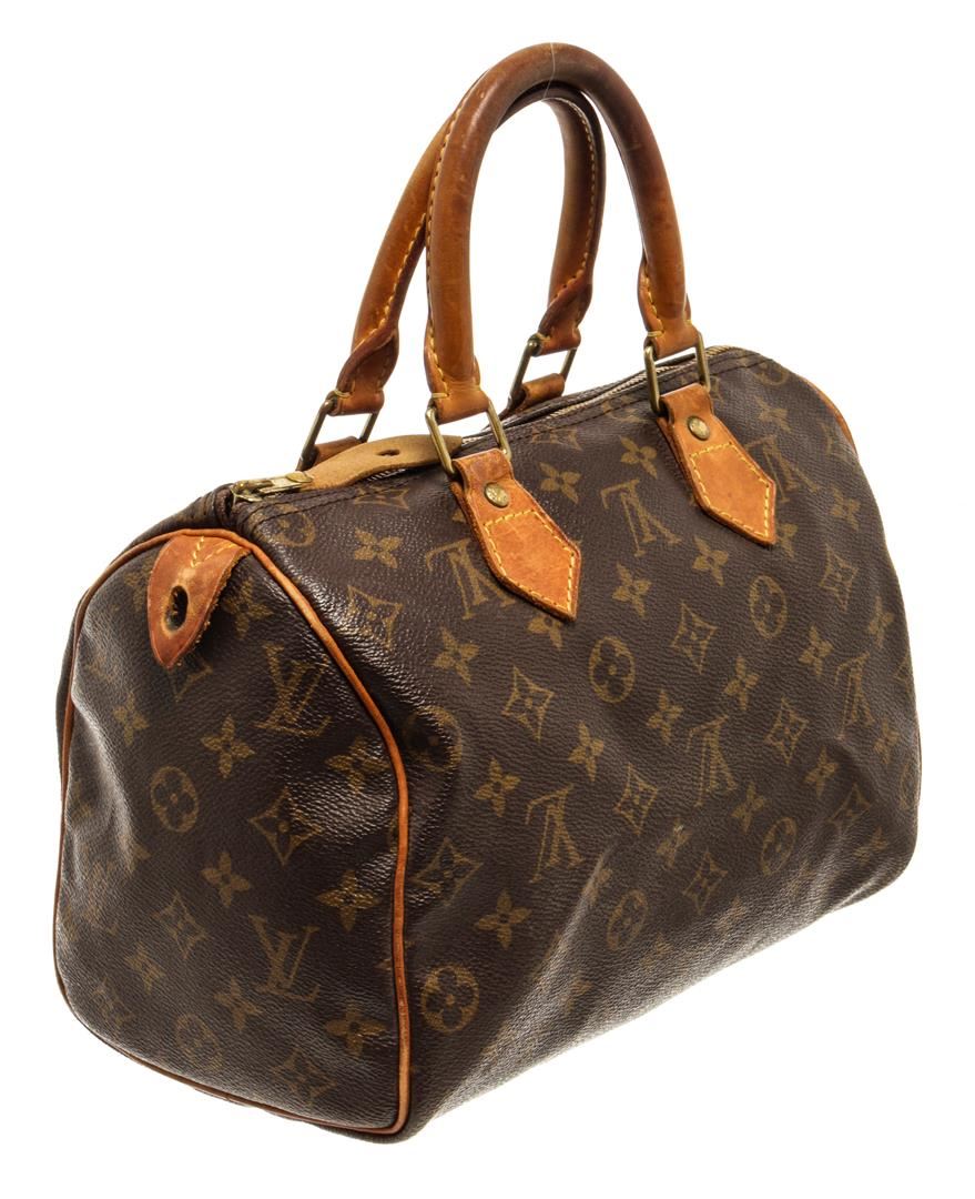 One Louis Vuitton Speedy 25 cm Handbag. Item is sold AS-IS. All available information is listed in the description and shown in the photo. Louis Vuitton Speedy 25 cm handbag with monogram coated canvas exterior, vanchetta leather top handles, brown fabric lining, one interior slip pocket, top zip closure, and gold-toned hardware.