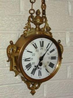 Louis XVI Brass Military Hanging Clock, 13" tall, 9 1/2" wide; damage to porcelain face & brass clock case
