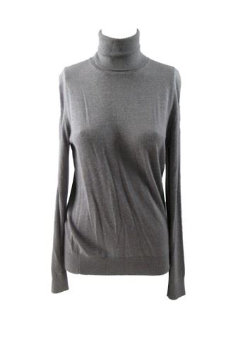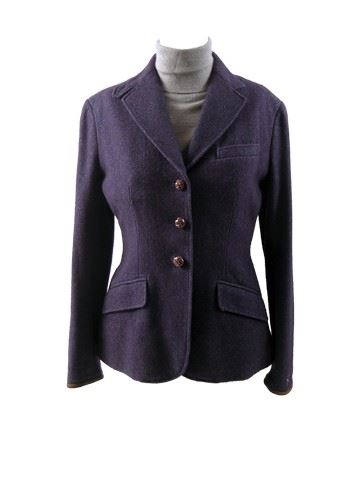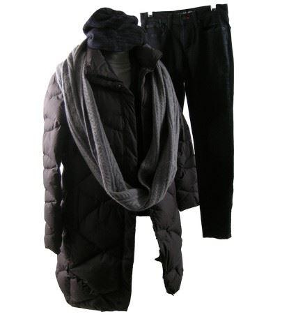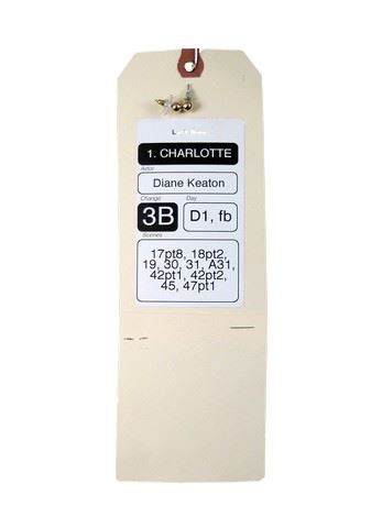 Charlotte (Diane Keaton) screen worn, hero, black medium length quilted puffy zipper front with snap buttons 'The North Face' jacket, (size XL) navy blue with bright blue stitching three leather button 'Double RL and CO Ralph Lauren' blazer, (size 4) medium heather grey cashmere long sleeve 'Ralph Lauren' turtleneck top, (size L) blue and black horizontally woven knit 'The Men's Store Bloomingdales' hat, pearl grey cable knit cashmere 'Vince' scarf, stud earrings, and dark wash with red buttonholes 'Ralph Lauren' jeans. (size 28) Includes wardrobe tag. Diane Keaton wardrobe is very rare in the memorabilia industry.