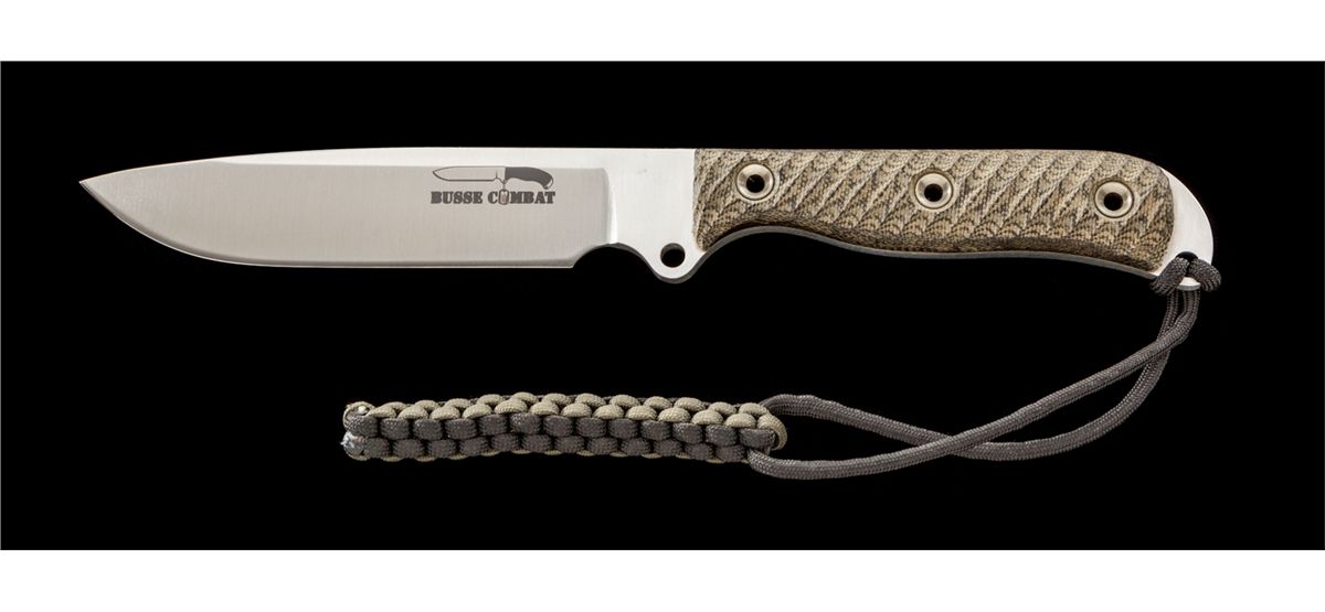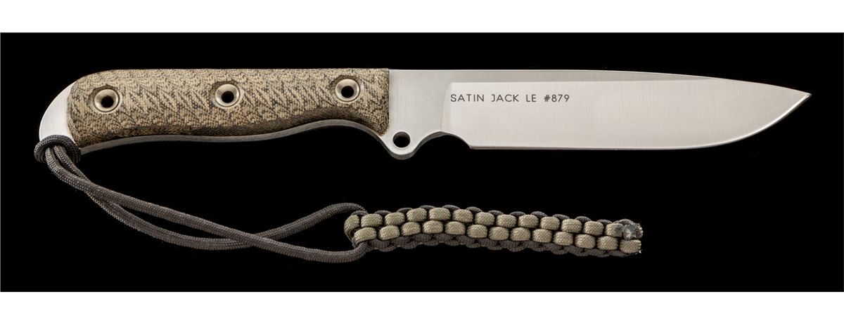 Limited Edition Busse Combat Knife, Model ''Satin Jack LE''. Mfg'd in 2001. Stainless steel blade measures 6-3/8'' and is marked ''BUSSE COMBAT'' with the reverse marked ''SATIN JACK LE #879''. Overall length is 11-1/2''. Textured micarta handle with a green and grey paracord wrist thong. Condition is excellent and as new, showing no use. Est.: $350-$550.