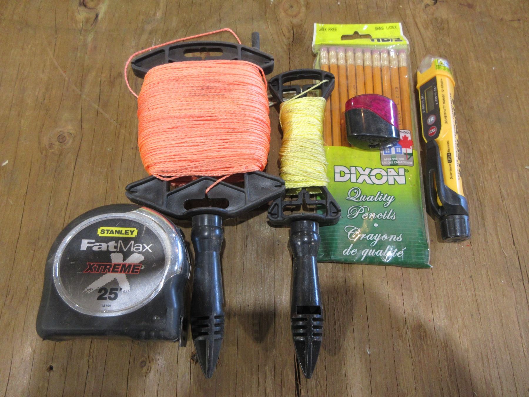 MARKING STRING, PENCILS, STANLEY 25' TAPE MEASURE, KLEIN TOOLS VOLTAGE TESTER
