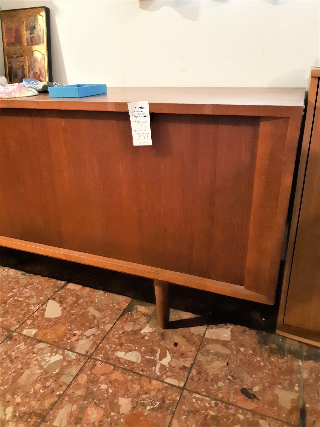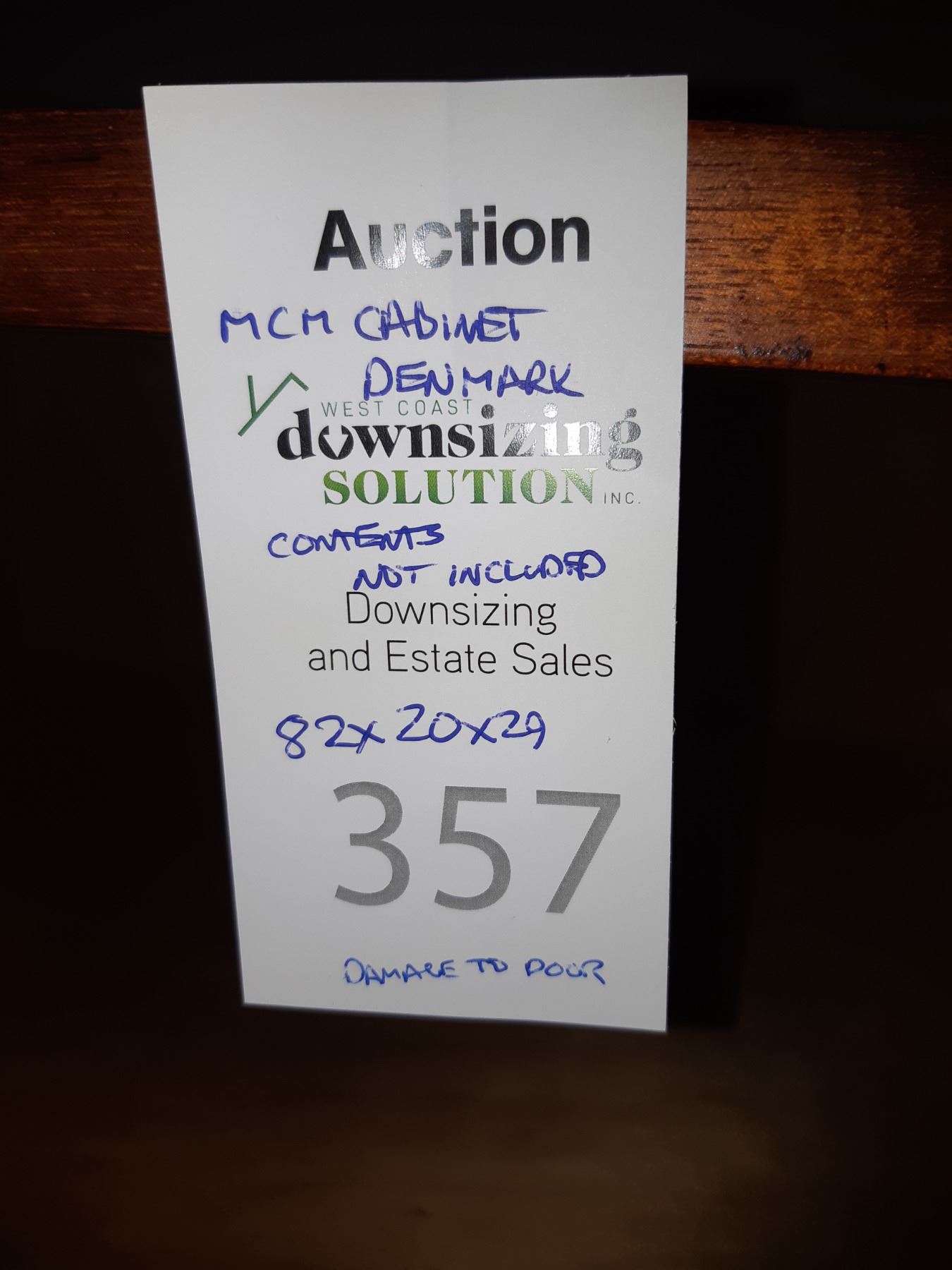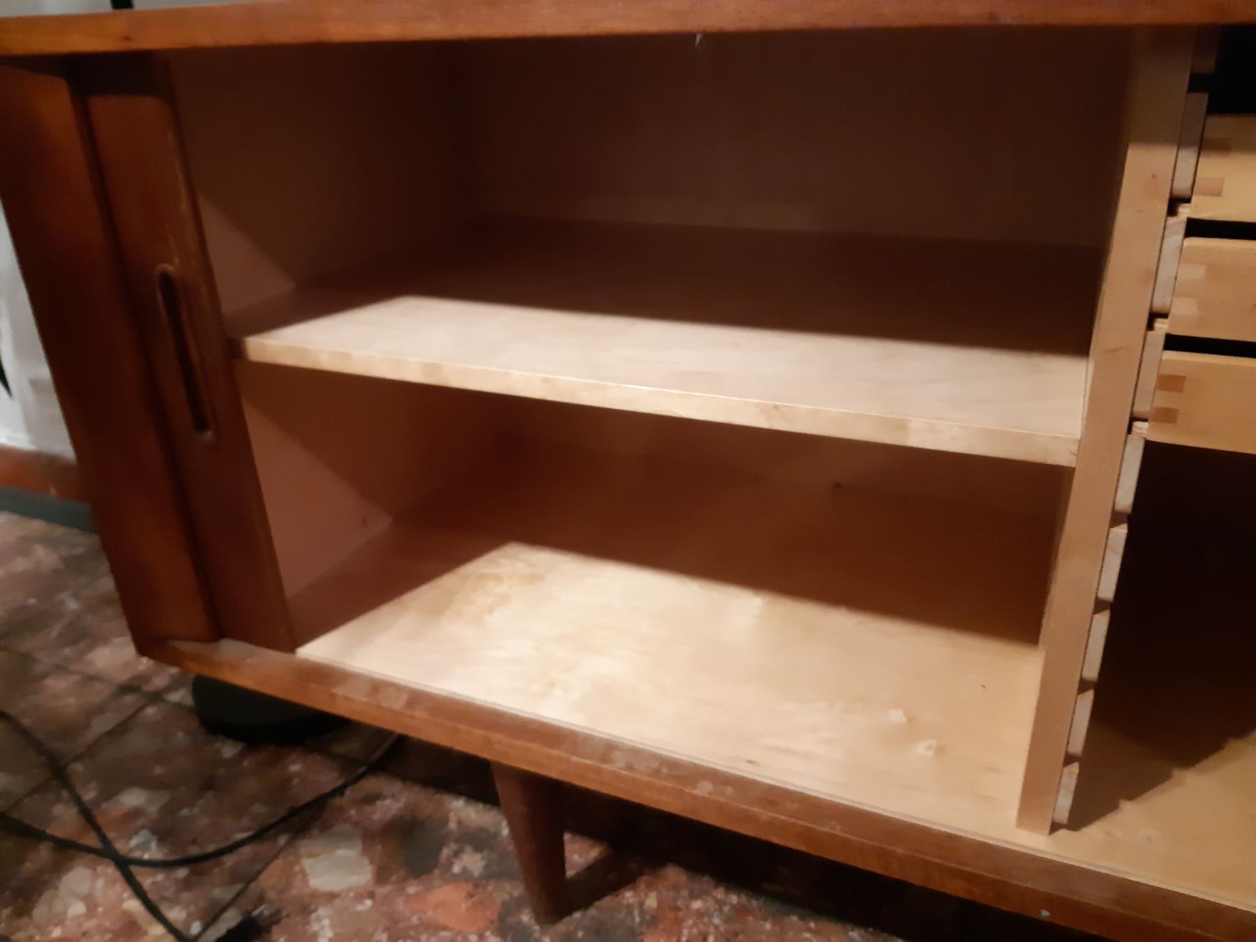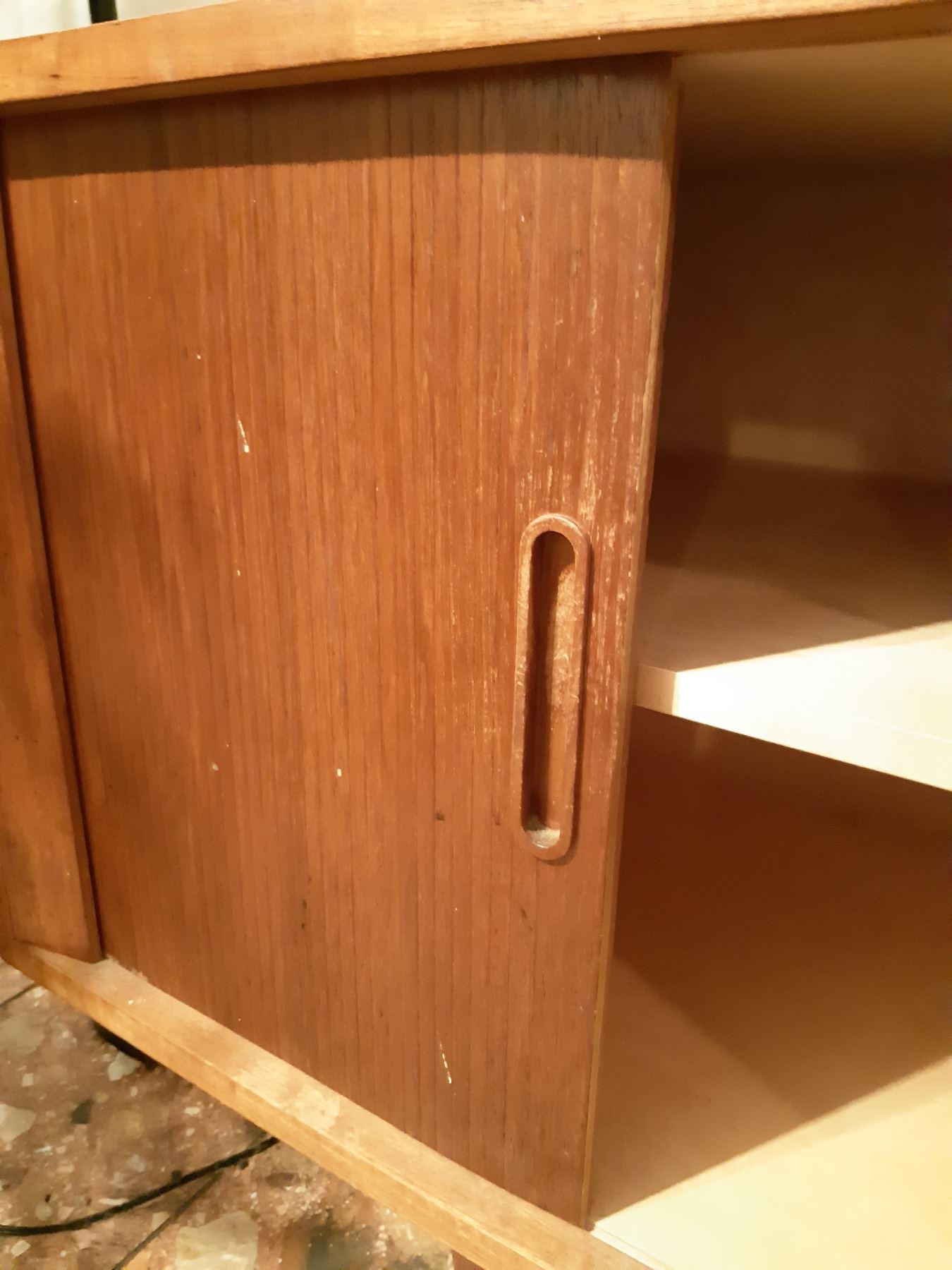 Made in Denmark, has 2 Sliding doors, note the right door needs minor repair. Note scratches and marks 82x20x29 bring help to remove and pickup at 11 am