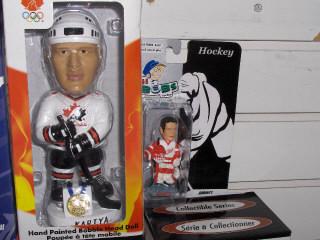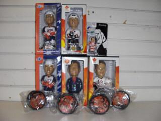 This lot contains Team Canada Salt Lake City Olympic Bobbleheads of Gretzky, Kariya and Curtis Joseph. Team U.S. Olympic Team Bobbleheads of Modano and Drury. A mini Curtis Joseph Detroit Red Wings bobblehead as well a bonus of 4 McDonald's Team Canada Pucks including Gretzky, Sakic and Kariya and 2 Pronger and Niedermayer pucks.