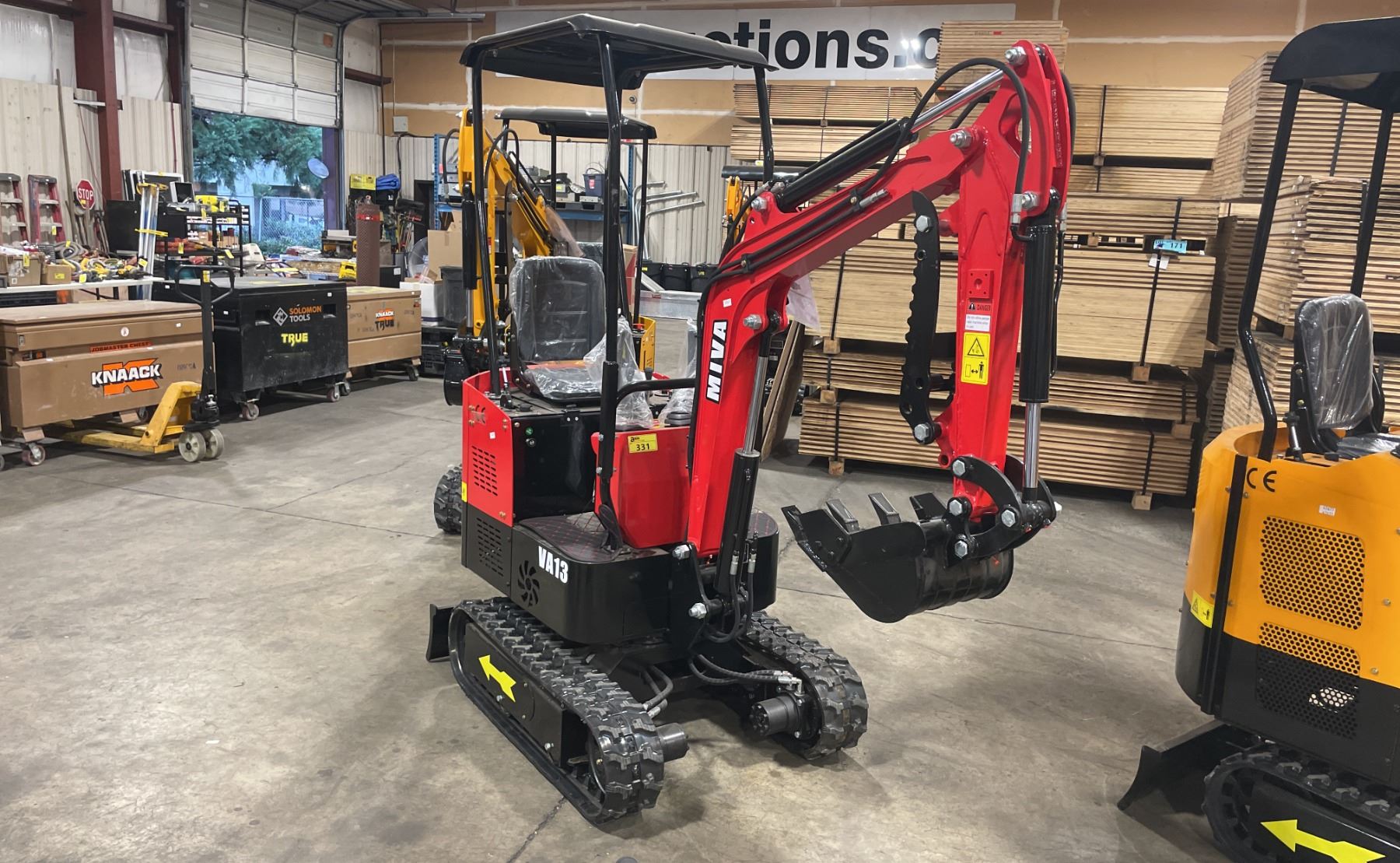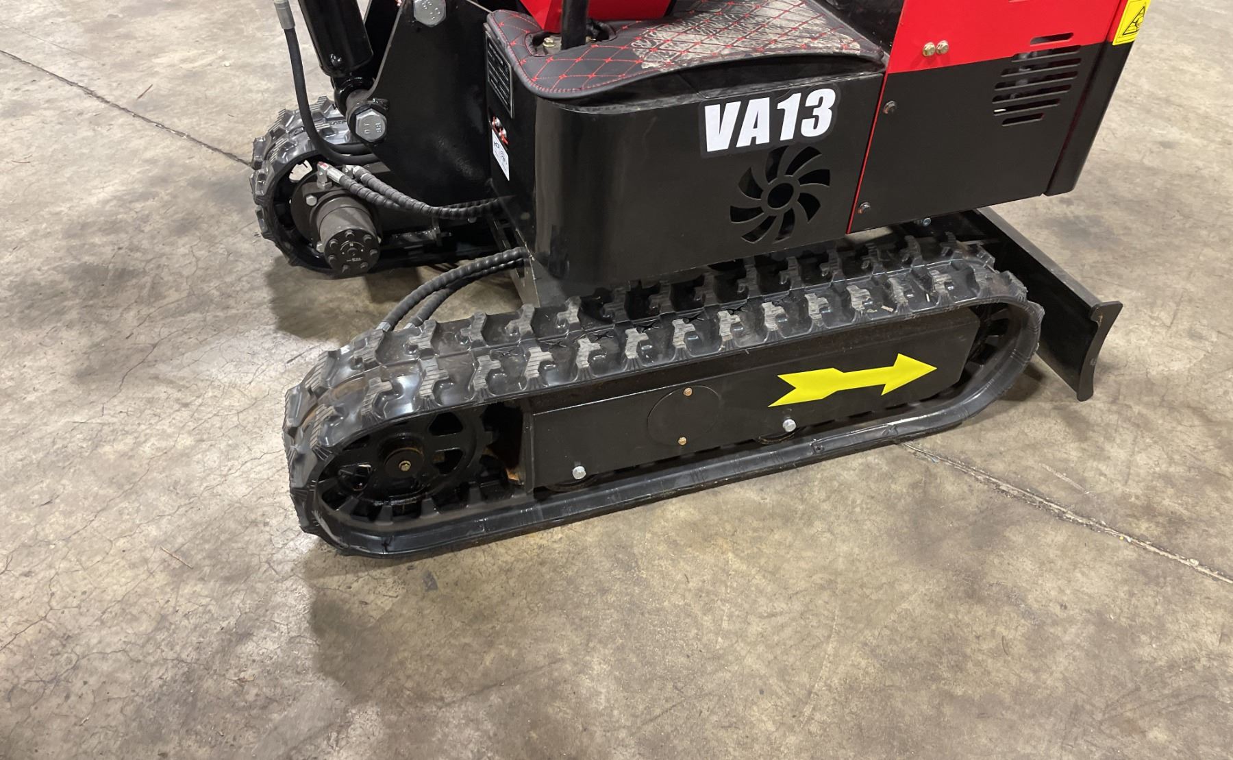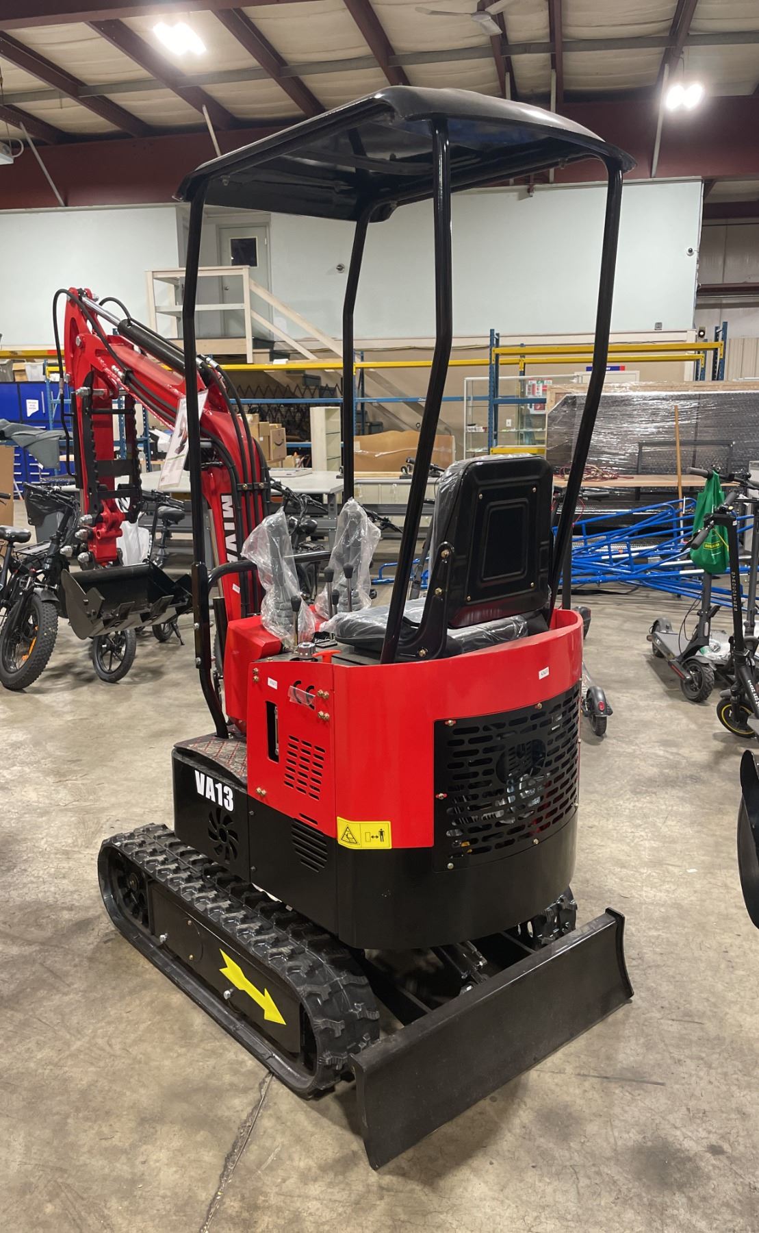 MIVA VA13 2025 RED 13.5 HP GAS POWERED RUBBER TRACK MINI EXCAVATOR WITH ATTACHED DIGGING BUCKET, GRADER BLADE, STATIONARY CLAW, MINI TOOL KIT & KEYS *MEETS CANADIAN EMISSIONS CONTROL REGULATIONS* *MUST HAVE PROPER EQUIPMENT TO TRANSPORT*