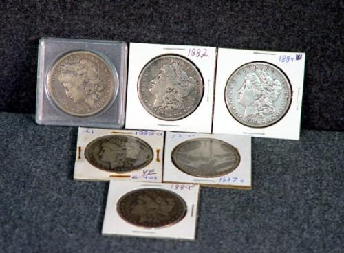 MORGAN SILVER DOLLARS, 1889-O, 1887-O, 1885-O, 1884, 1882, 1879, 6X THE MONEY