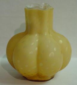 , bulbous, melon ribbed with straight neck, butterscotch yellow outer layer, opaque inner layer, clear rim, height 7 ¾", American, circa 1880.