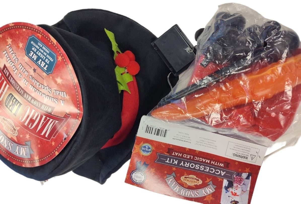 INCLUDES: MAGIC LED HAT, CLOTH SCARF, PIPE, CARROT NOSE, 2 EYES, 3 BUTTONS, 7 DOTS FOR A SMILE