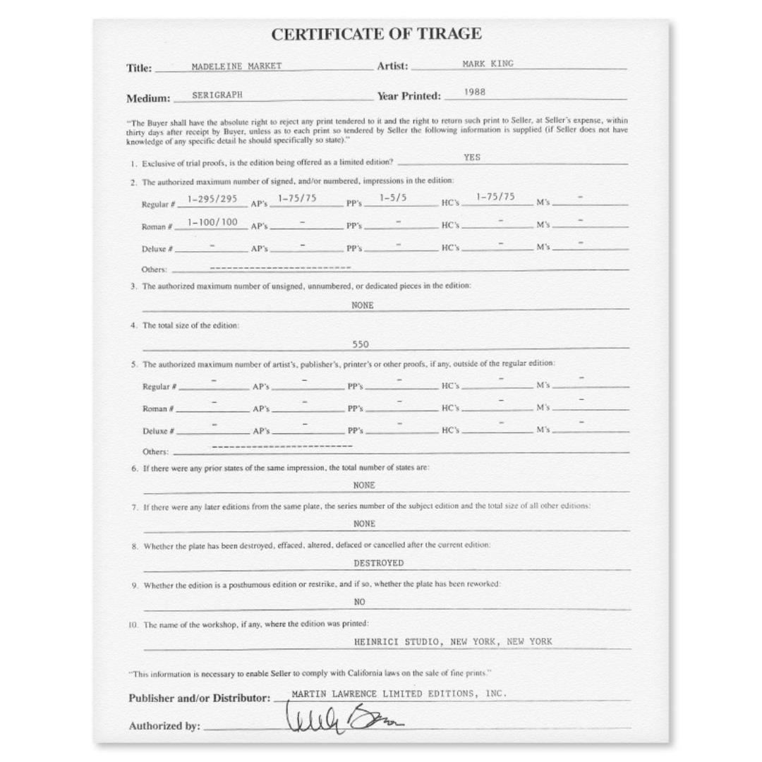 "Madeline Market" is a limited edition serigraph on paper by Mark King (1931-2014). Hand signed and numbered, this piece comes with a letter of authenticity and measures approximately 40.5" x 30" (image).