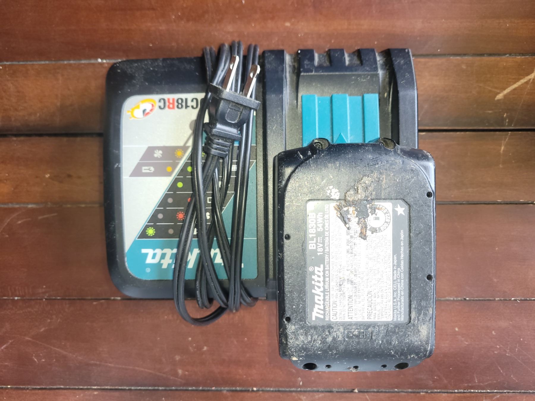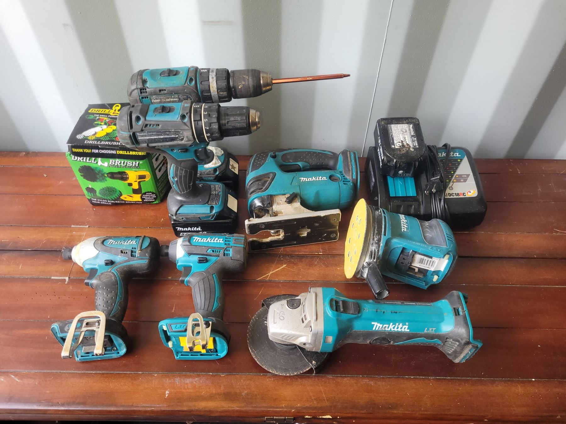 Assortment of Makita cordless power tools with battery and charger. Pickup at 10 am