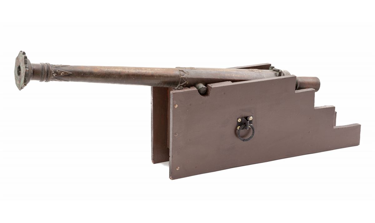 Malaysian Bronze Lantaka, as used on merchant vessels traveling the South China Seas, ca. 1760-1820, measuring approx. 45'' overall, 3'' dia. at base, and approx. 2'' at muzzle; more dia. measures @ 1.25'', with flared end very nearly 5'' in dia. Nicely marked with marker's cartouches and clear touch hole. Condition is fine with even overall patination, and one small area of repair approx. 12'' from muzzle on right side. Early example were mfg'd in foundries in Malacca and Pahang; later models from foundries in the Netherland and Portugal. On modern hobbyist made stand. Est.: $1,800-$2,400.